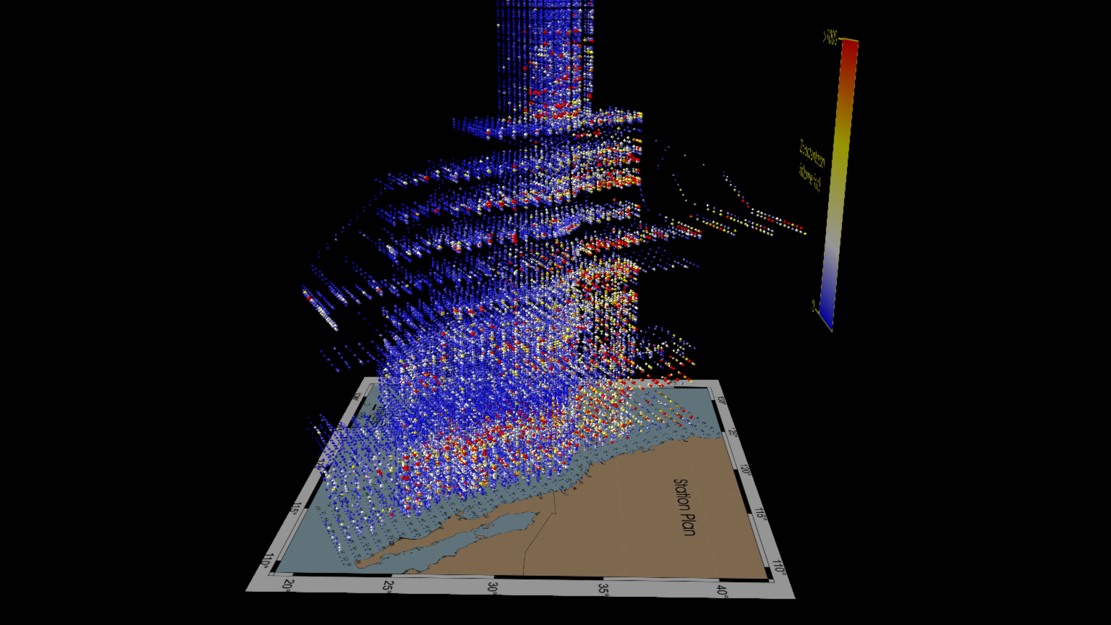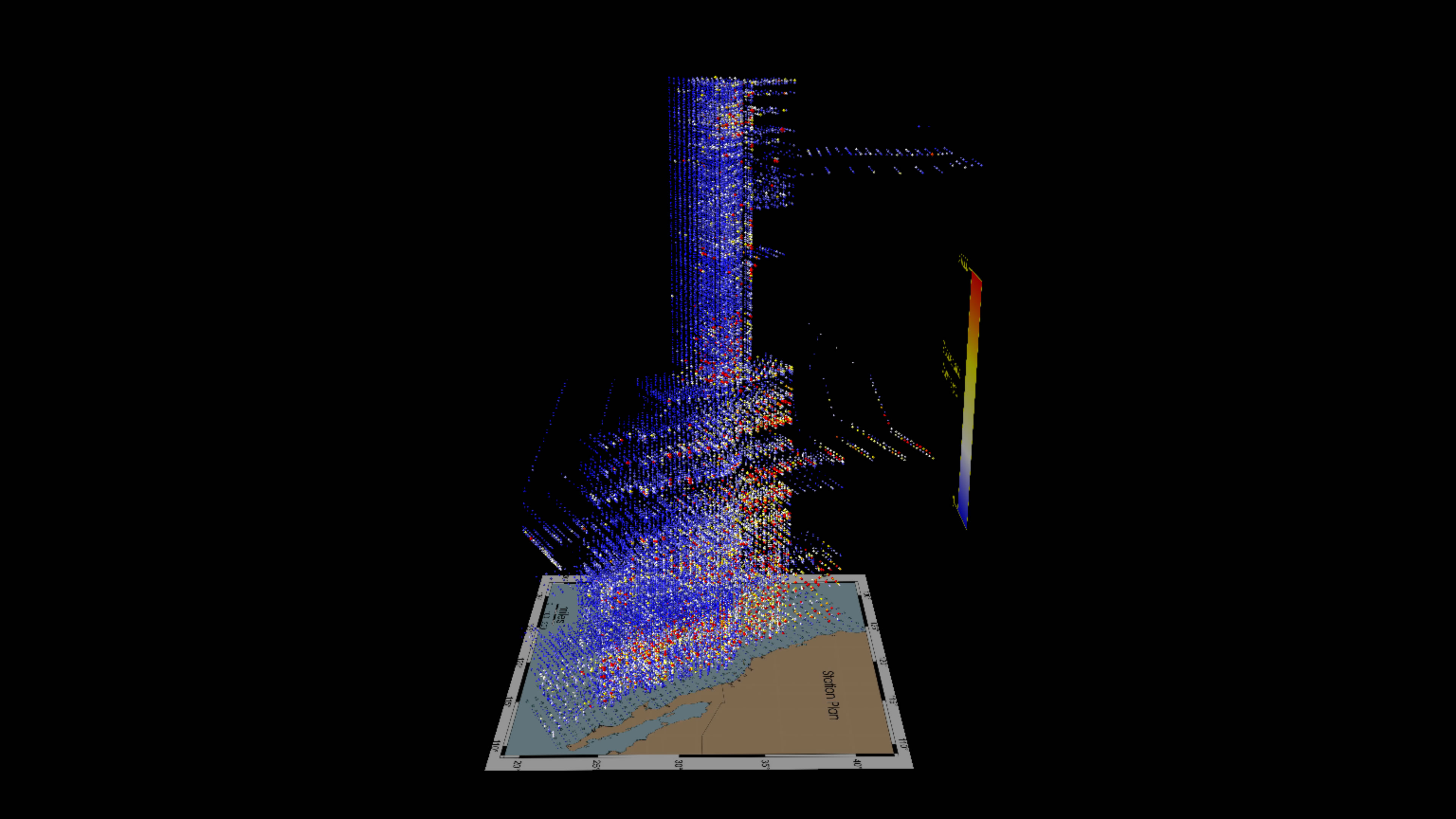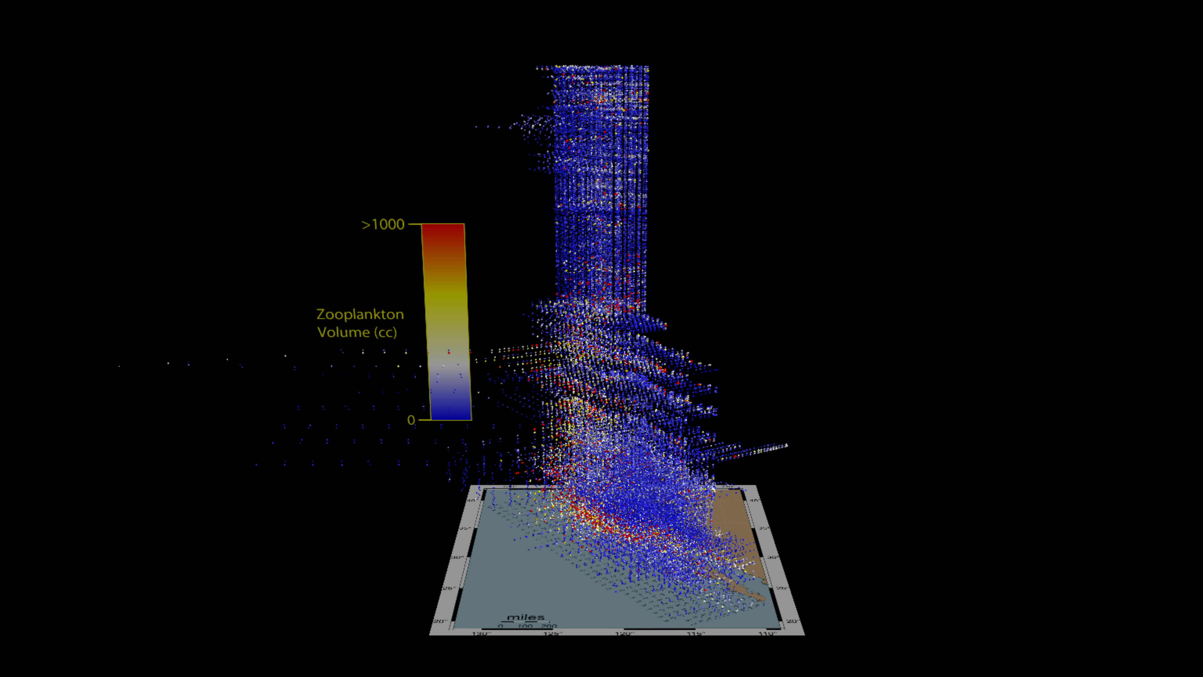 This scale variation uses the raw values for zooplankton biomass with an added scale factor to adjust object size to a reasonable value. This scale variation results in spatiotemporal regions of high biomass becoming more obvious.