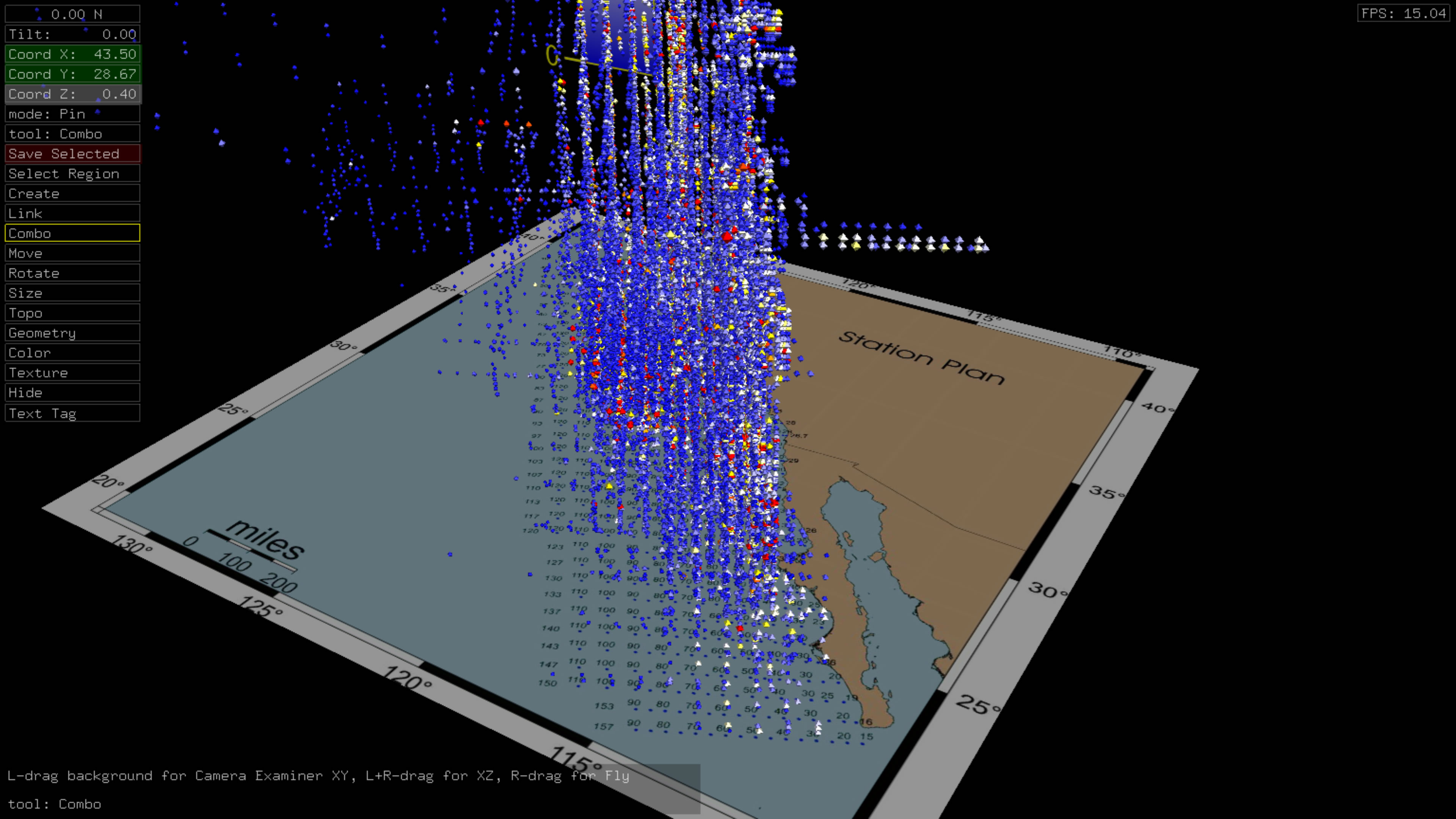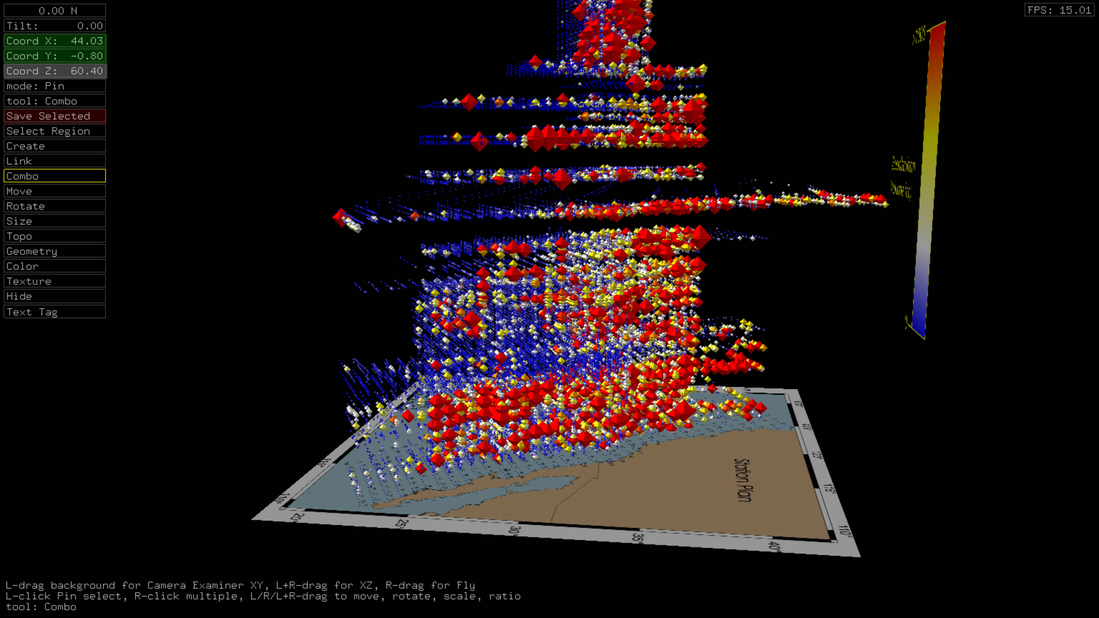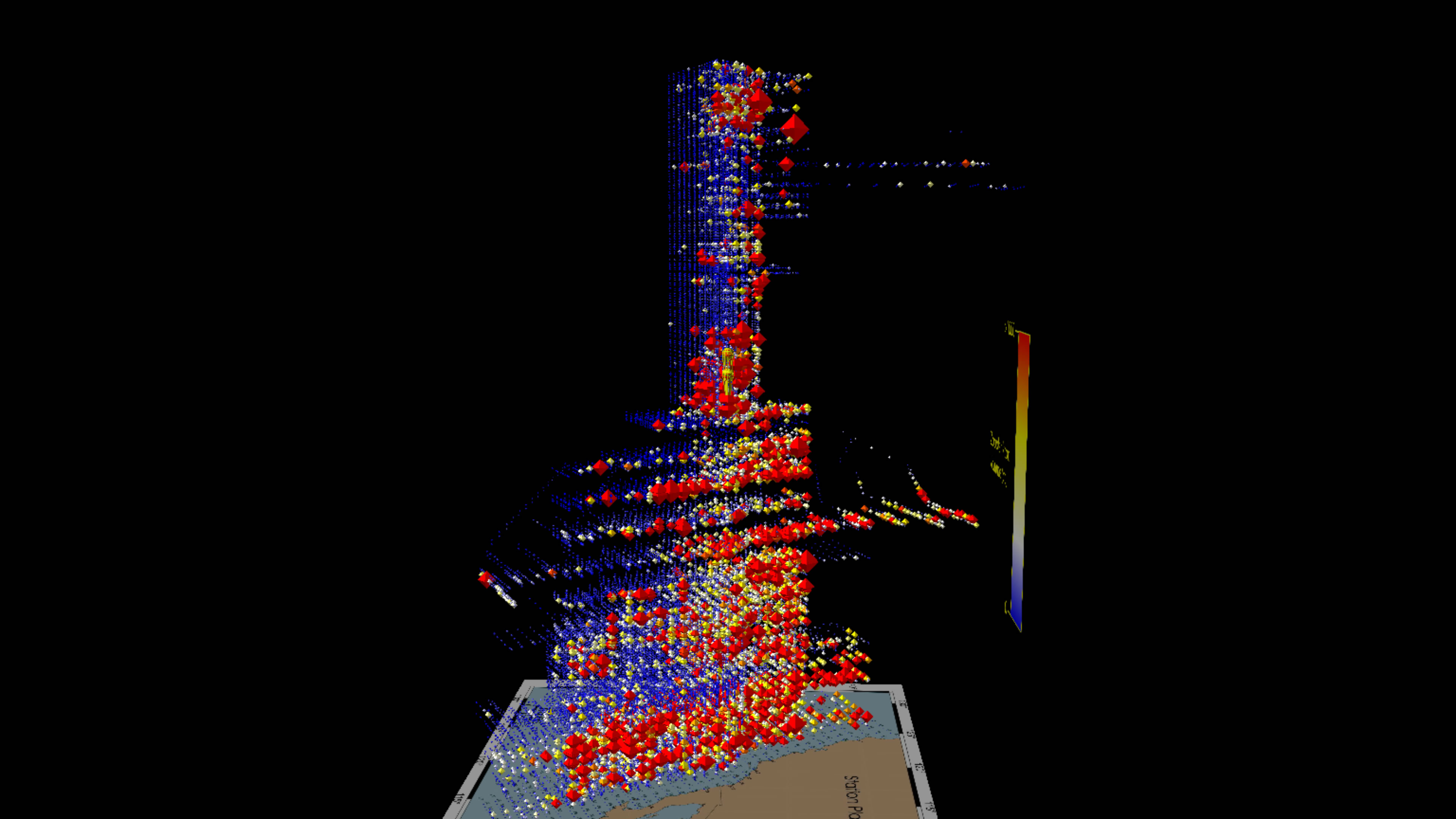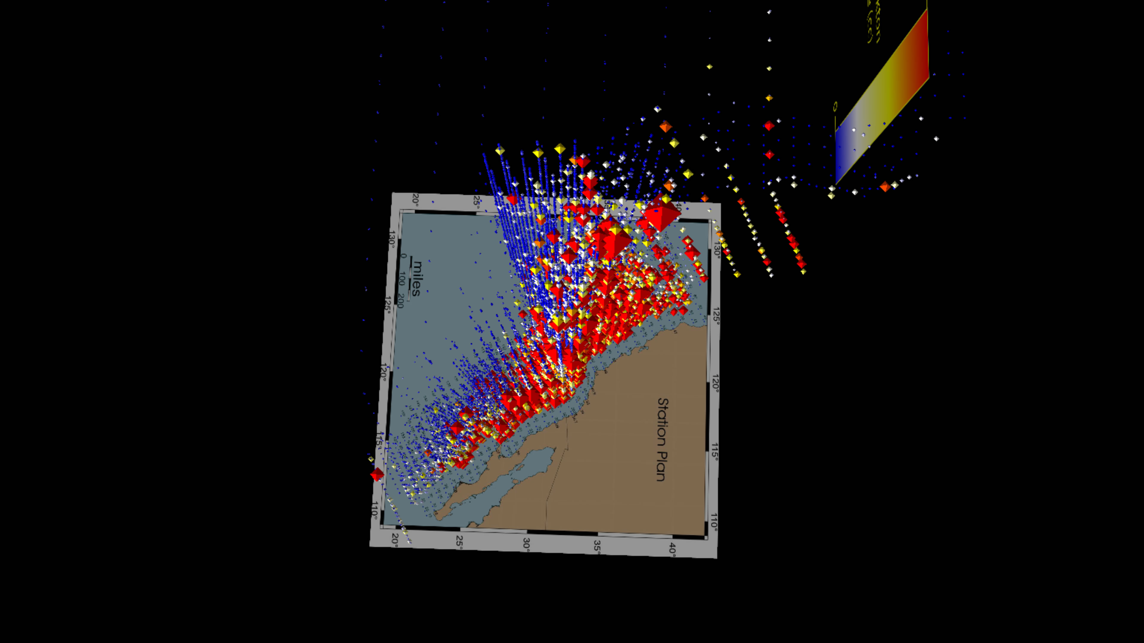 This scale variation uses the raw values for zooplankton biomass with an added scale factor to adjust object size to a reasonable value. This scale variation results in spatiotemporal regions of high biomass becoming more obvious.