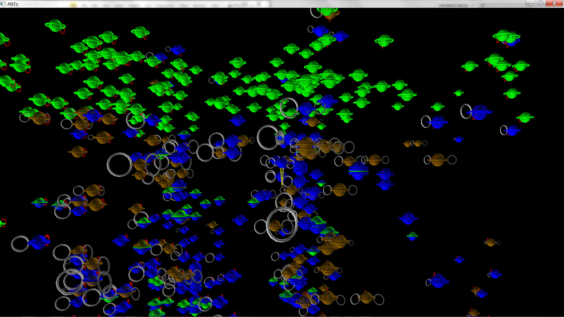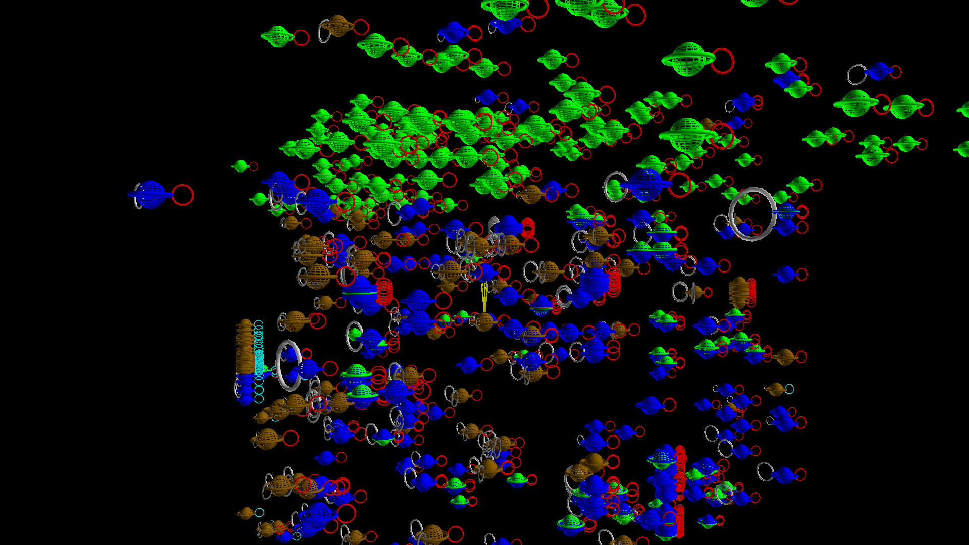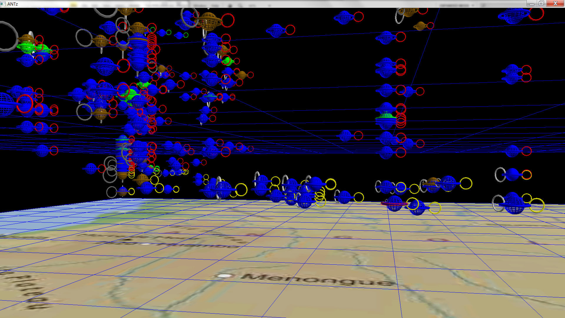 In the above images, the thick green layer at the top of this dataset represents events of type 3 around 2001-2002, the most recent data available from this set. Note also the effect viewing angle has on what can be observed. in the left image, we can see numerous light and dark gray toroids (casualties), but the red toroids representing conflict 2310 are barely visible. With a 60 degree rotation in view, the image on the right shows a significant increase in red toroids which are visible, and a significant reduction of the light and dark gray toroids visibility.