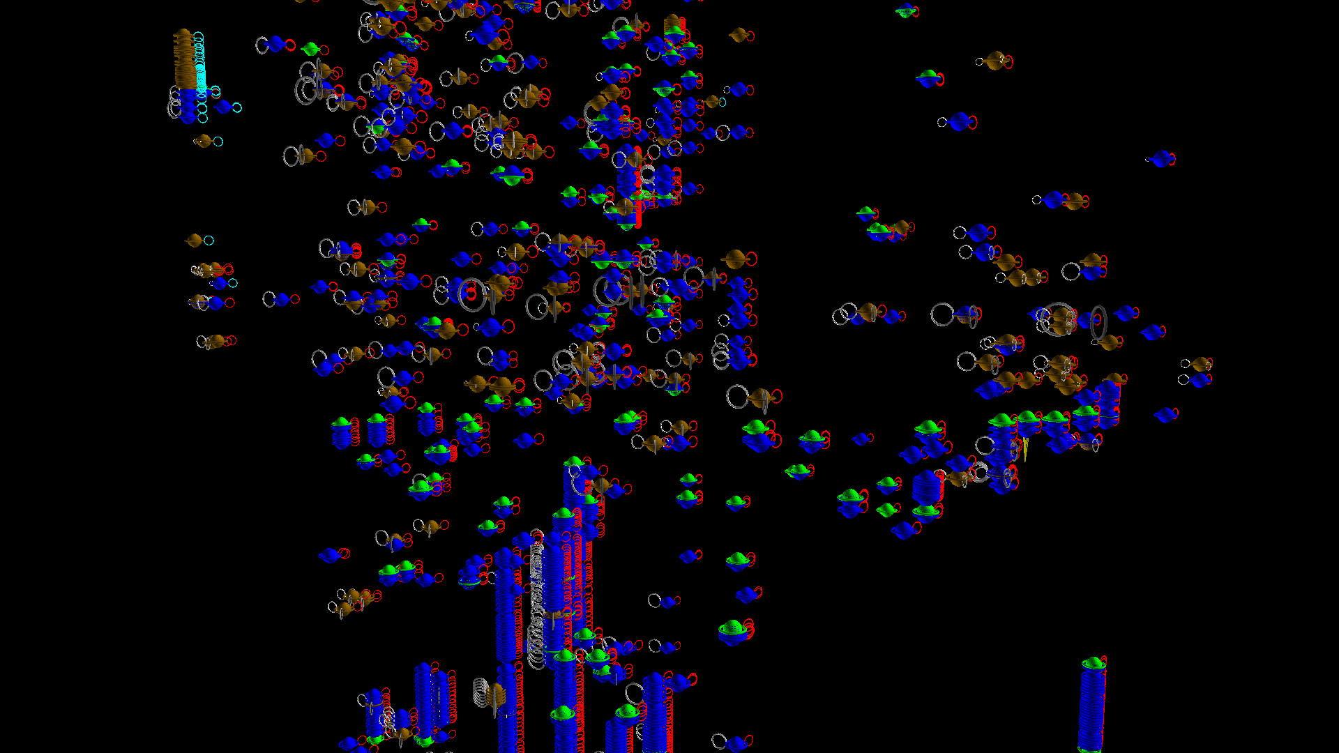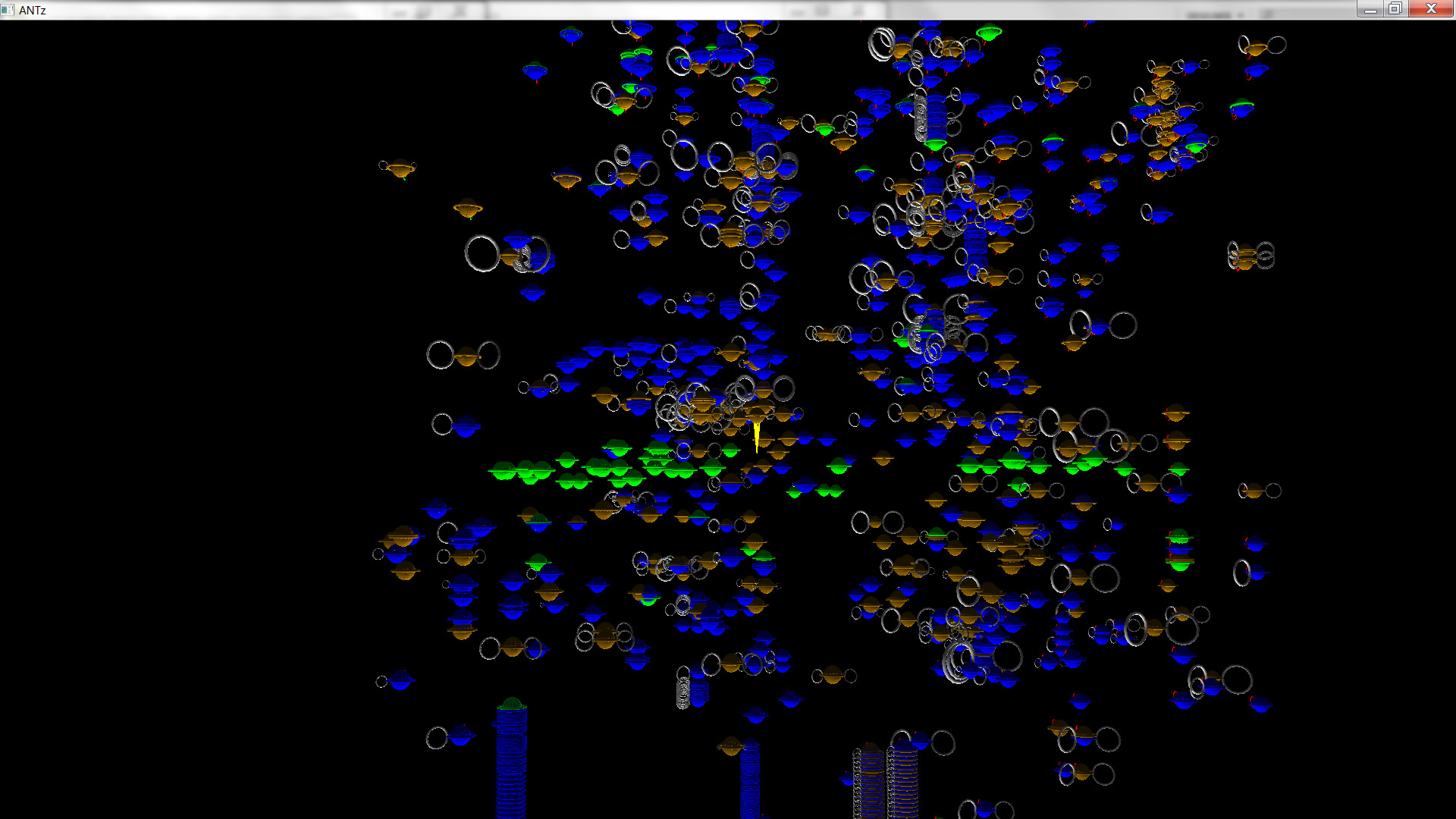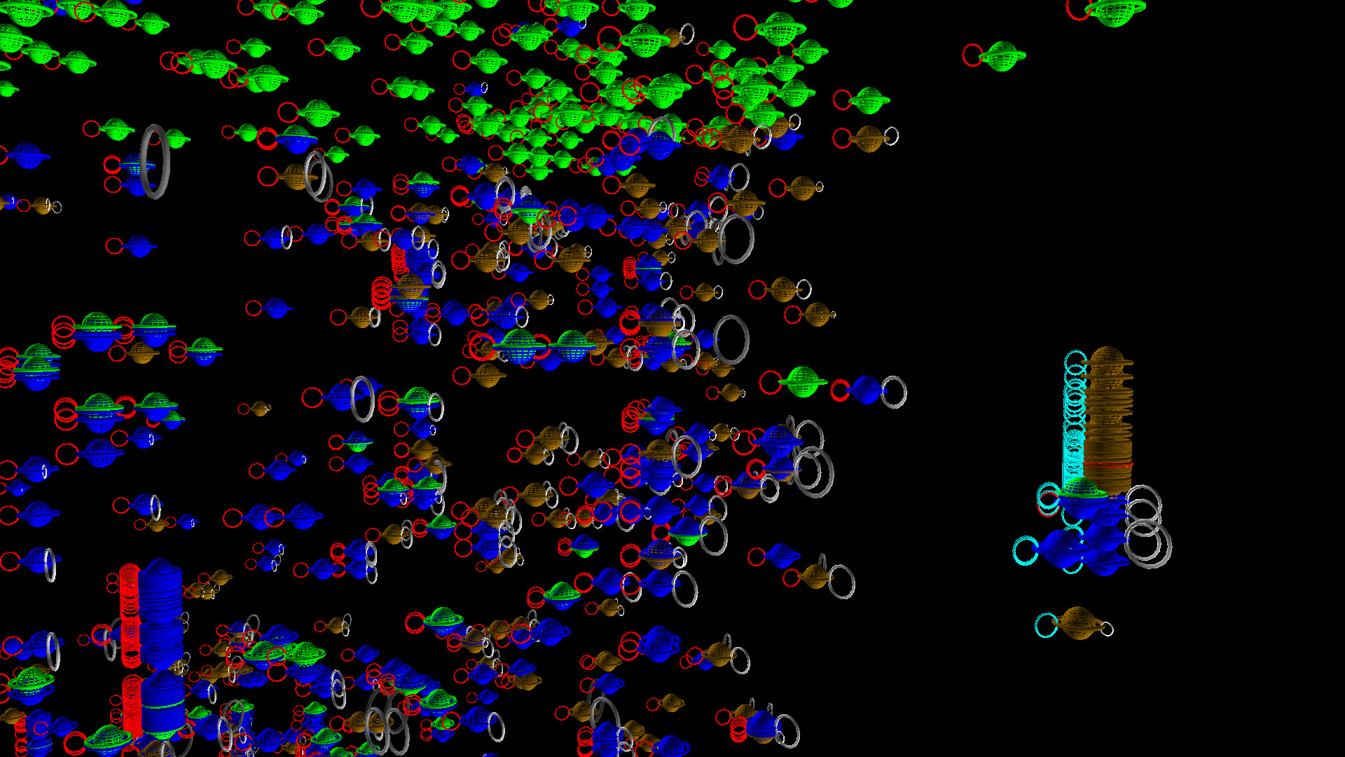 The images above are two different views of the uppermost data in the dataset for the years 1995-2002. On the left, in the upper left corner, we see a series of light cyan toroids representing an isolated conflict, #1660.