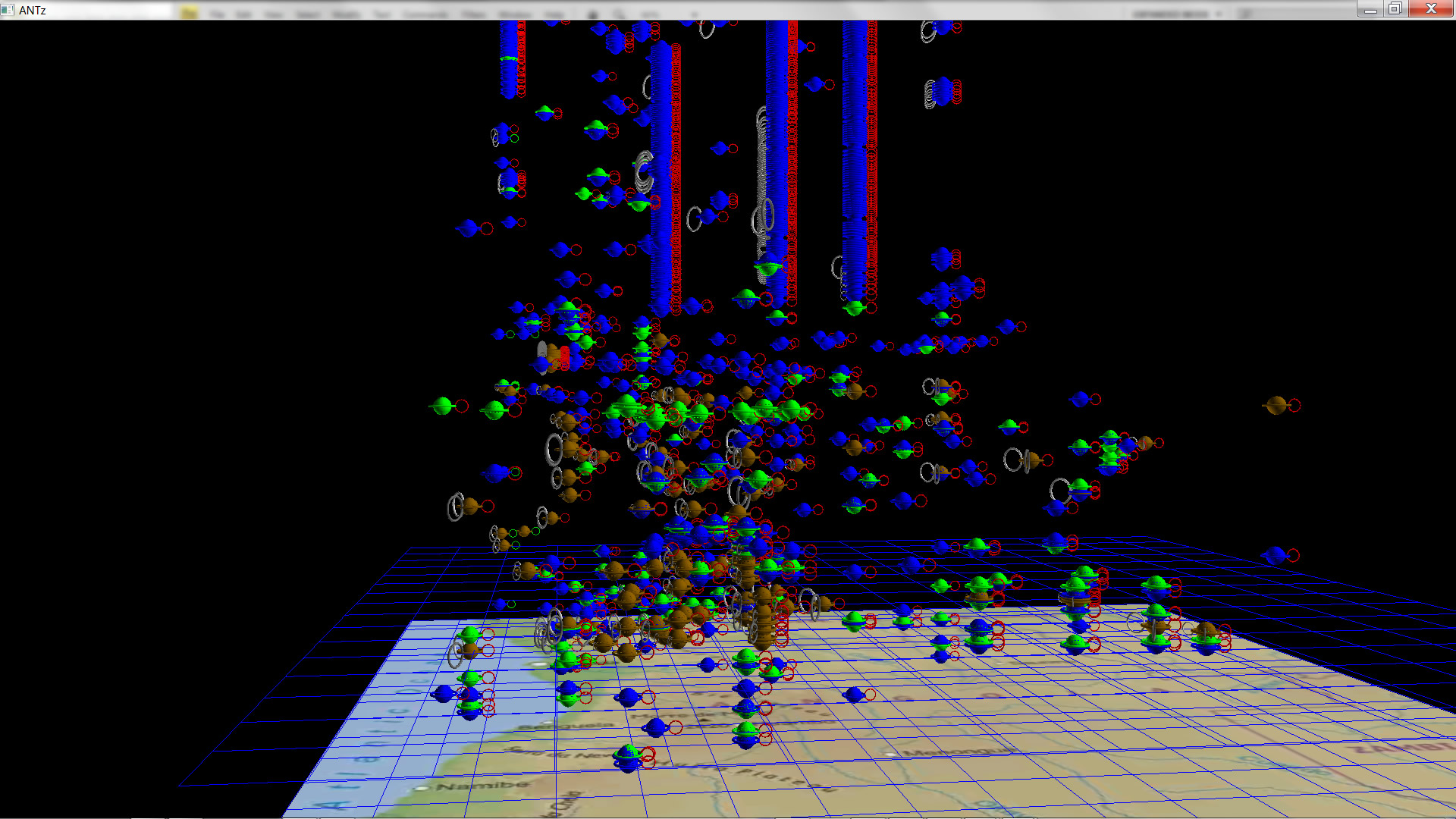 Note another feature in the left image above: on the right and roughly in the middle there is a group of event type 3's (bright green) occuring roughly during the same time, followed by numerous event type 7's, i.e. the brown toroids above the row of green. This may be one example of atrocities following an event type 3 that Jen was looking for.