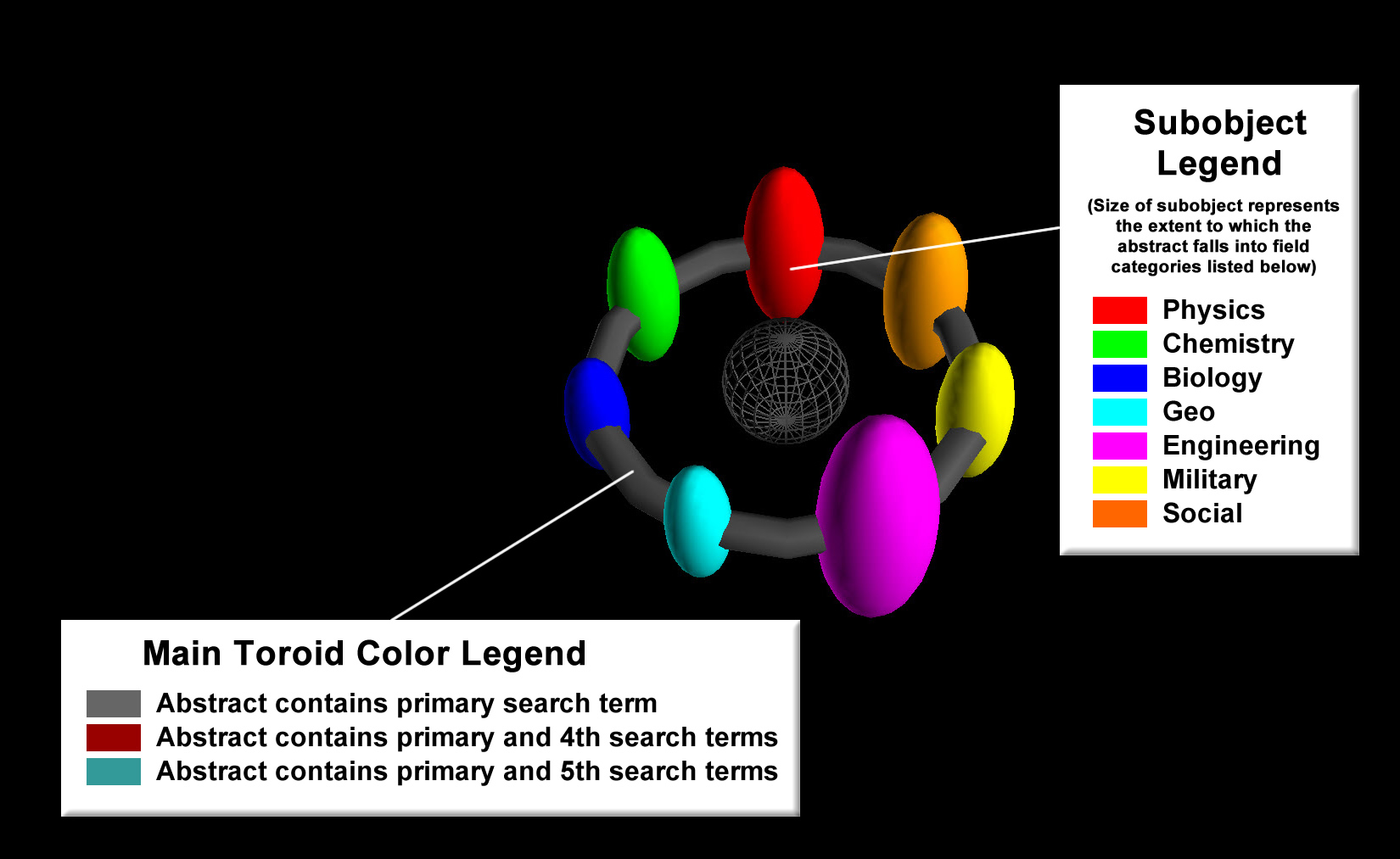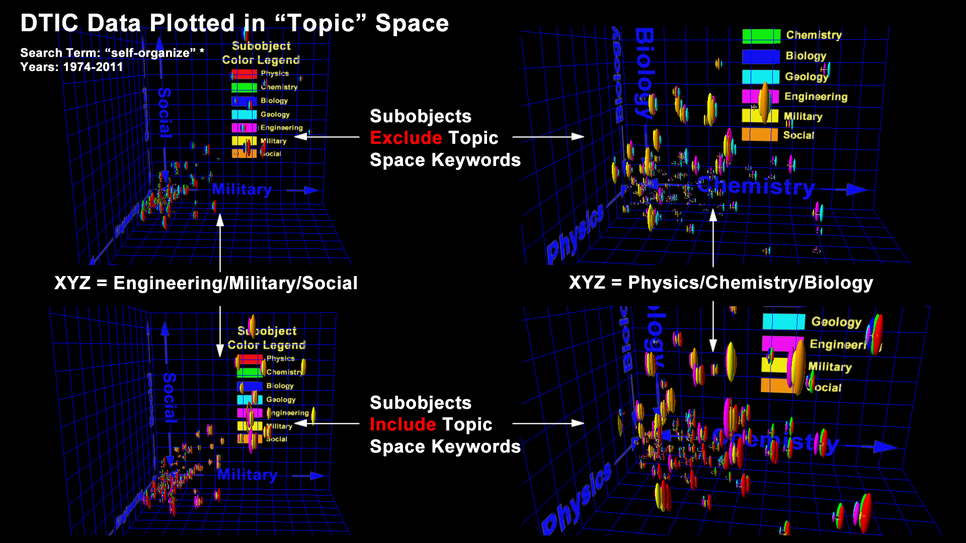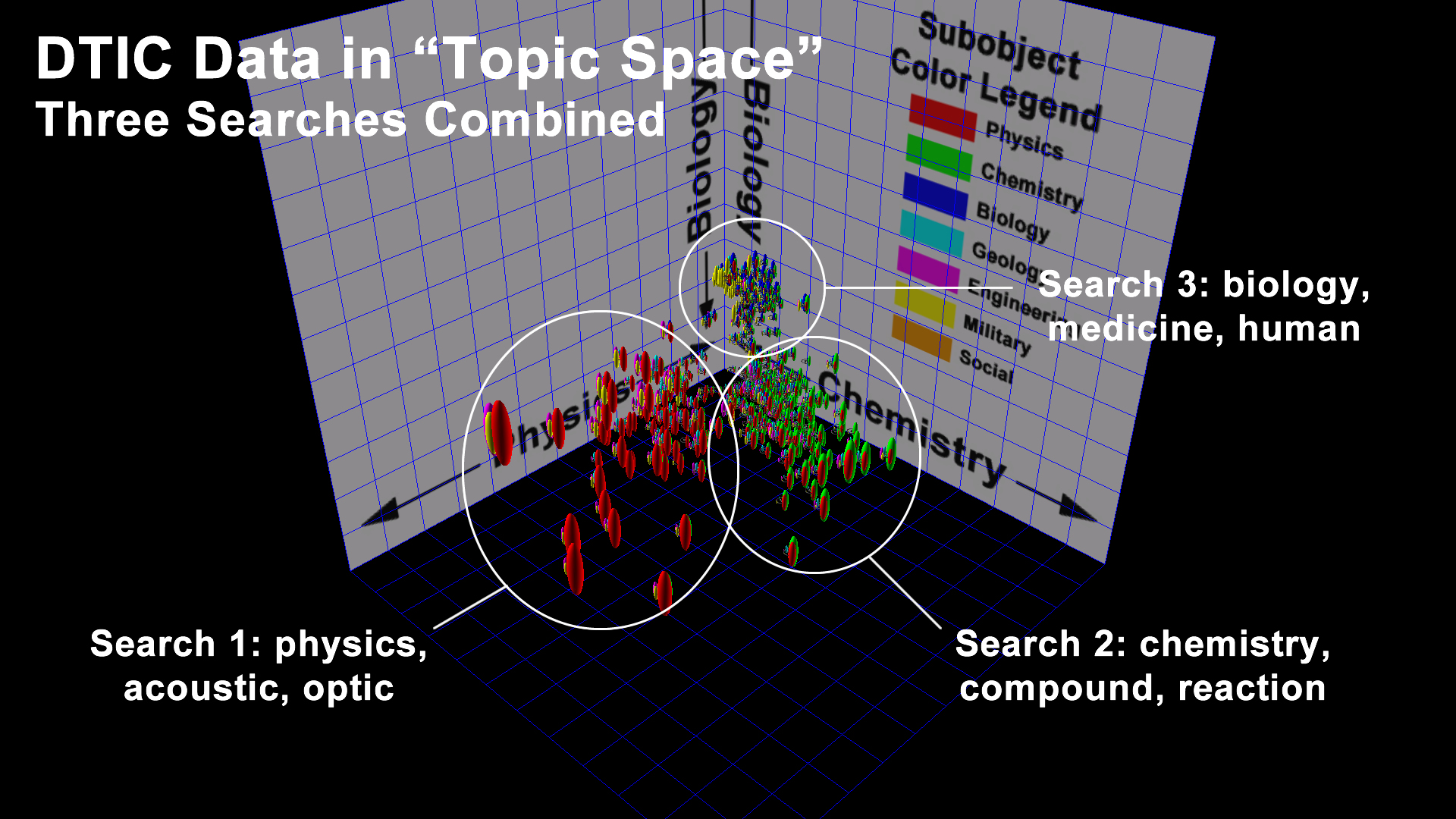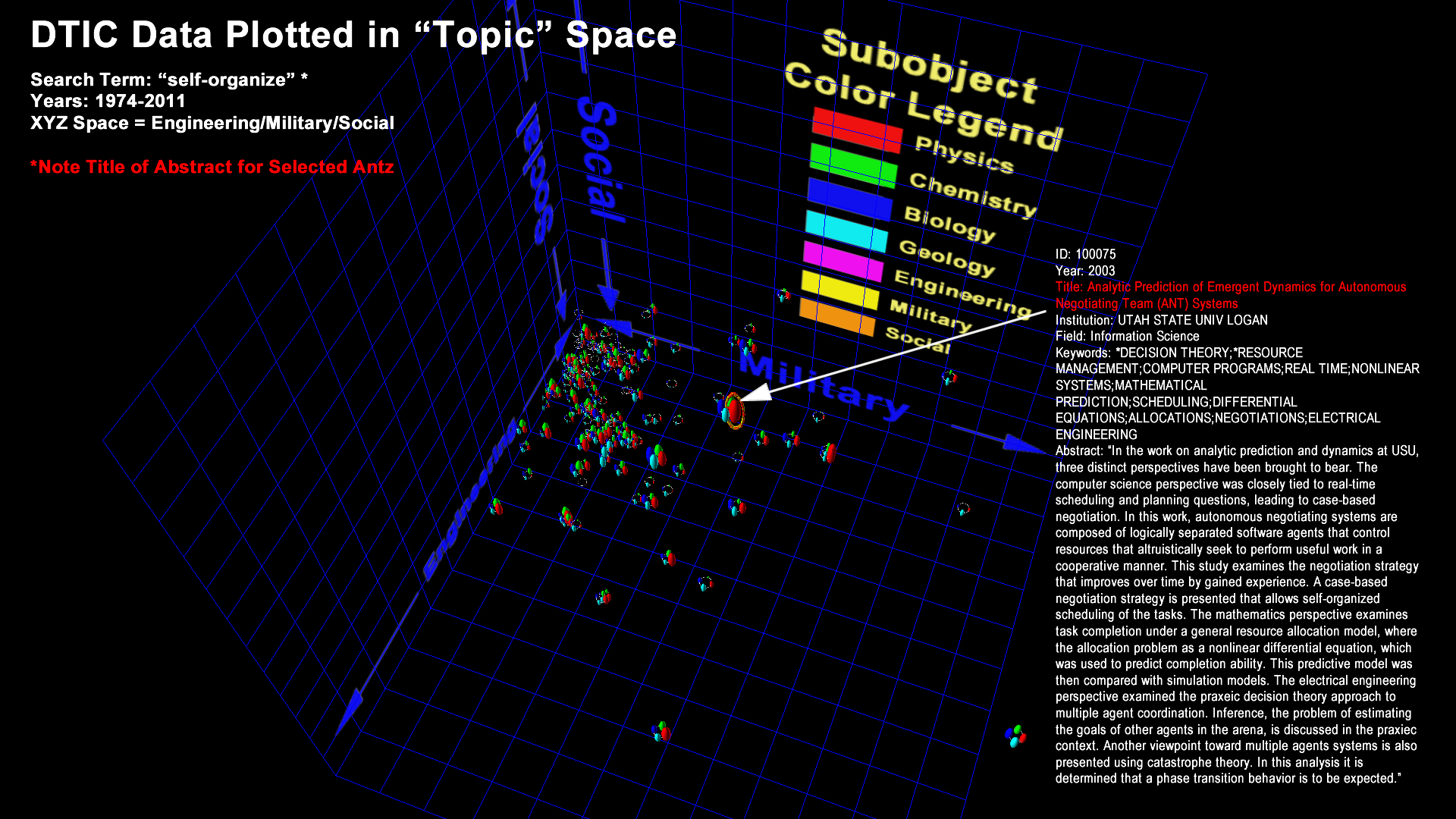I have created a form (send a request to access it) allowing the user to enter from 1 to 3 search terms which creates a database query returning all articles containing each of the 1 to 3 terms (using an AND search, not an OR search to keep the results small). I then "dot" the abstracts for each of the returned articles with the seven "core word vectors" to measure the extent to which the article falls into the 7 "core" keyword categories. I then render the resulting objects in 3d space where the xyz axes represent one of two possible "topic spaces". For the first topic space, the x axis represents the "physics-like" properties of the article, the y axis measures the "chemistry-like" nature of the article, and the z axis measures the "biology-like" nature of the article. For the second topic space, the x axis represents the "engineering-like" properties of the article, the y axis measures the "military-like" nature of the article, and the z axis measures the "social-like" nature of the article. I could have used any 3 of the 7 "core" keywords for the xyz axes, I do plan to explore these, and add that as an option to the form.