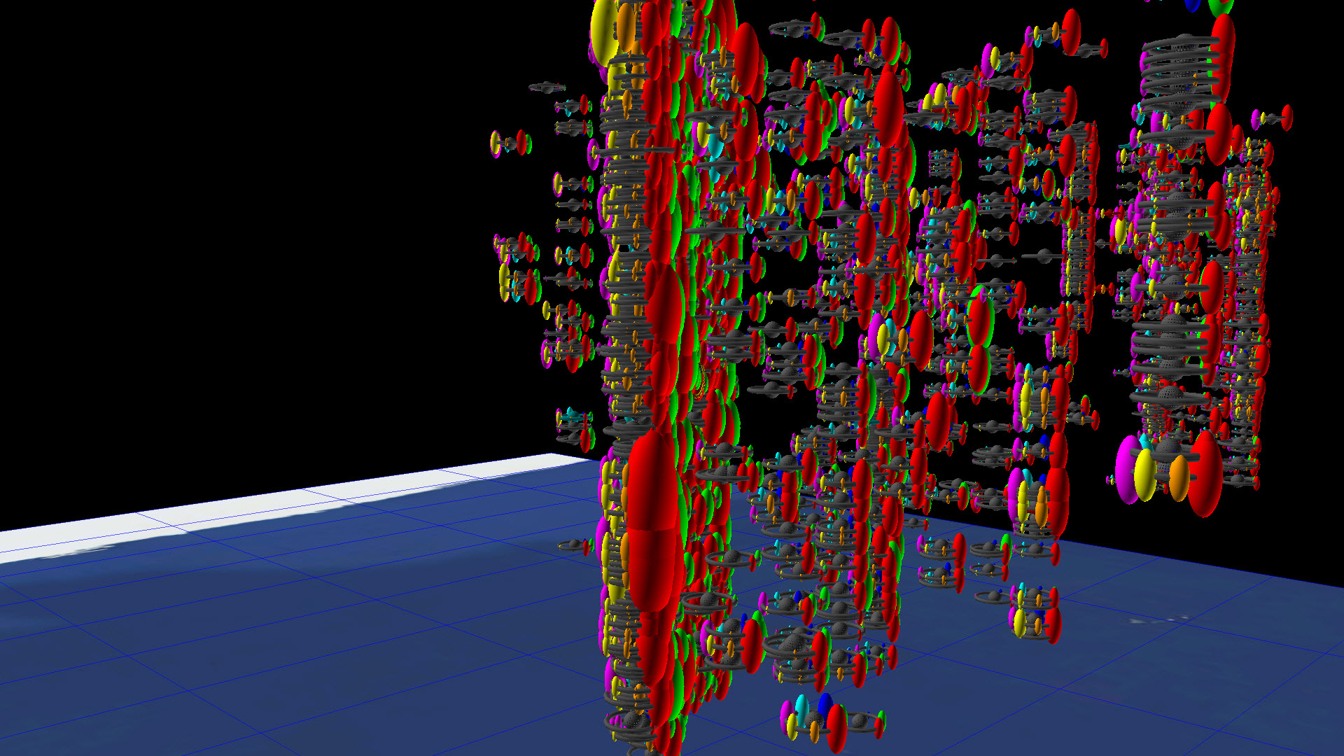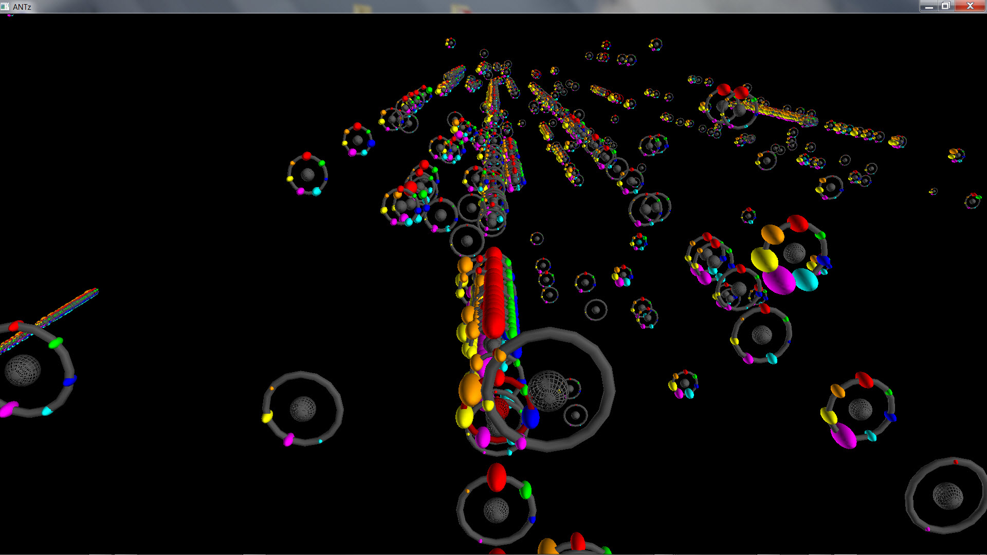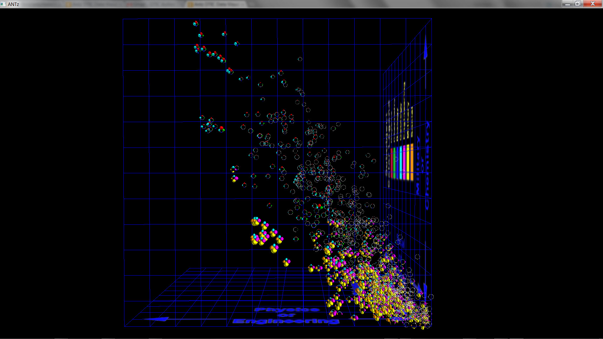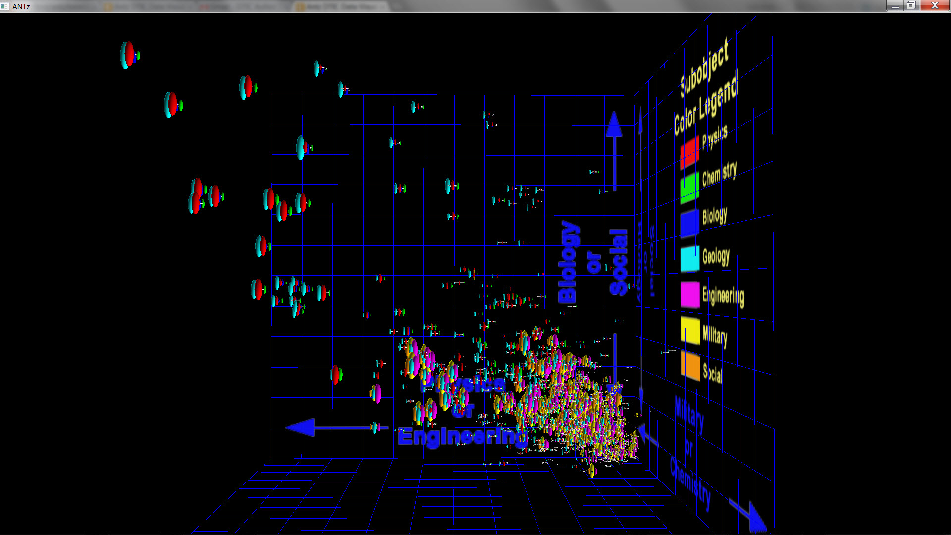 I have created a form (send a request to access it) allowing the user to enter from 1 to 3 search terms which creates a database query returning all articles containing each of the 1 to 3 terms (using an AND search, not an OR search to keep the results small). I then "dot" the abstracts for each of the returned articles with the seven "core word vectors" to measure the extent to which the article falls into the 7 "core" keyword categories. I then render the resulting objects in 3d space where the xyz axes represent one of two possible "topic spaces". For the first topic space, the x axis represents the "physics-like" properties of the article, the y axis measures the "chemistry-like" nature of the article, and the z axis measures the "biology-like" nature of the article. For the second topic space, the x axis represents the "engineering-like" properties of the article, the y axis measures the "military-like" nature of the article, and the z axis measures the "social-like" nature of the article. I could have used any 3 of the 7 "core" keywords for the xyz axes, I do plan to explore these, and add that as an option to the form.