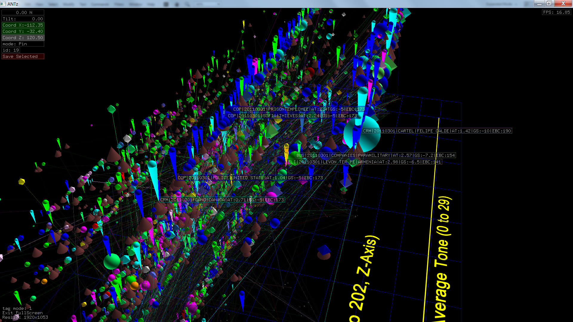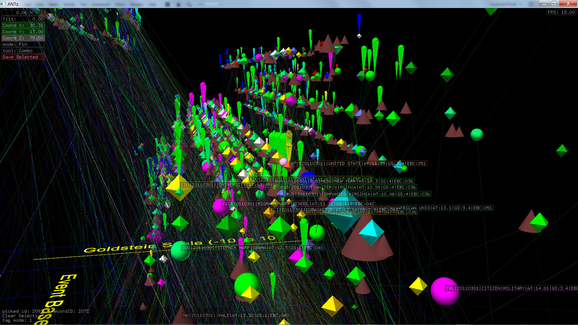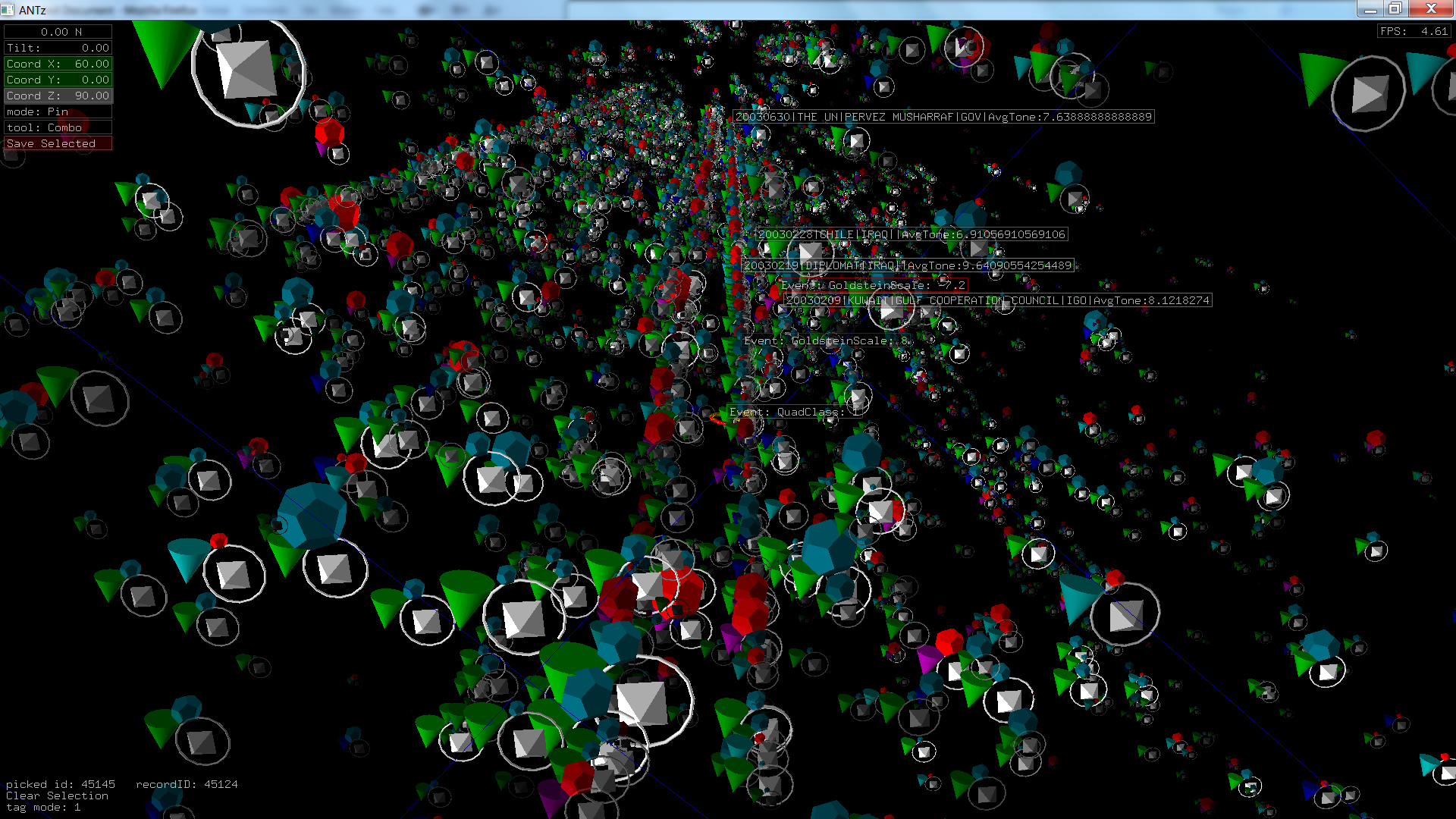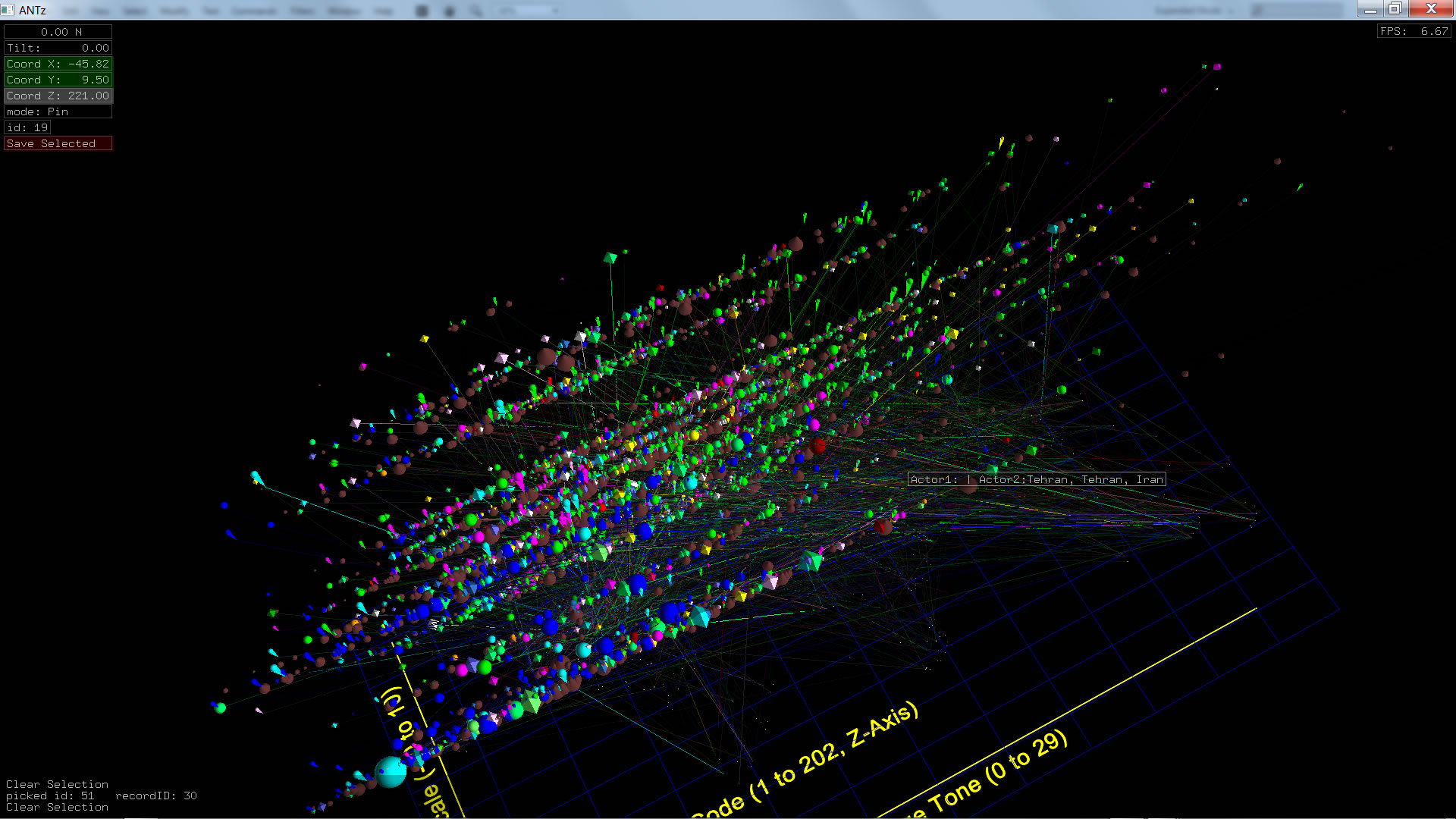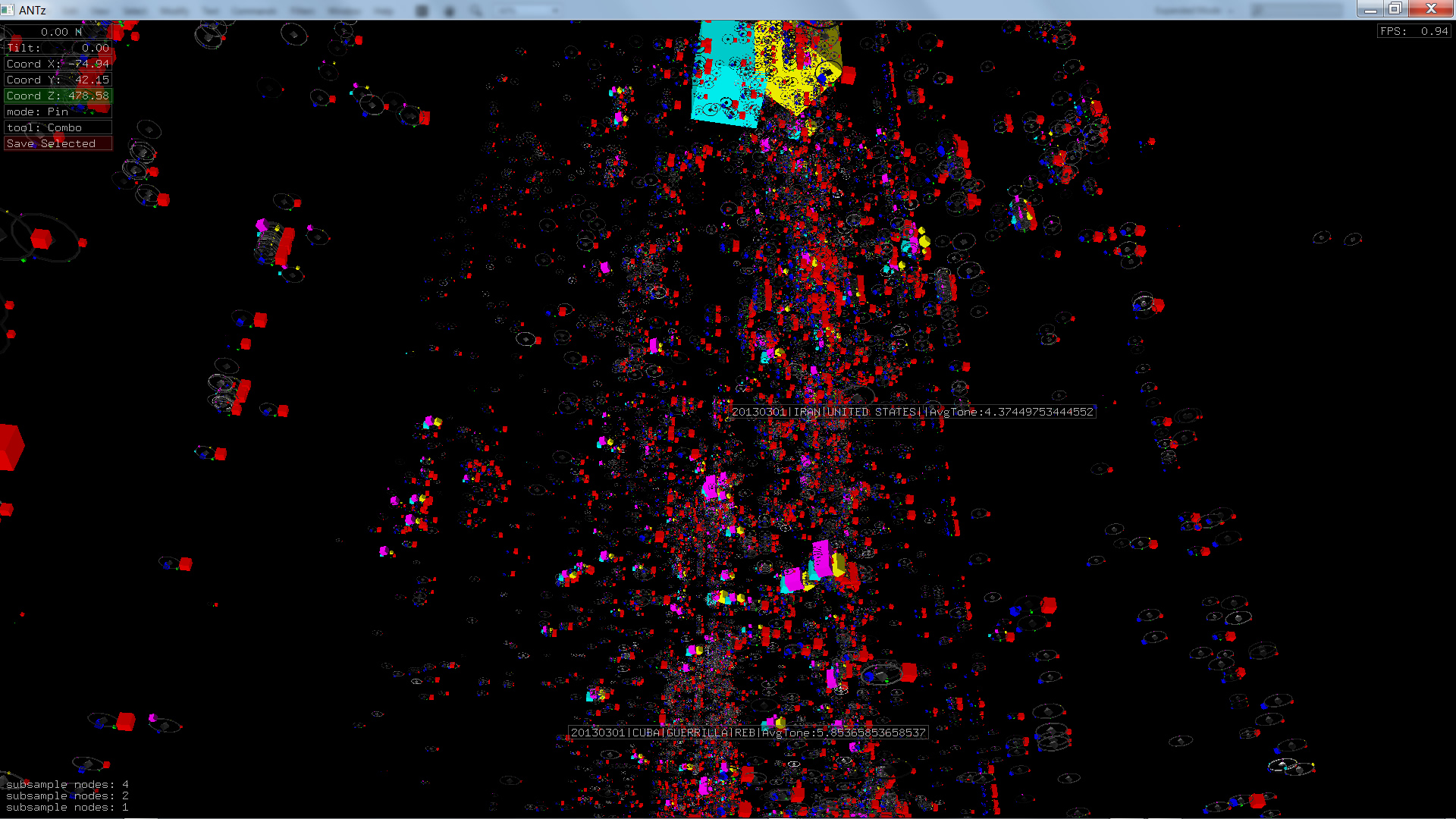 Color corresponds to Actor1Type1Code (NOTE: the Actor1Type1Code is also the first item in the object Labels). Legend TBD.