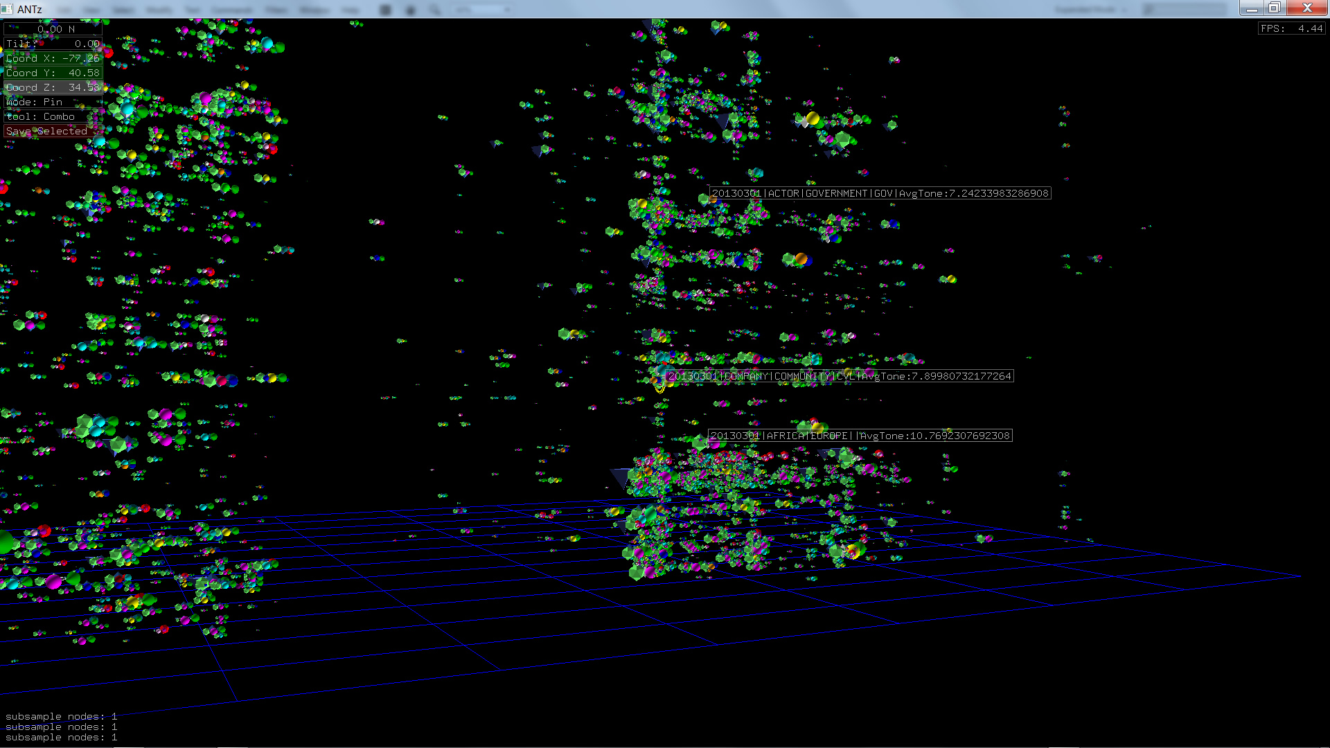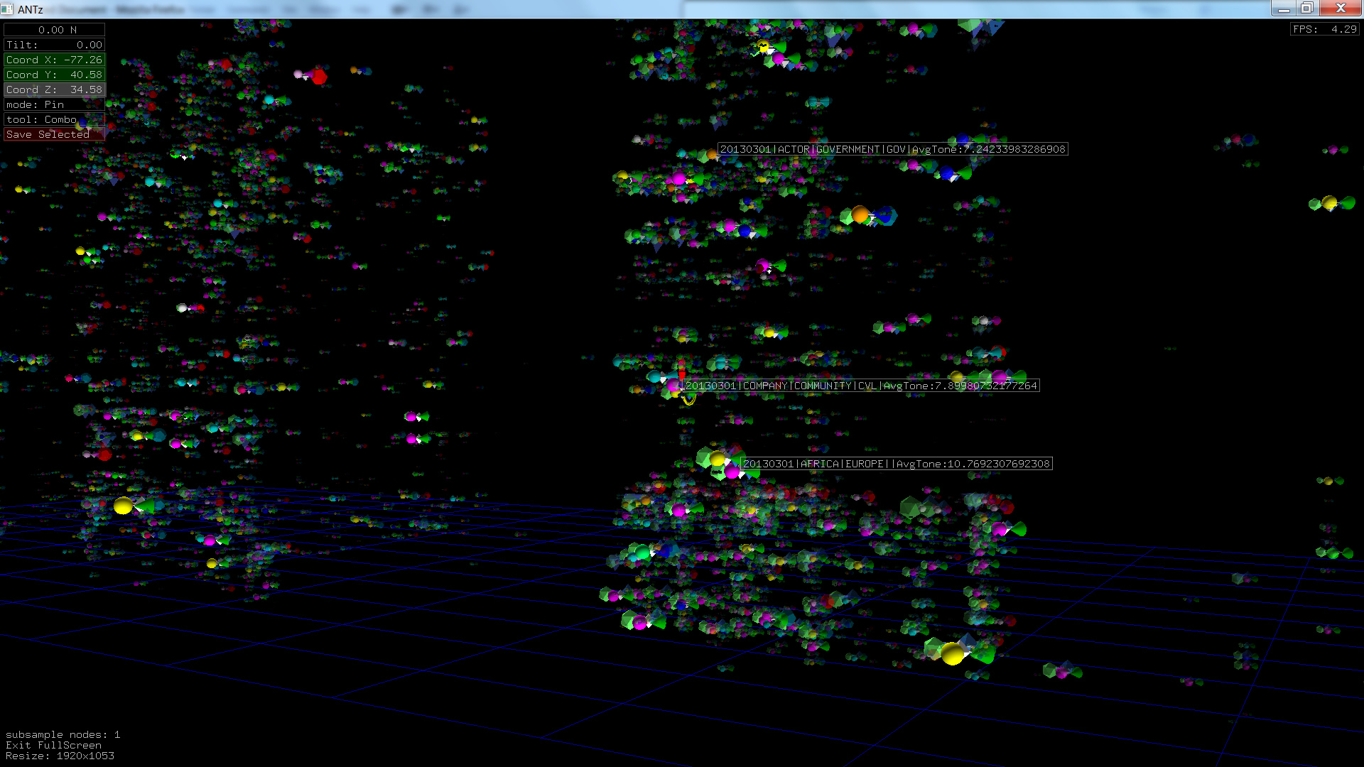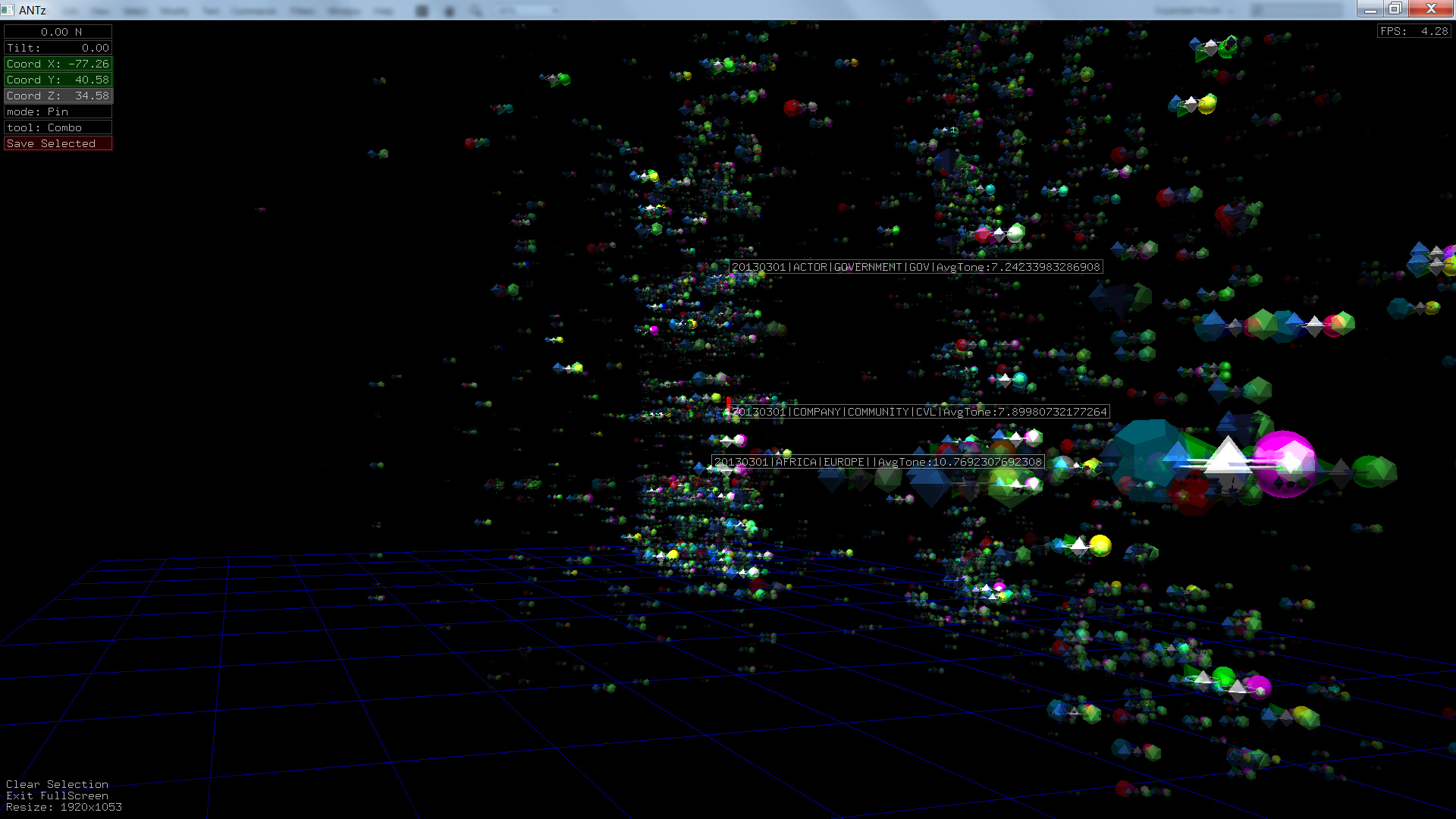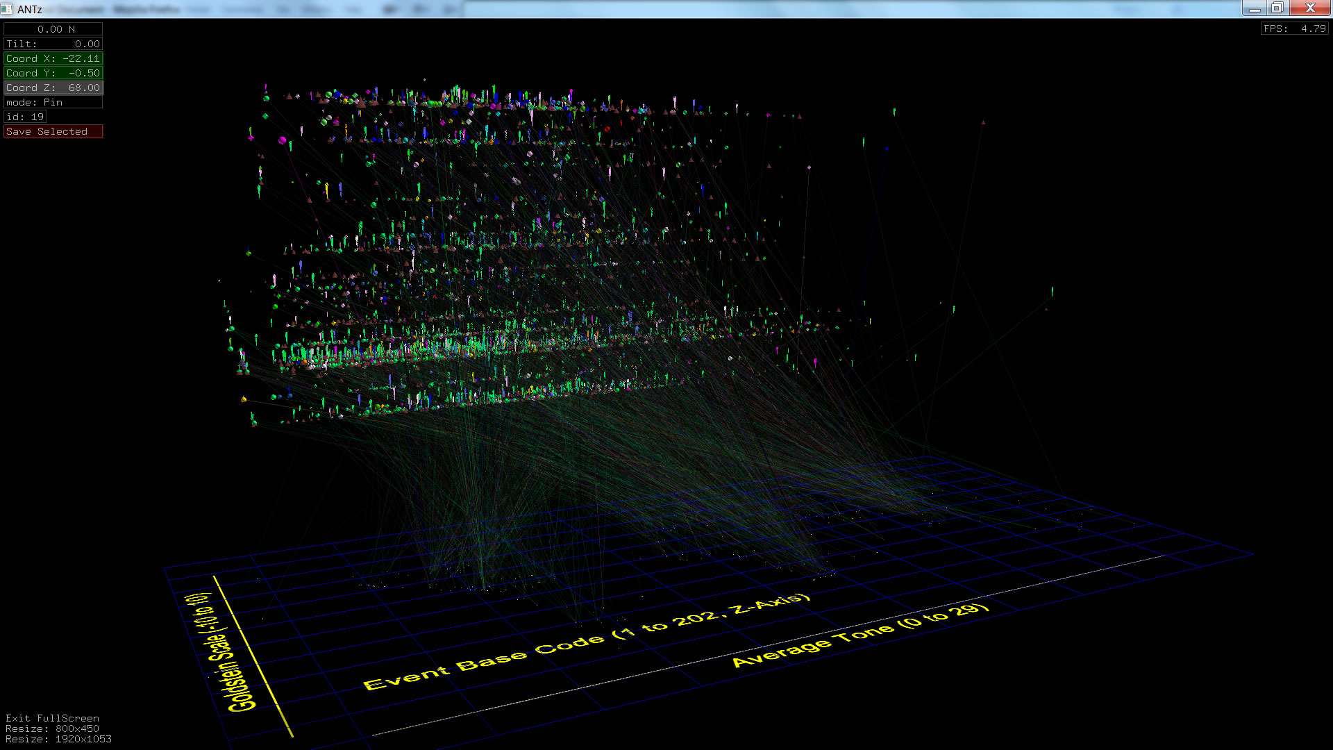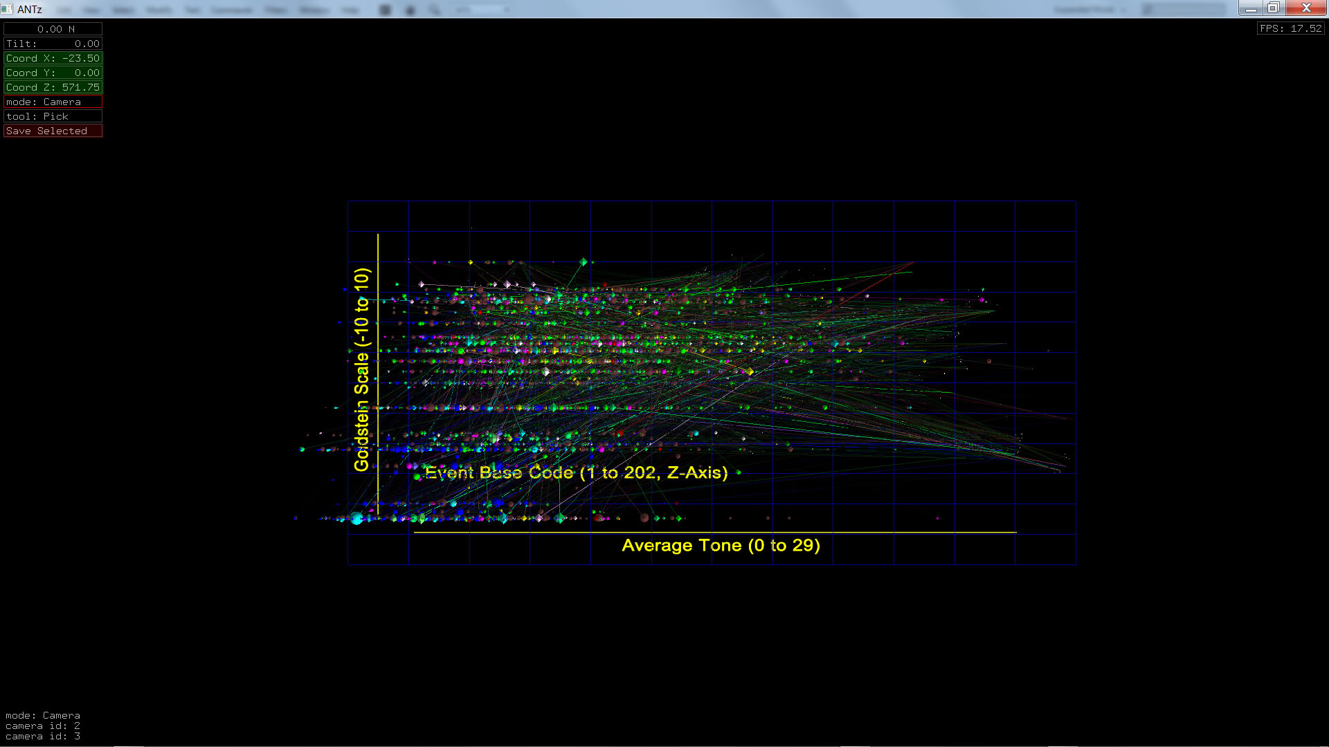 Color corresponds to Actor1Type1Code (NOTE: the Actor1Type1Code is also the first item in the object Labels). Legend TBD.