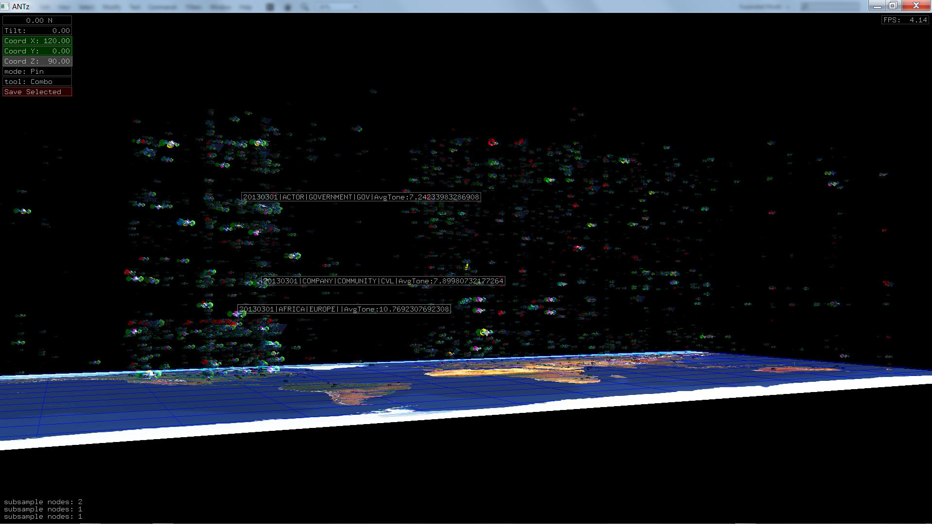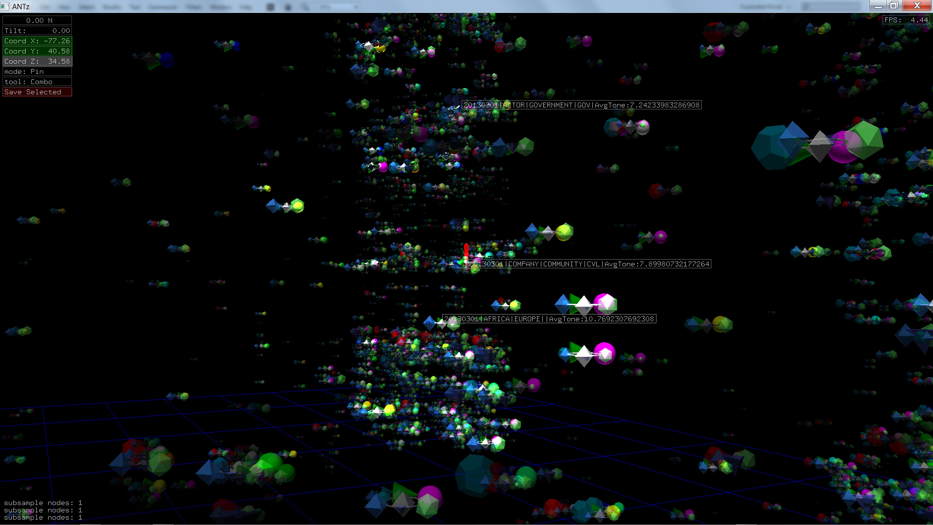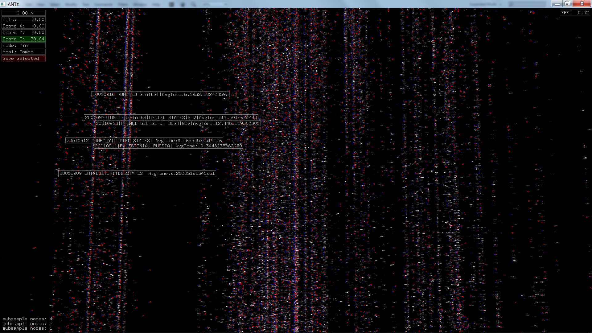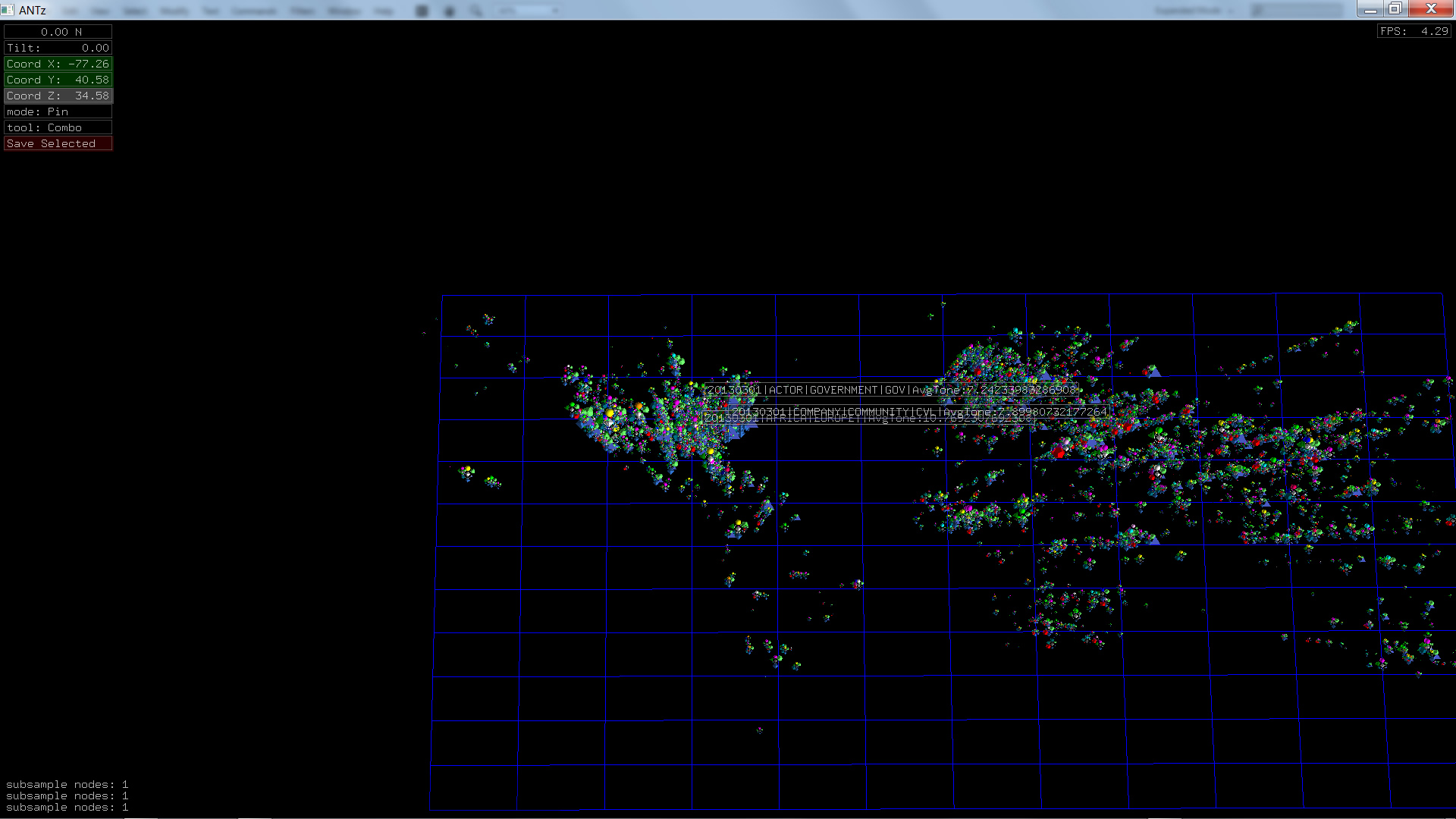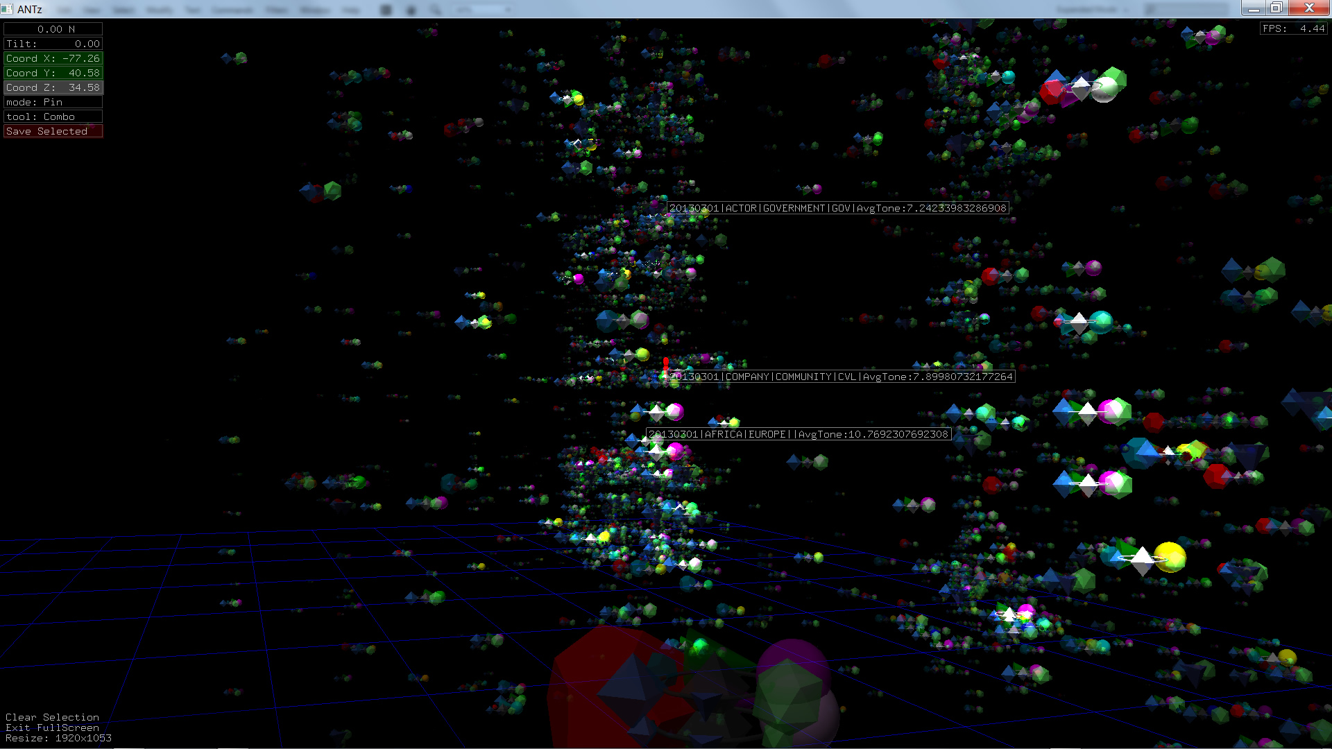 Color corresponds to Actor1Type1Code (NOTE: the Actor1Type1Code is also the first item in the object Labels). Legend TBD.