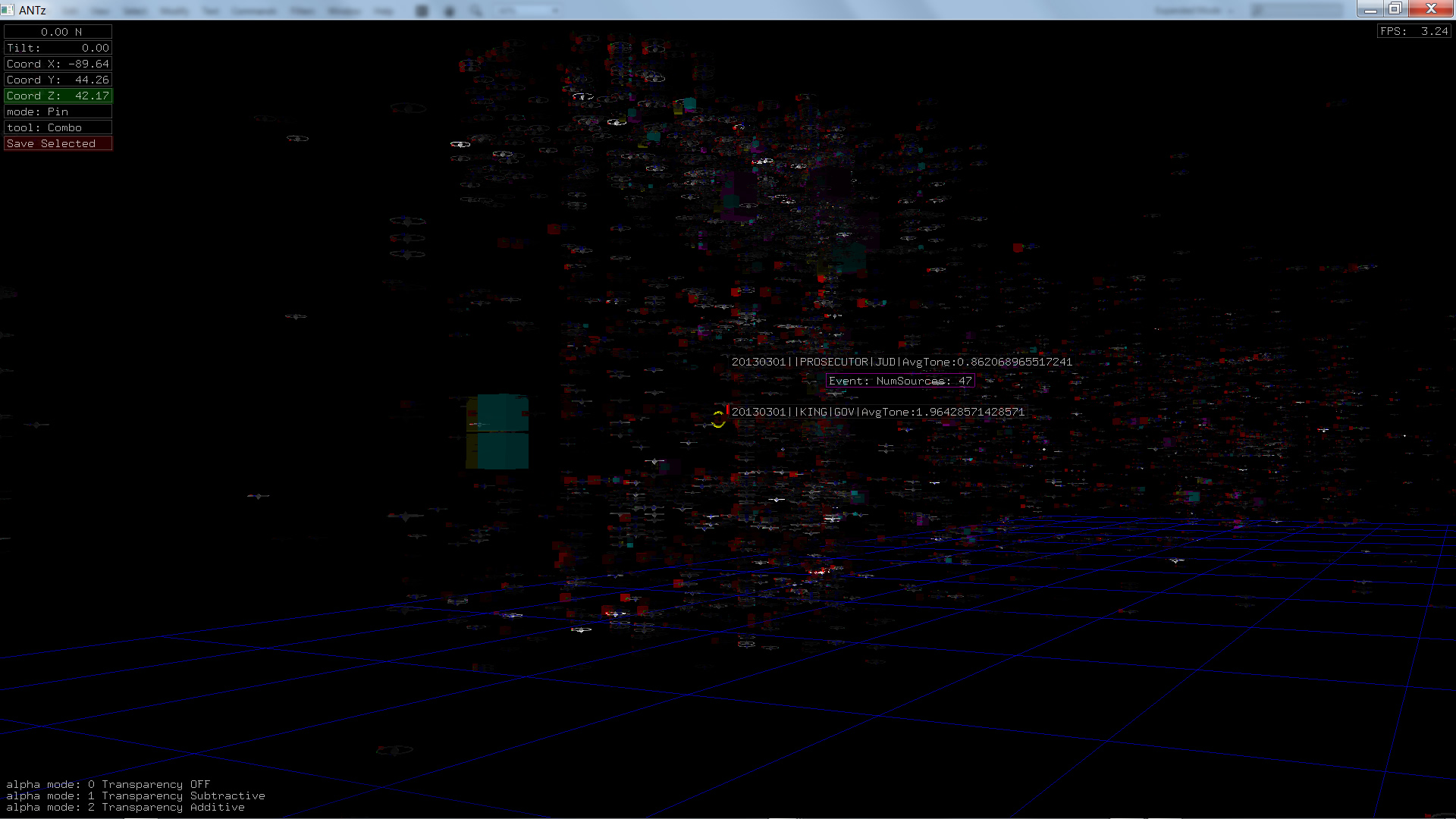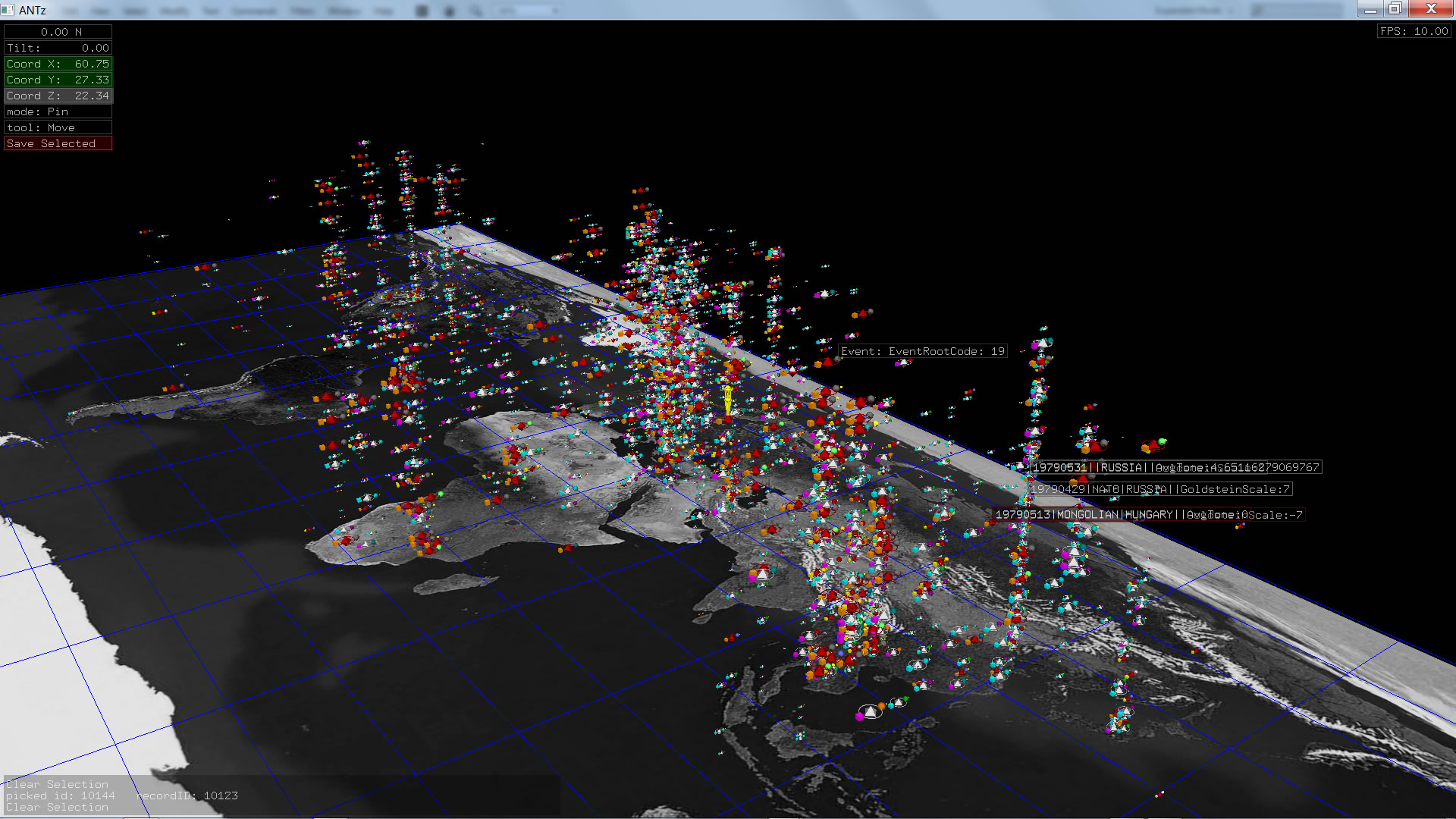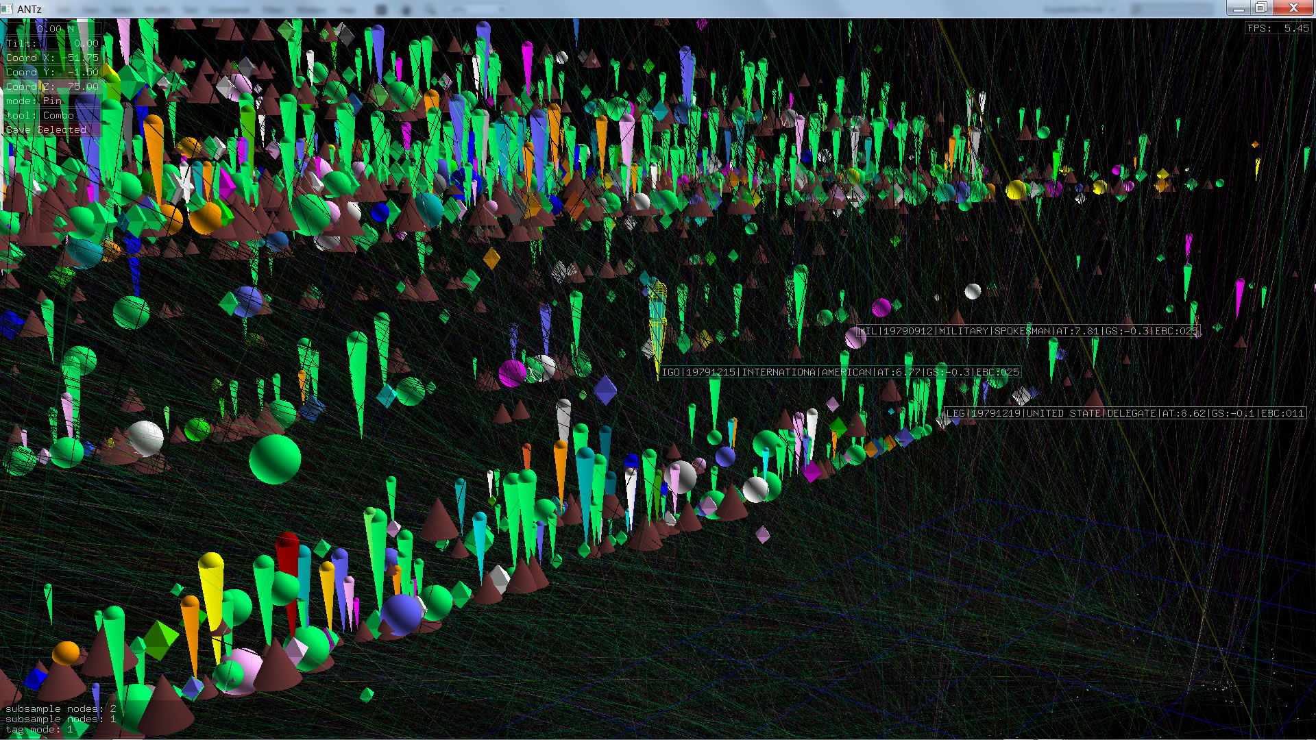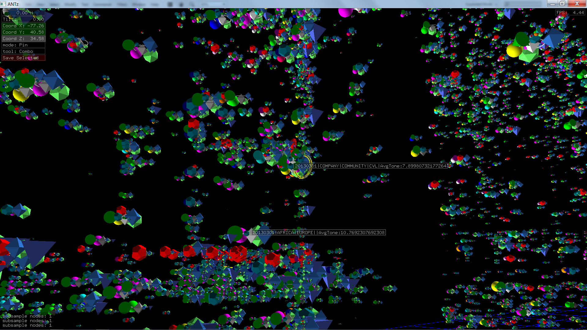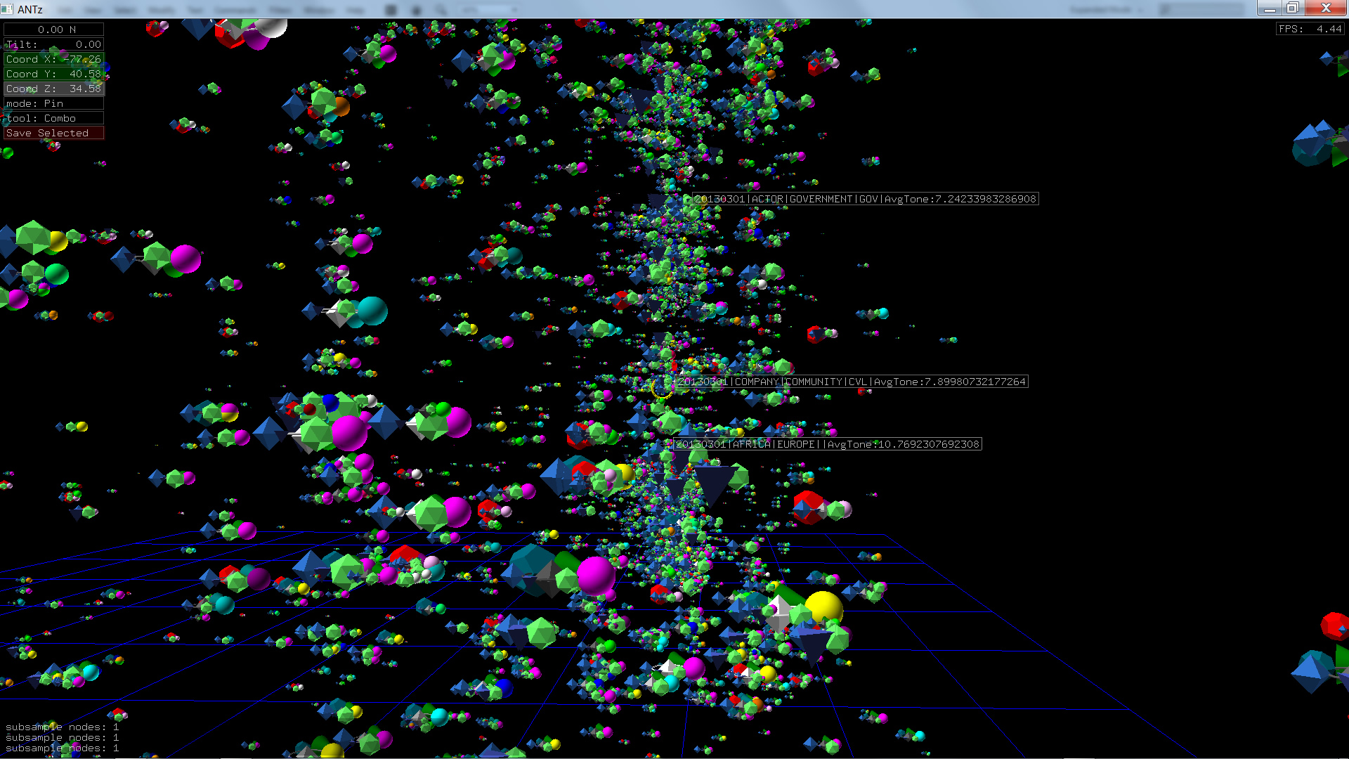 Color corresponds to Actor1Type1Code (NOTE: the Actor1Type1Code is also the first item in the object Labels). Legend TBD.