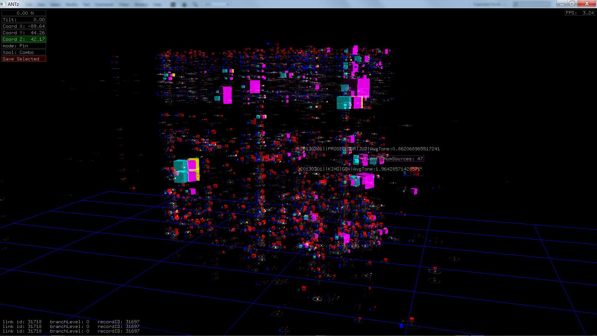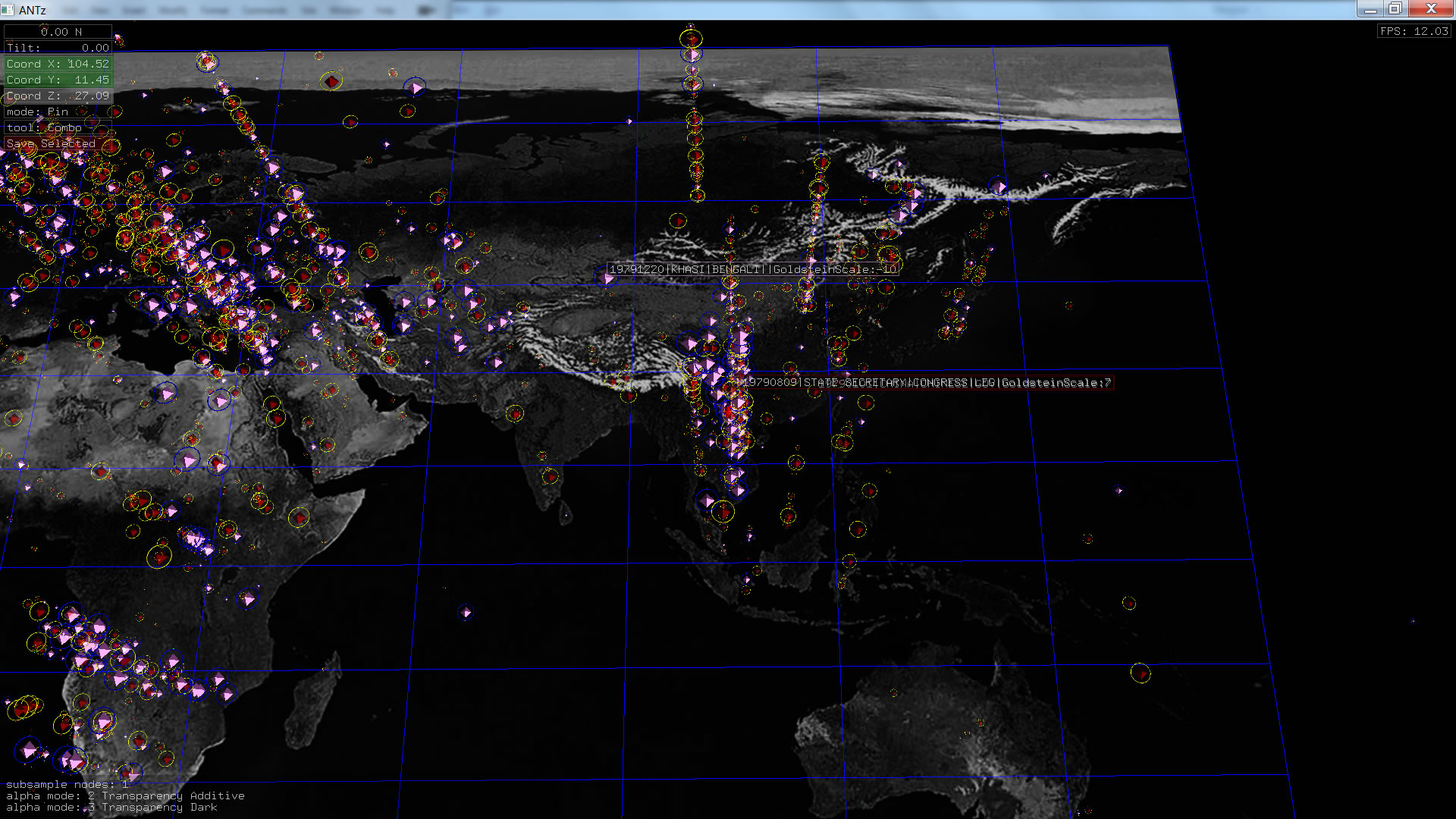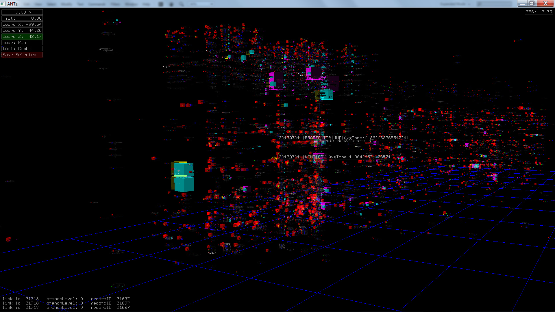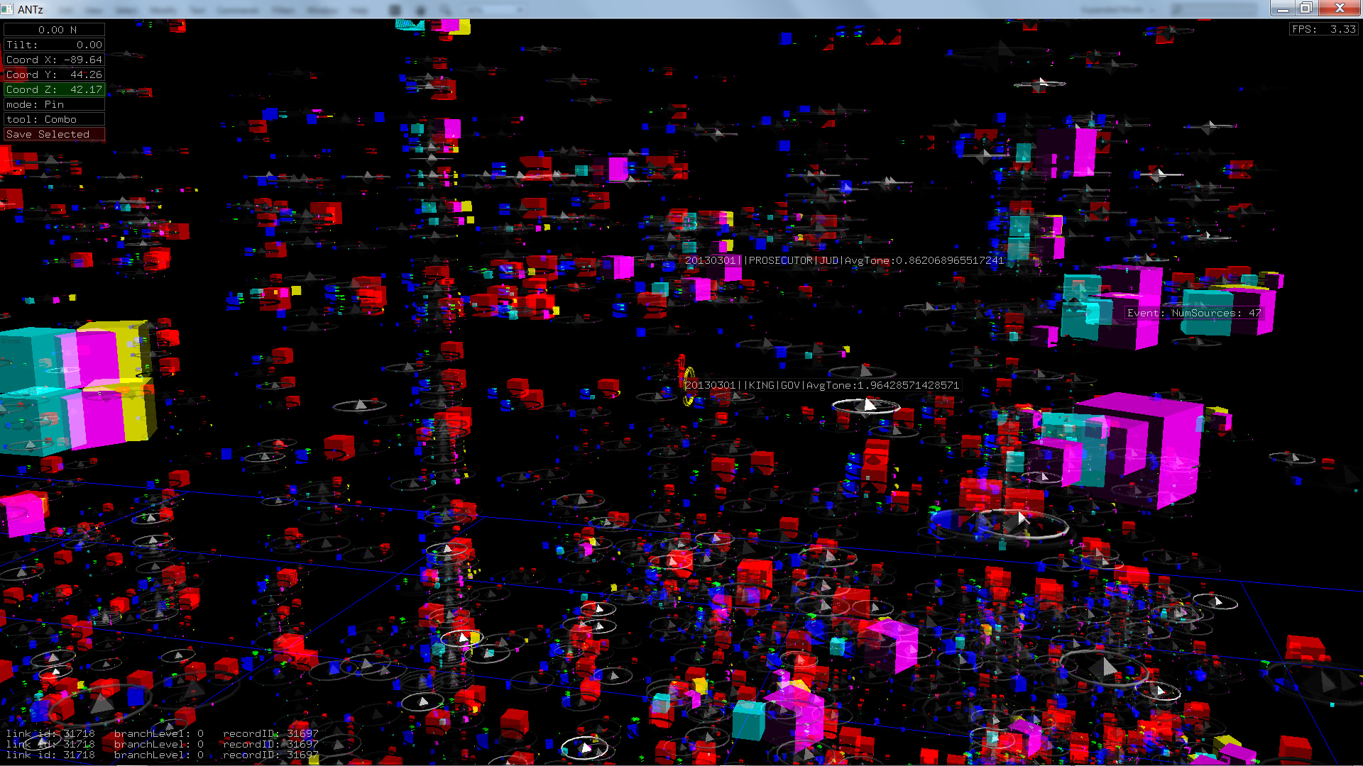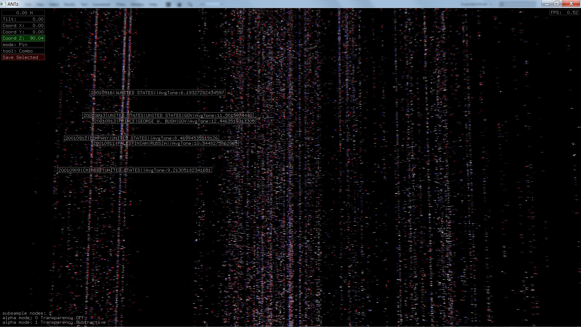 Color corresponds to Actor1Type1Code (NOTE: the Actor1Type1Code is also the first item in the object Labels). Legend TBD.