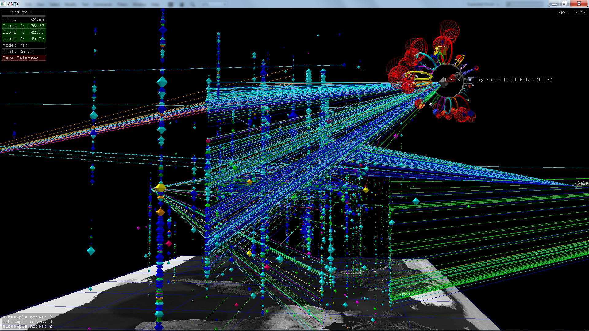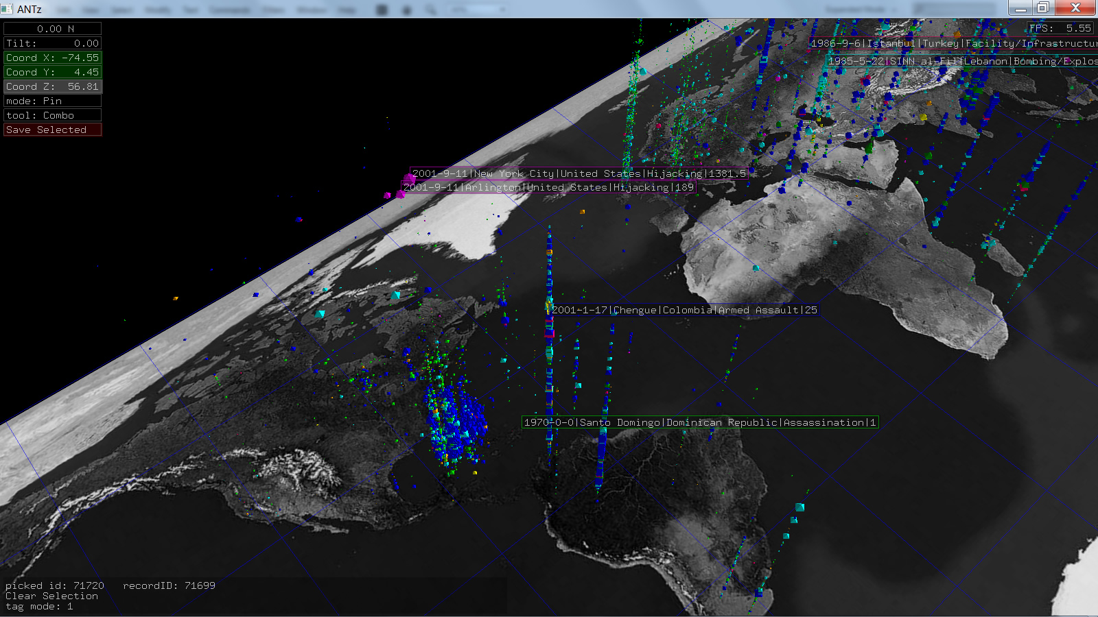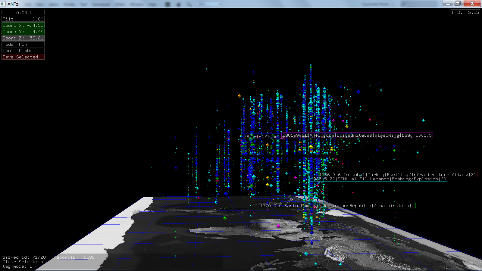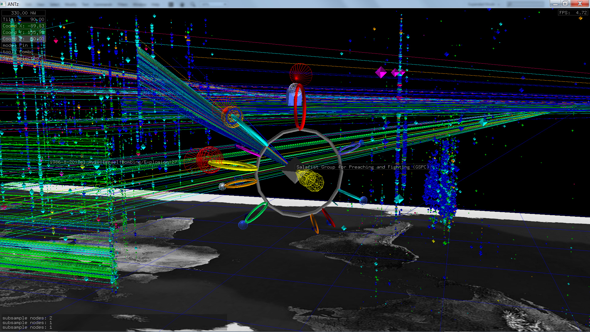 Each object represents a terrorist-related event. Size is proportional to the number of people killed, color is the type of attack which occurred according to the legend below.