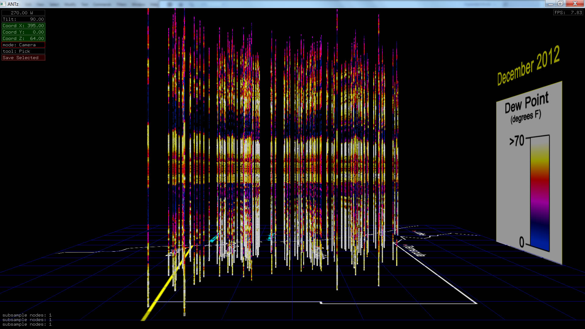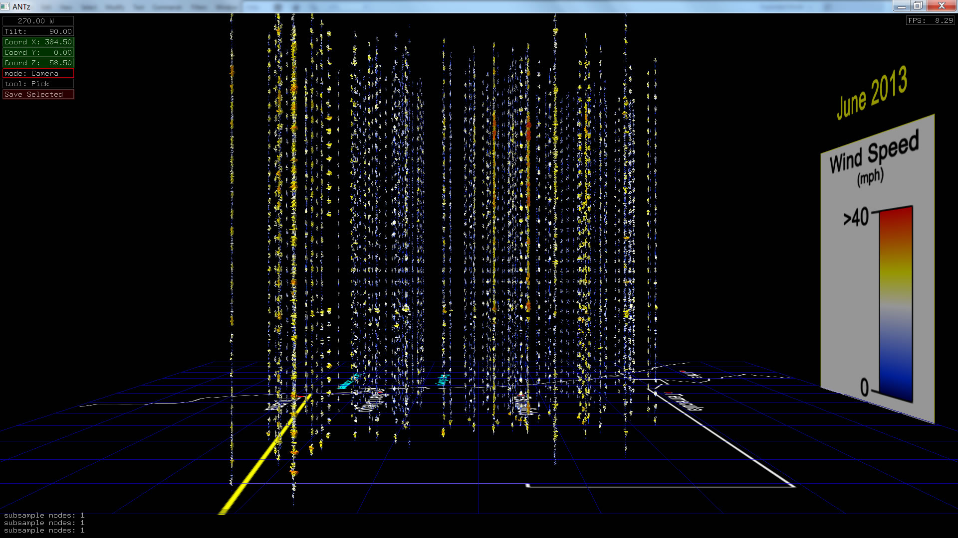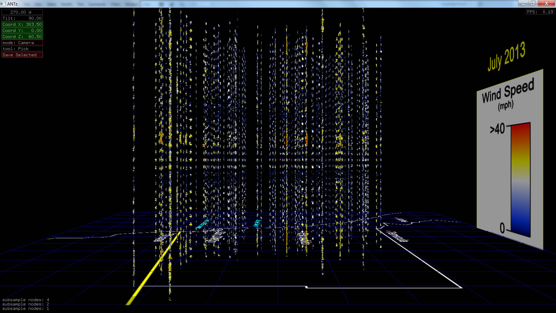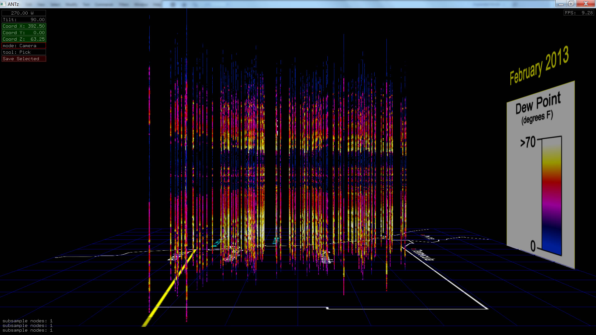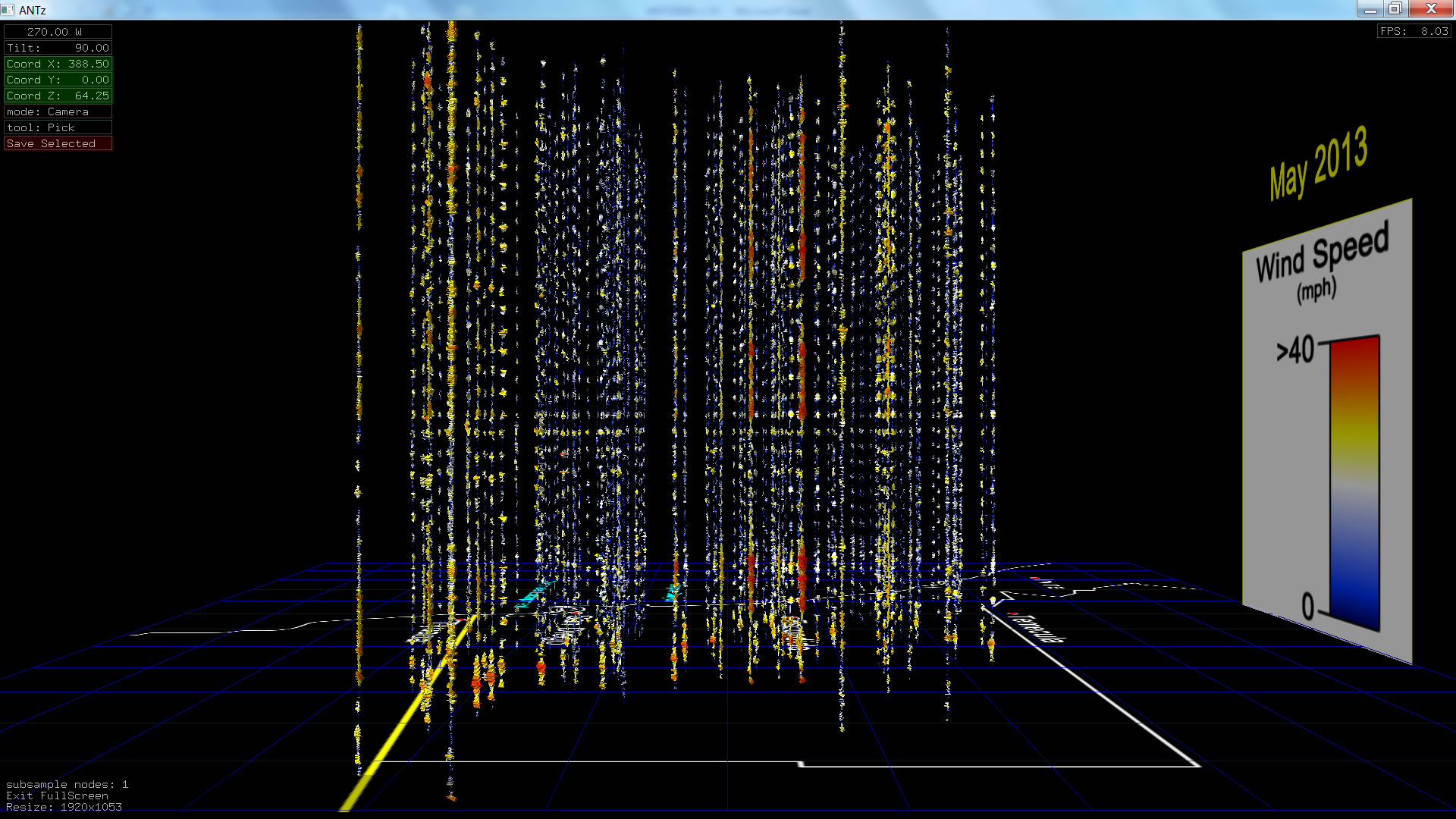 The visualization shown below uses the same data but in a 2D format. ANTz was not used for this visualization.