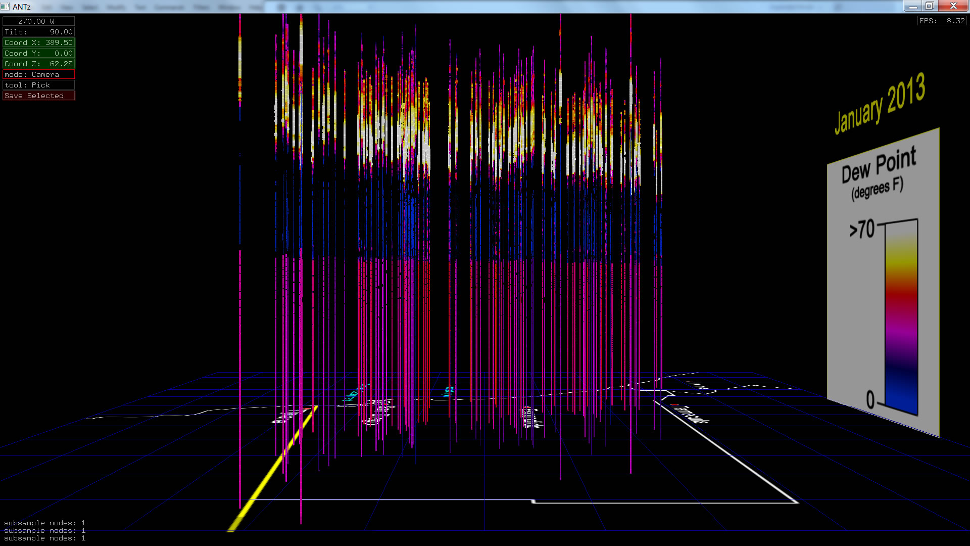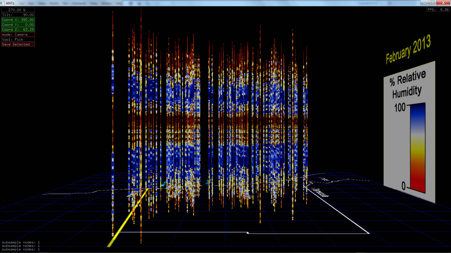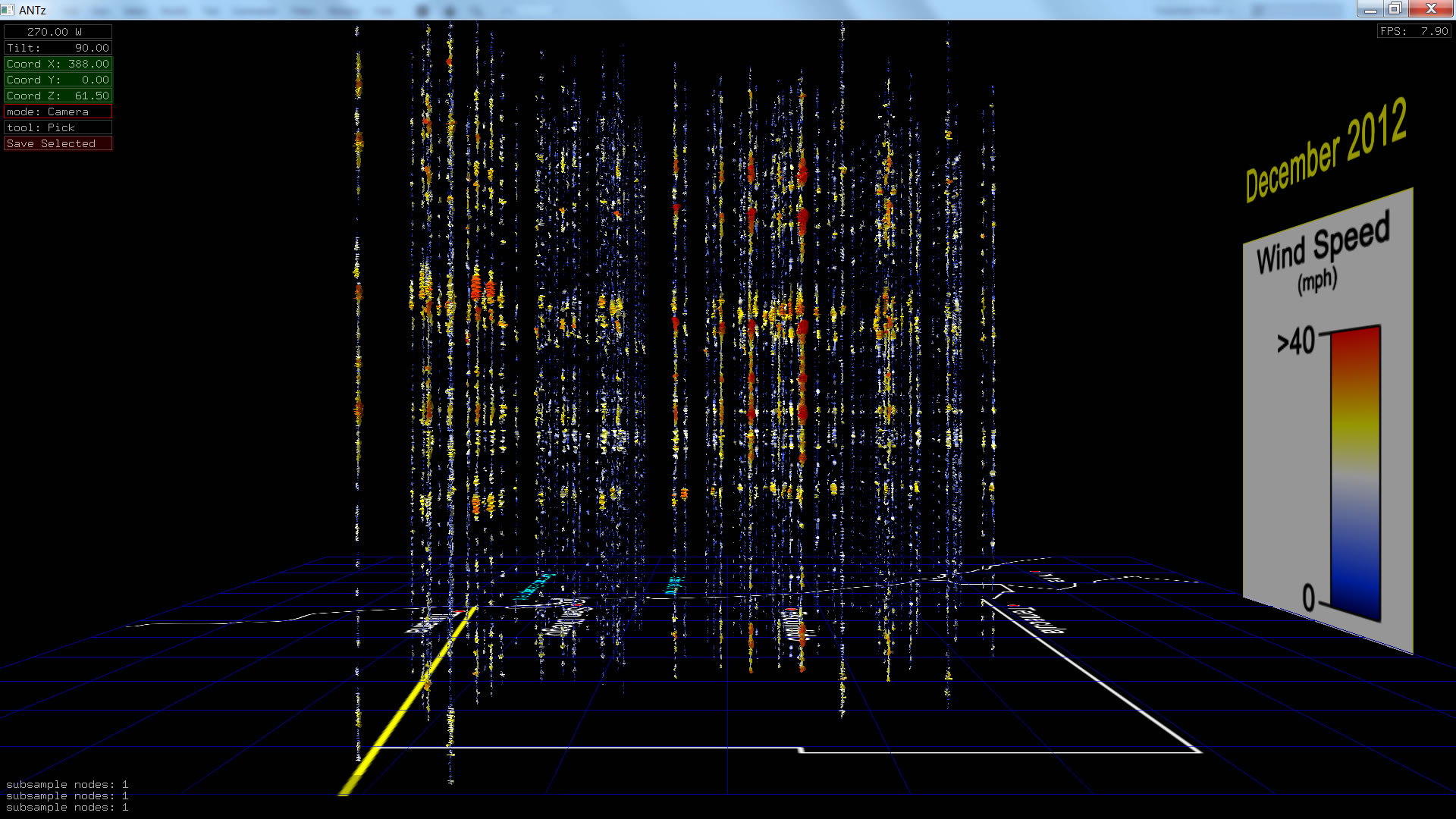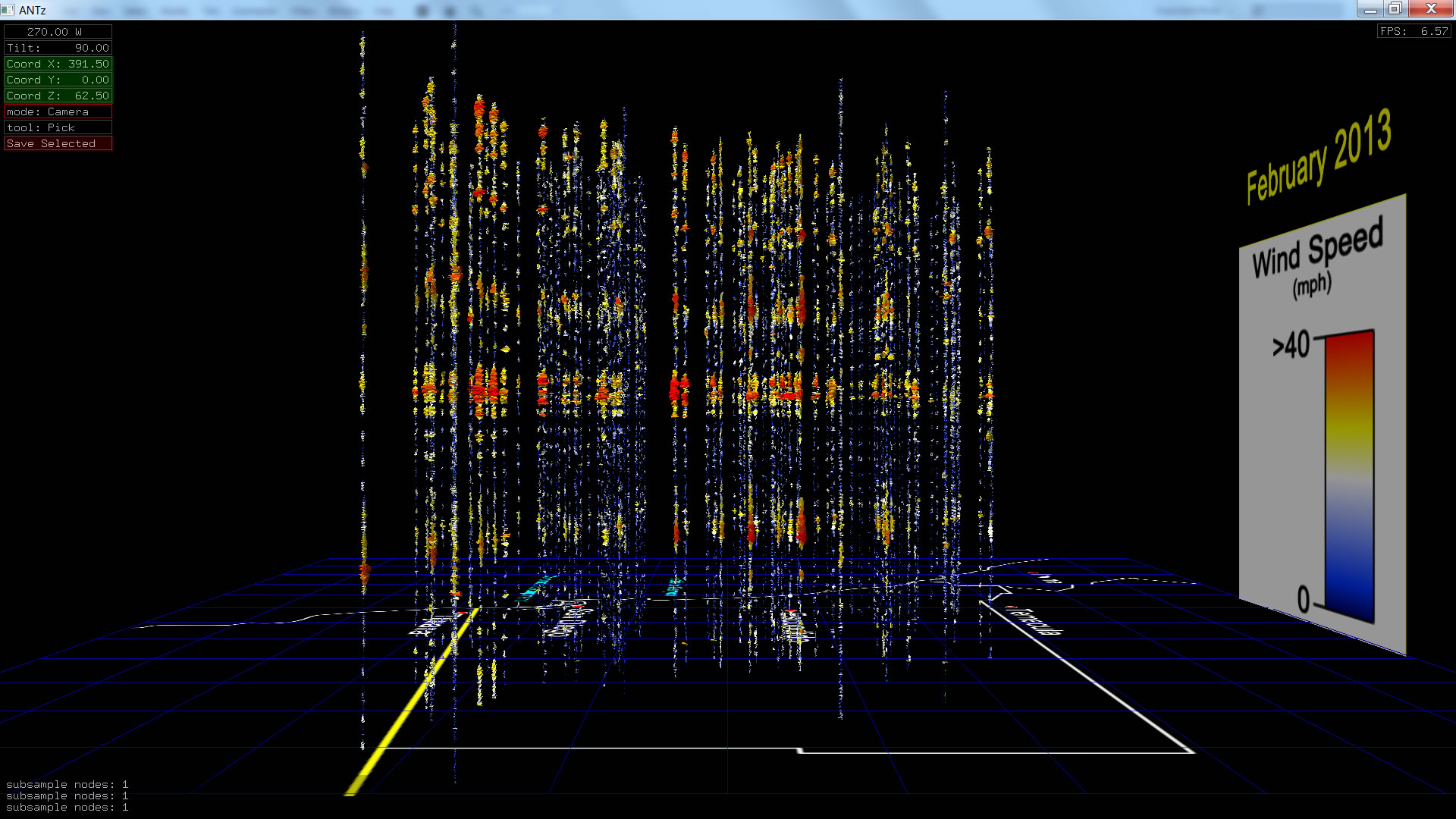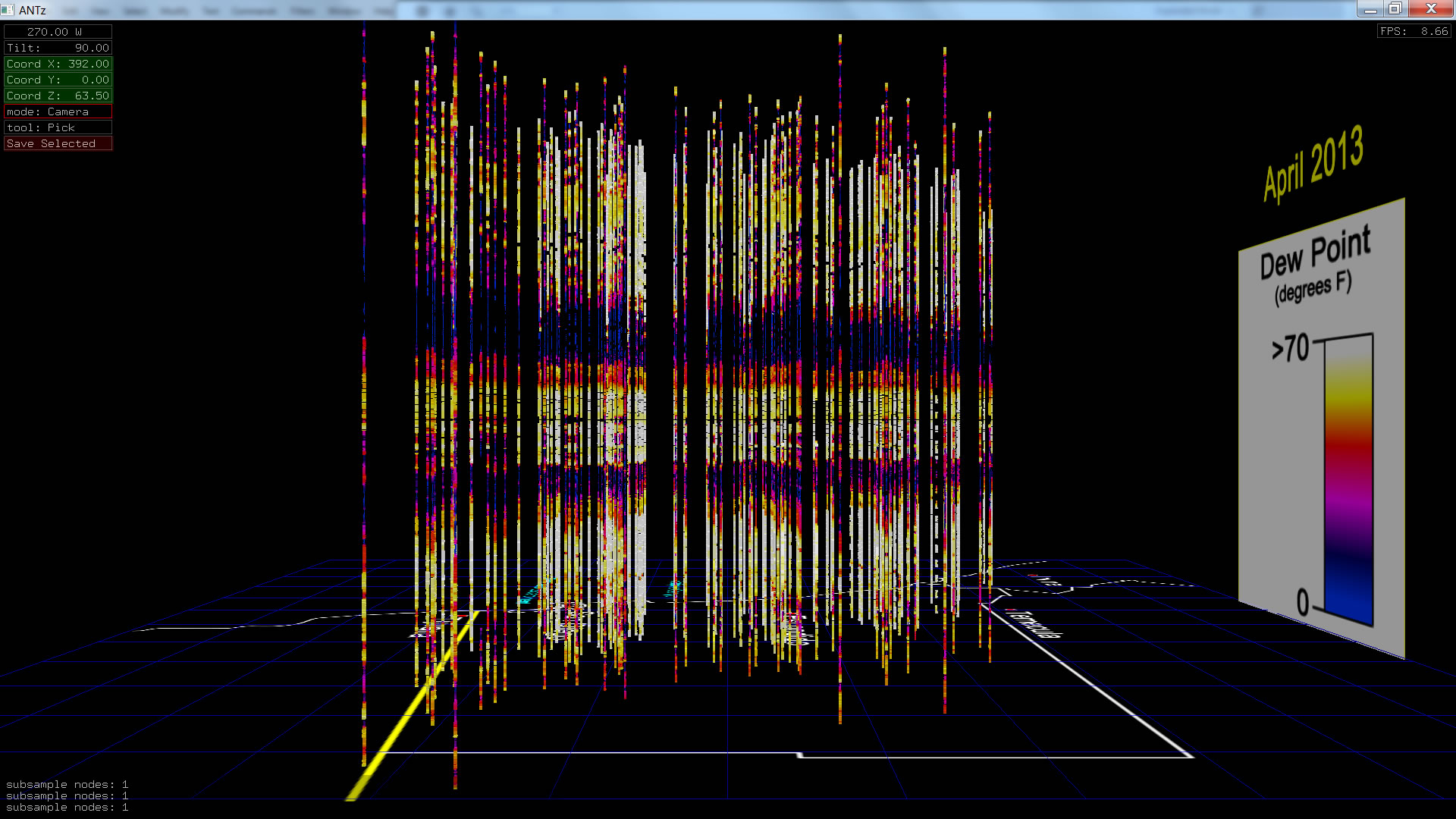 The visualization shown below uses the same data but in a 2D format. ANTz was not used for this visualization.