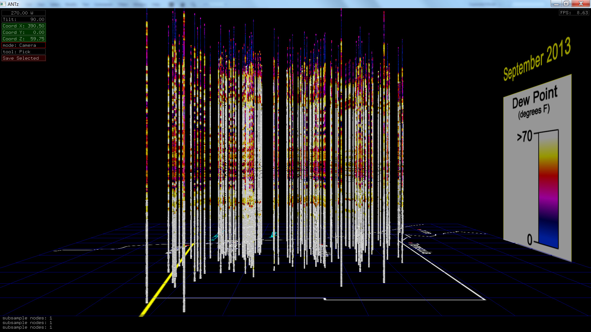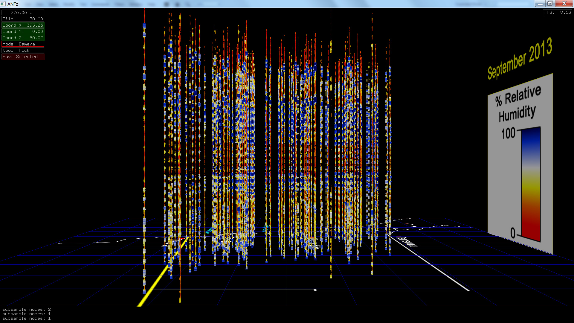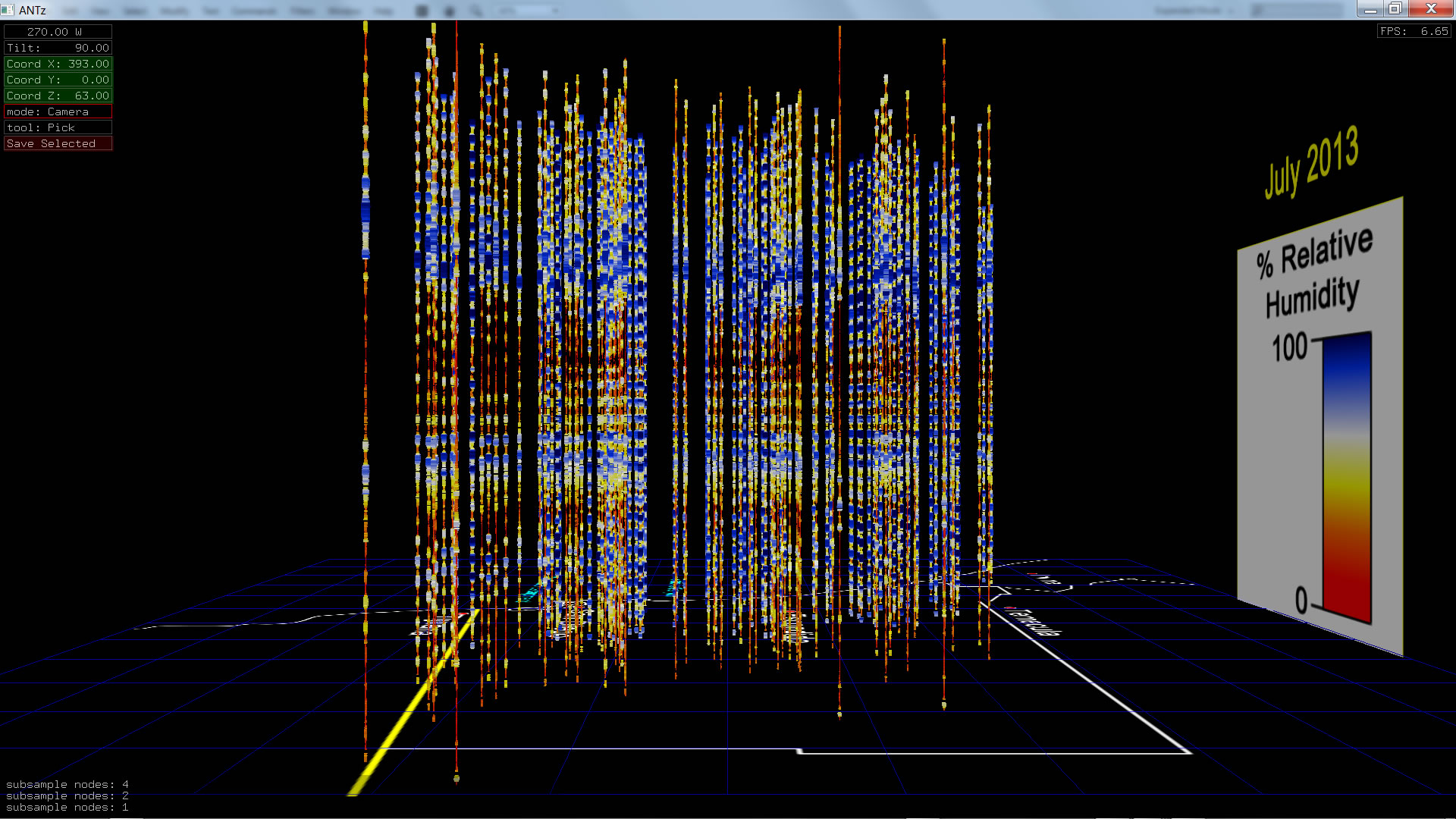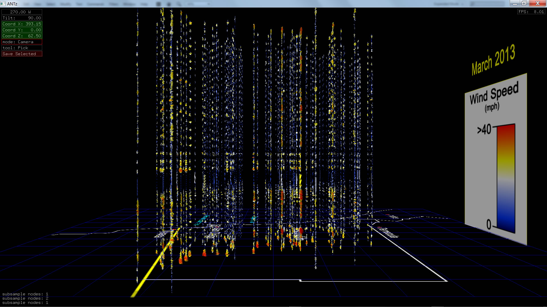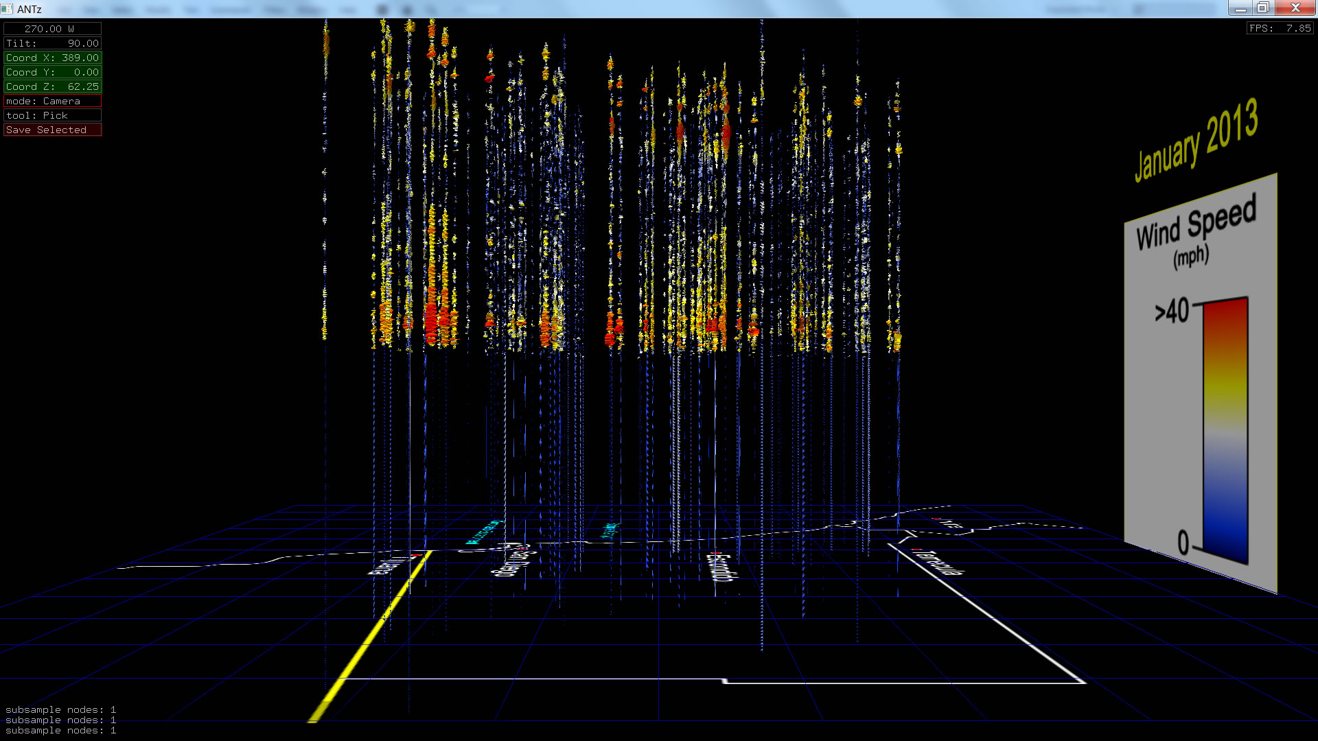 The visualization shown below uses the same data but in a 2D format. ANTz was not used for this visualization.