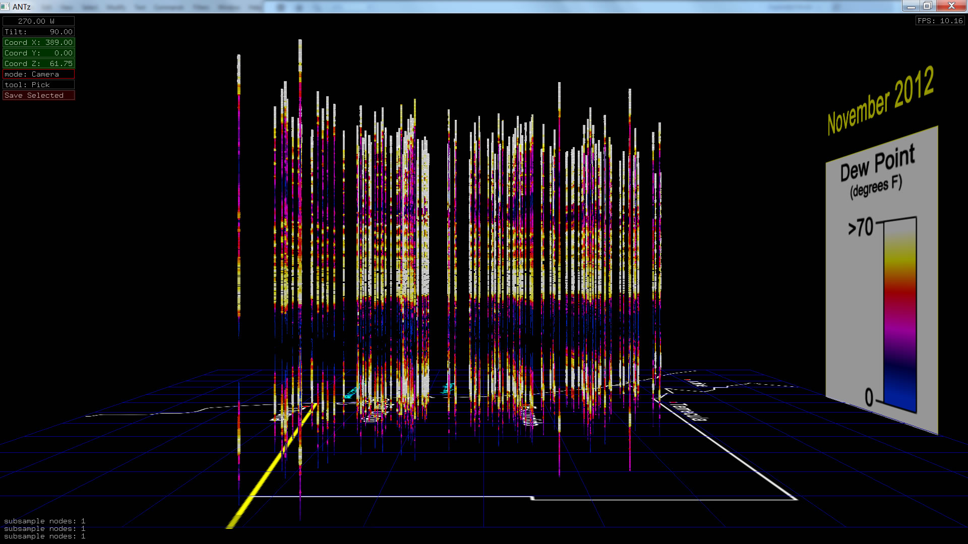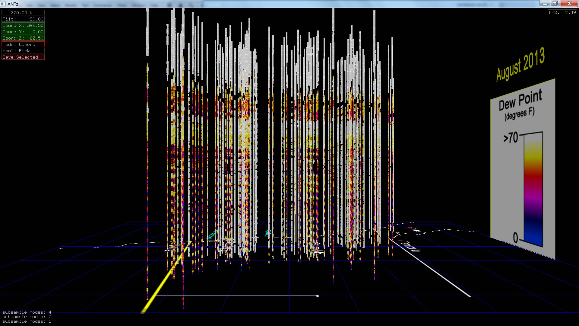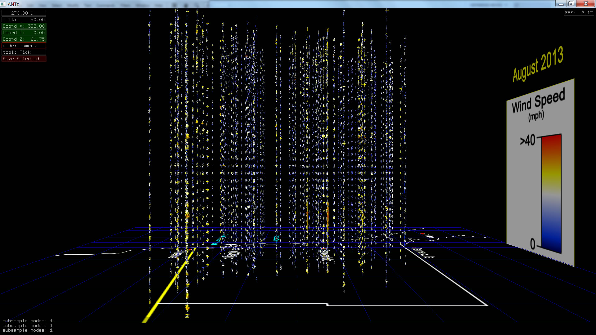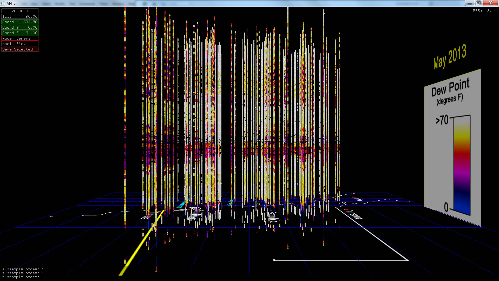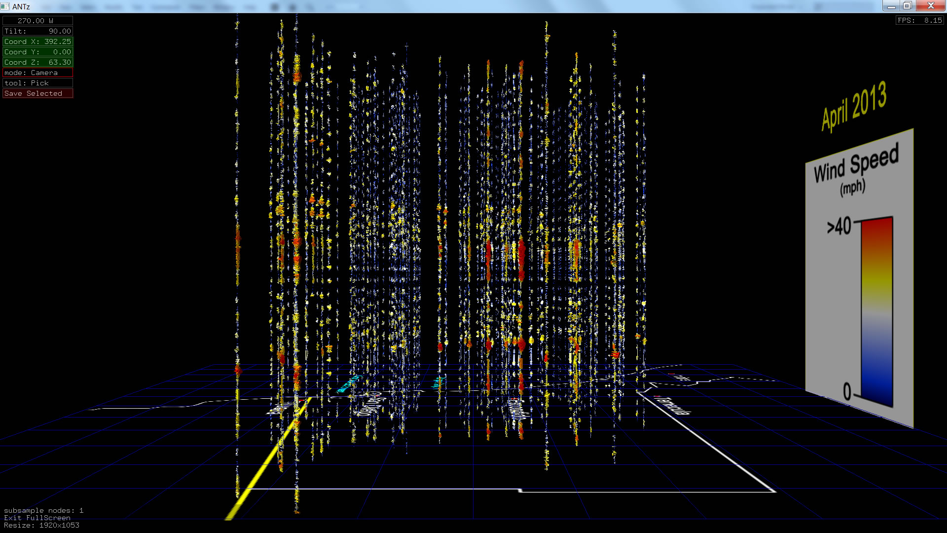 The visualization shown below uses the same data but in a 2D format. ANTz was not used for this visualization.