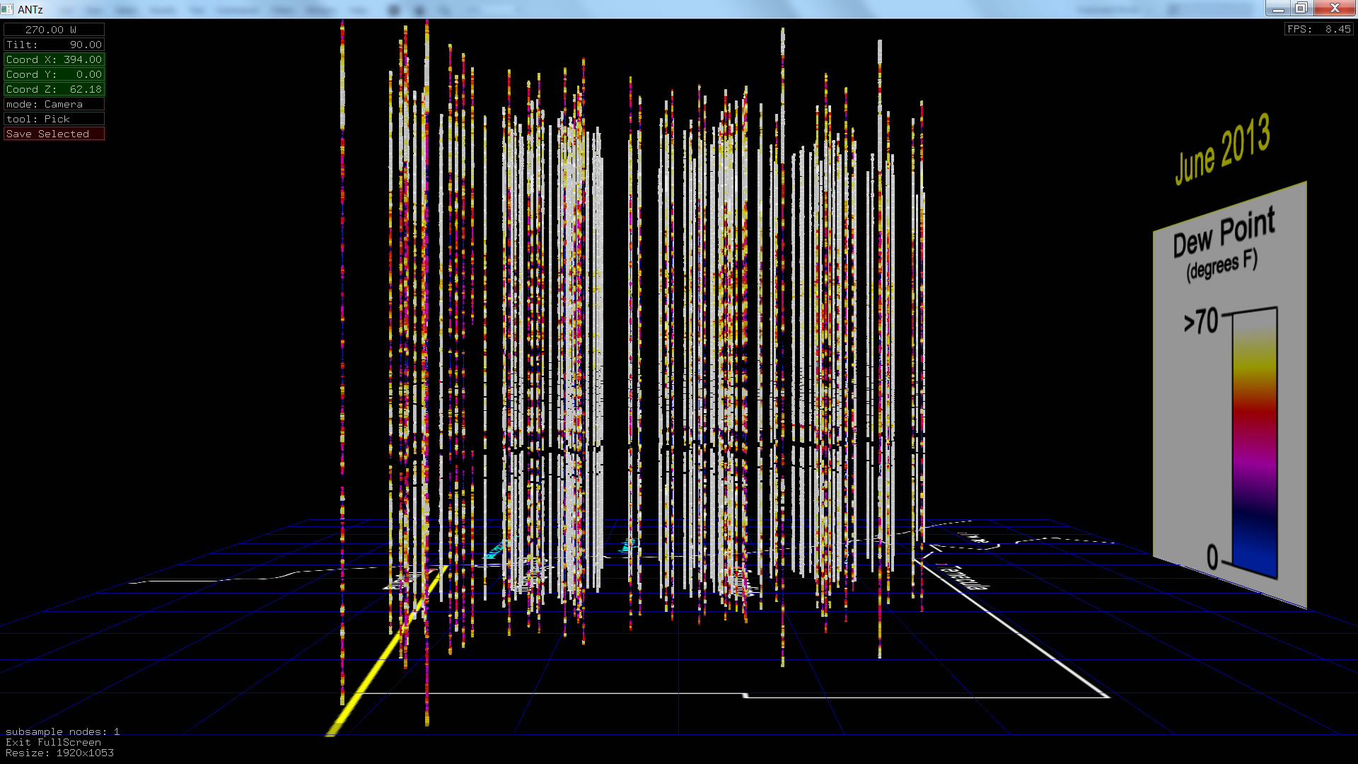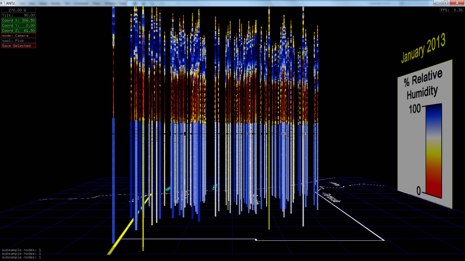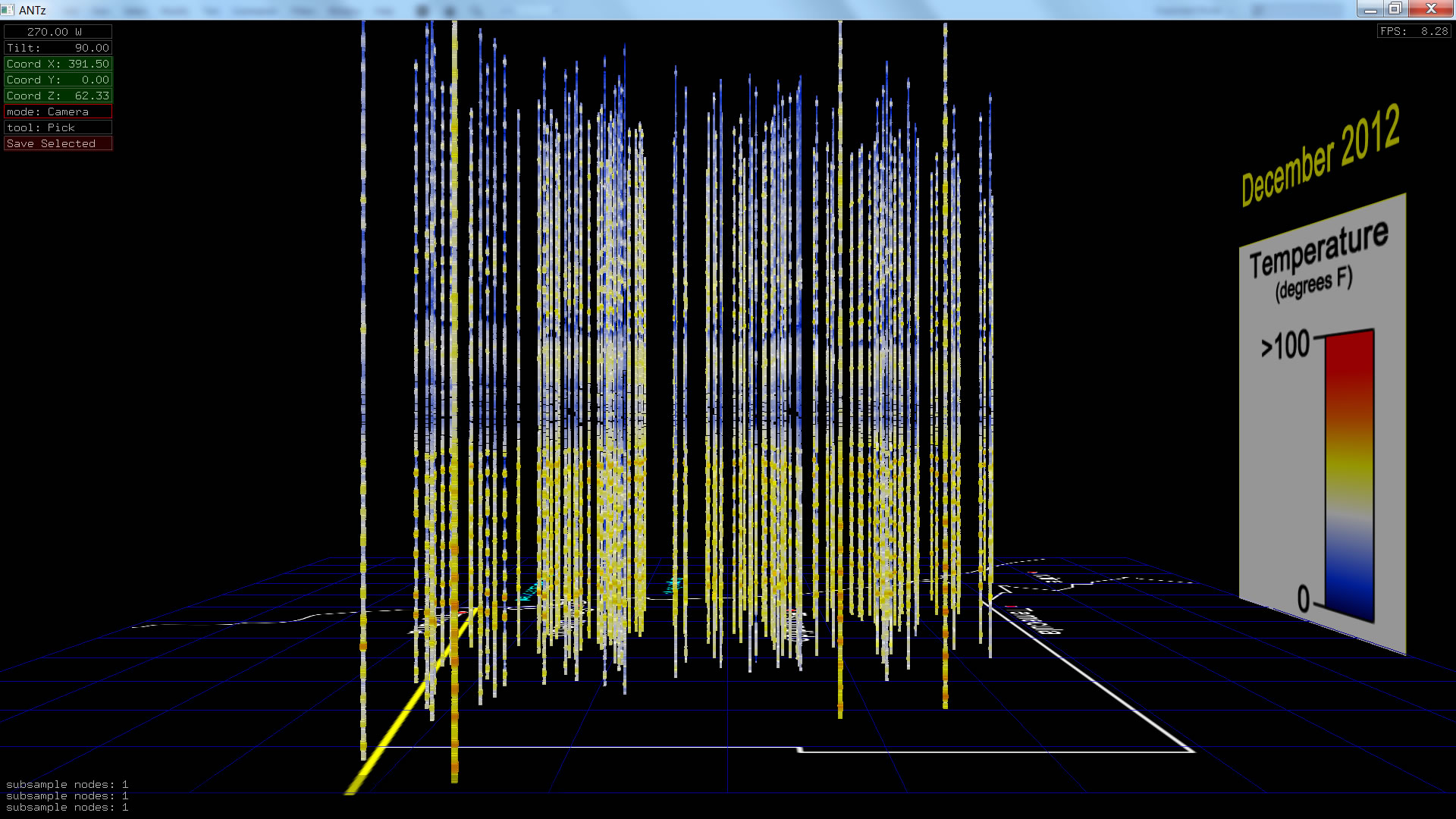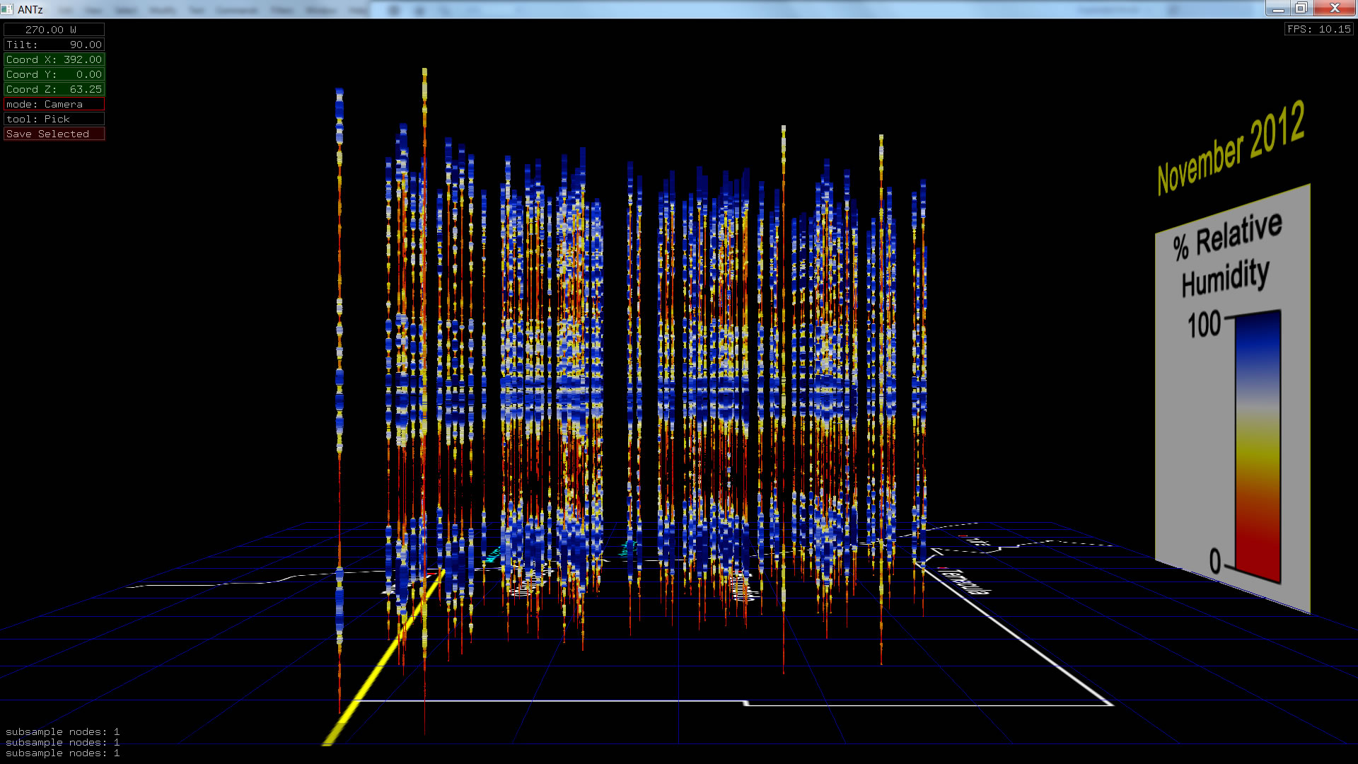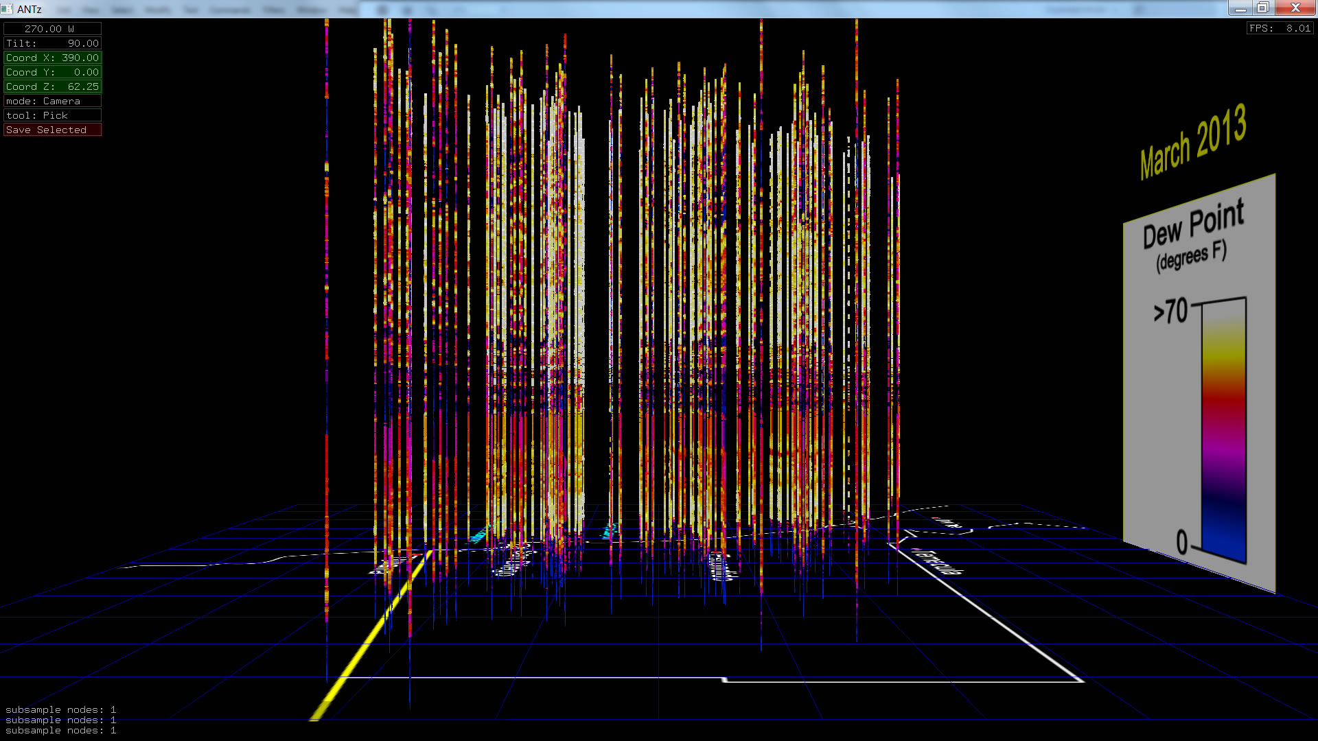 The visualization shown below uses the same data but in a 2D format. ANTz was not used for this visualization.