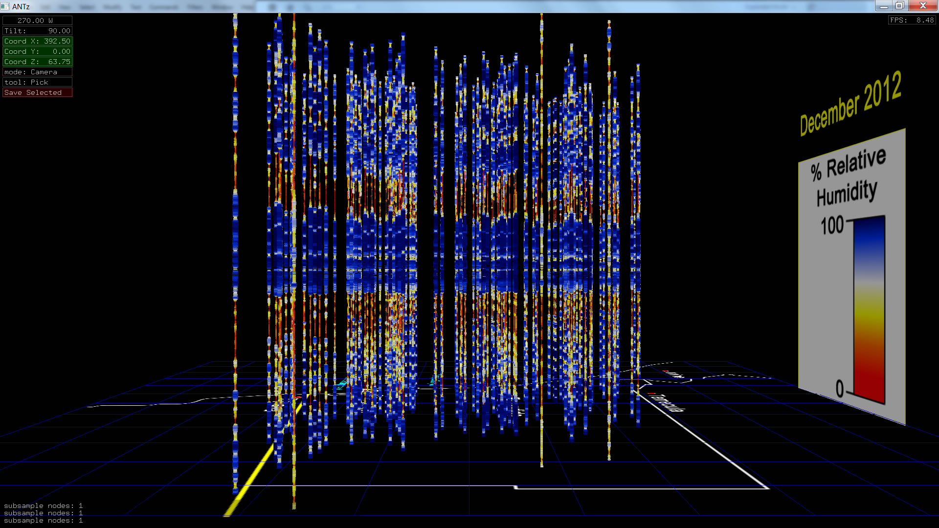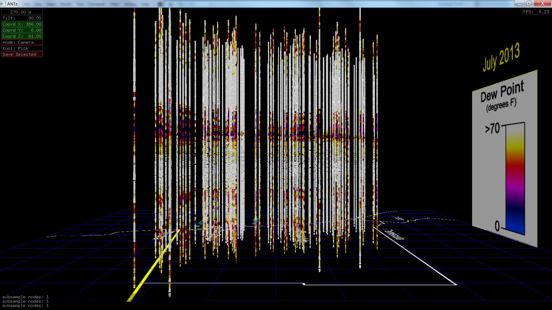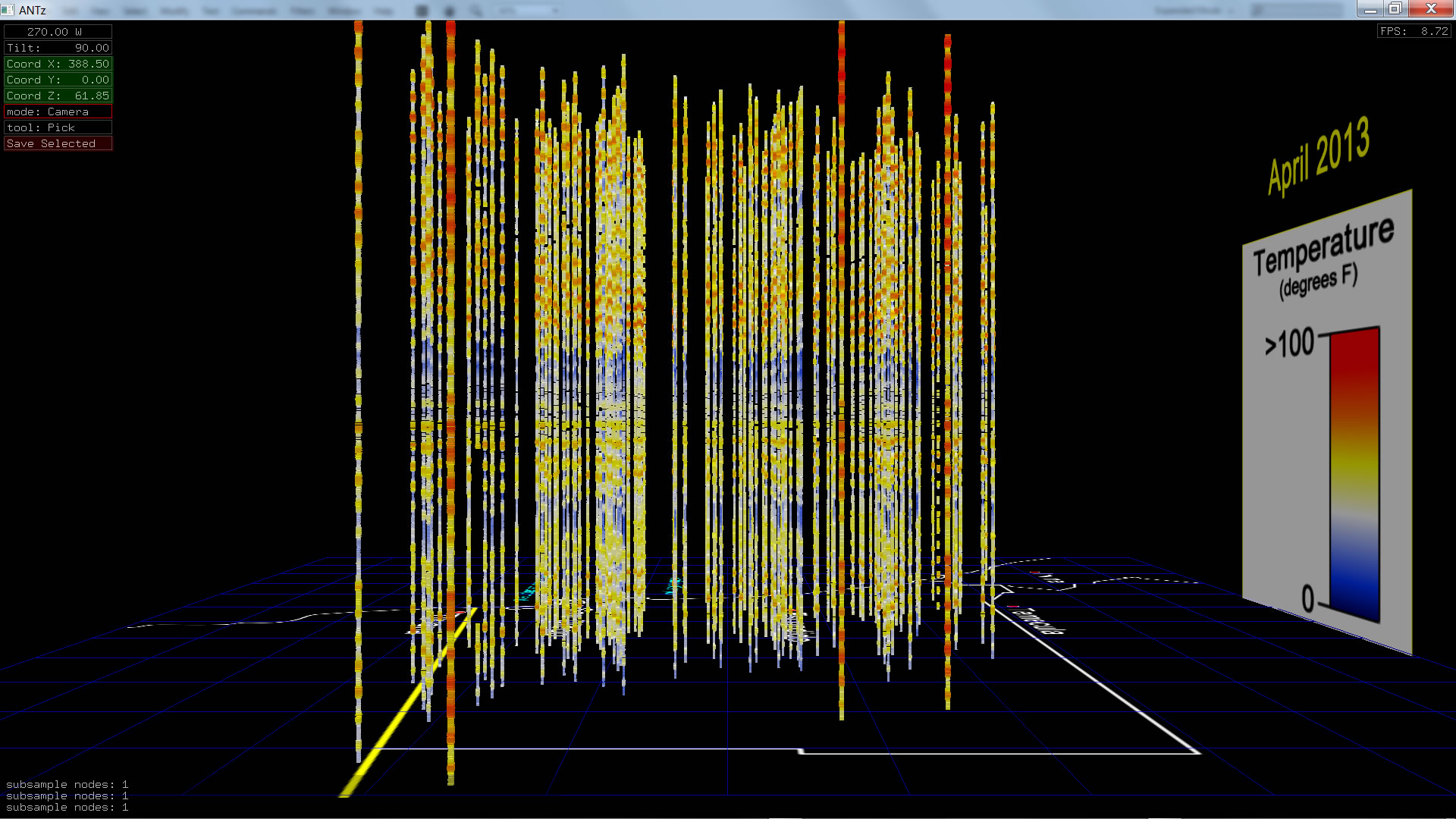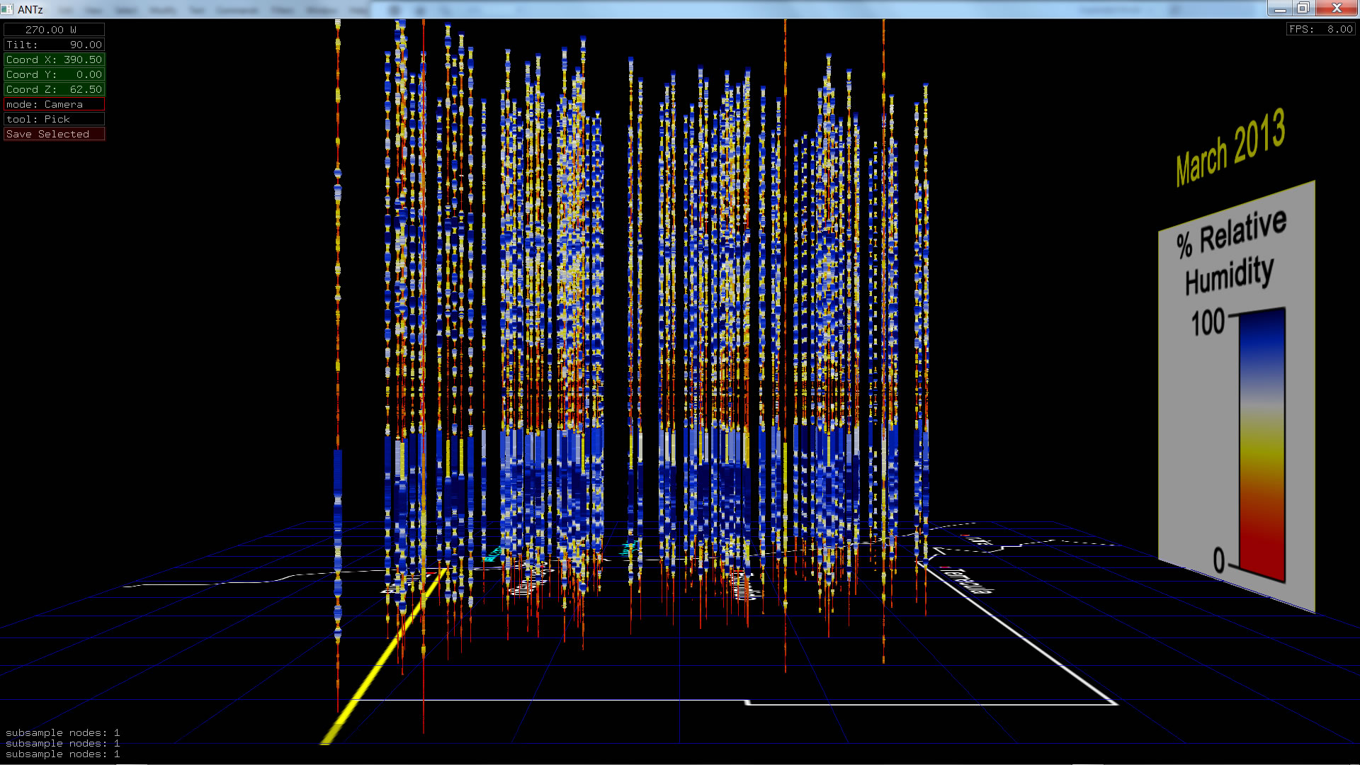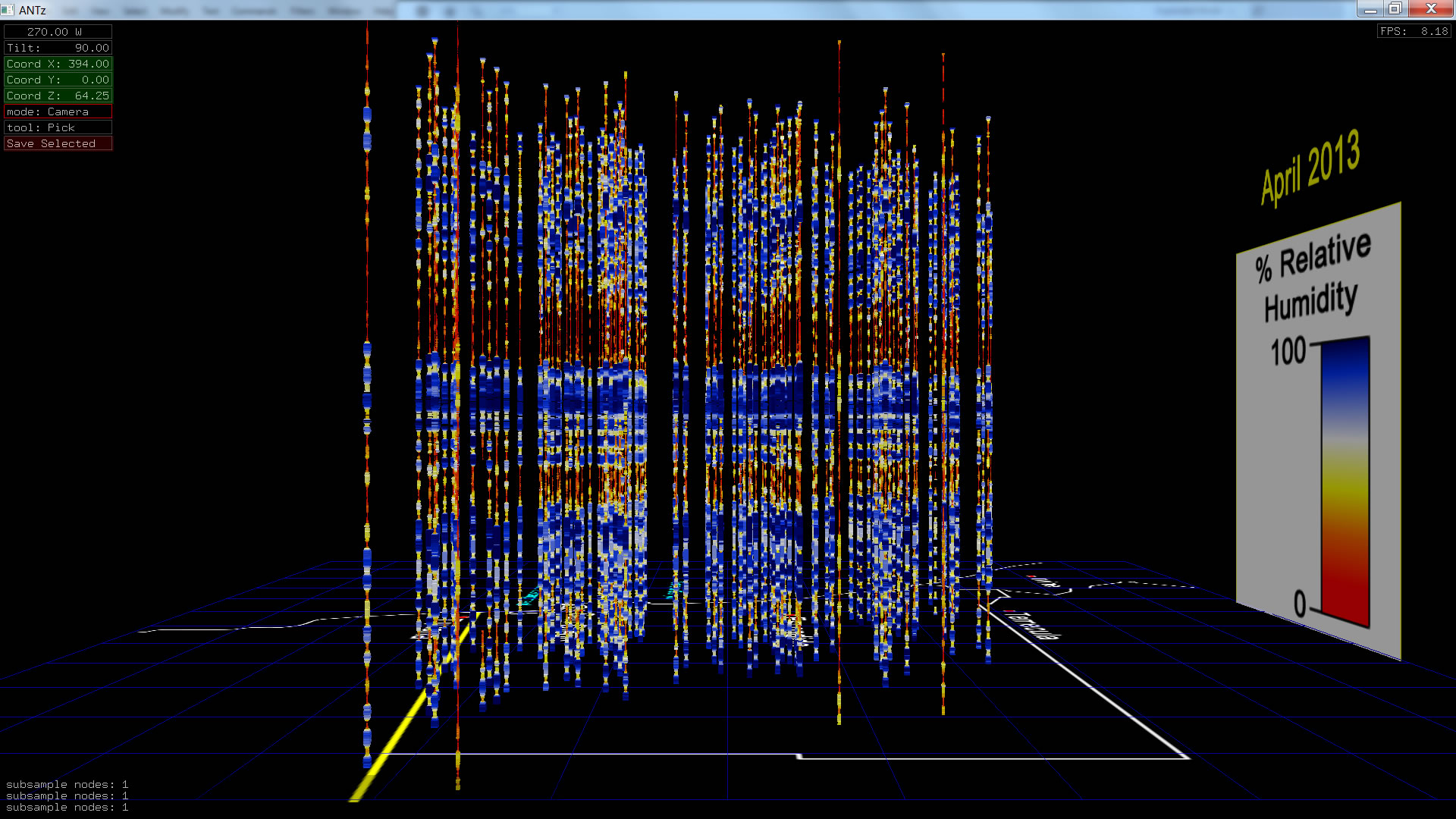 The visualization shown below uses the same data but in a 2D format. ANTz was not used for this visualization.