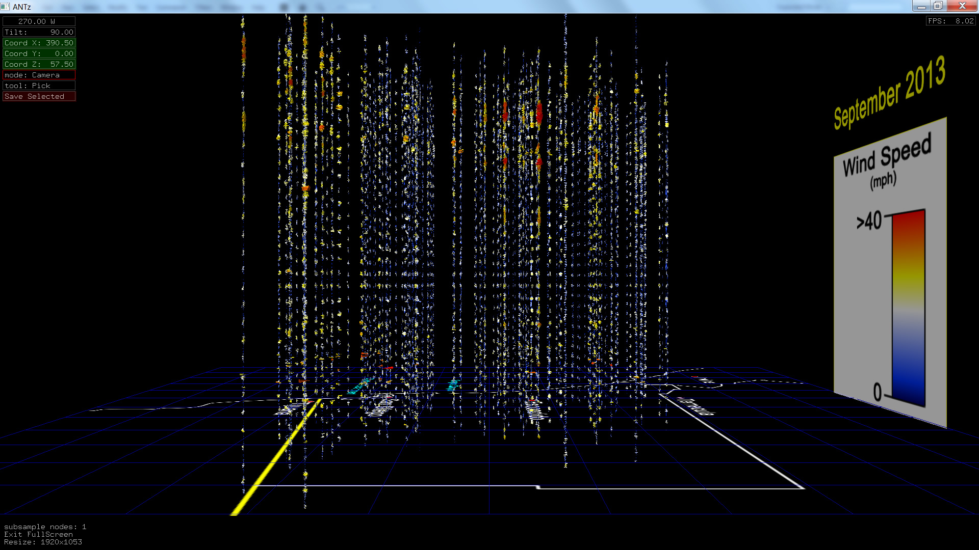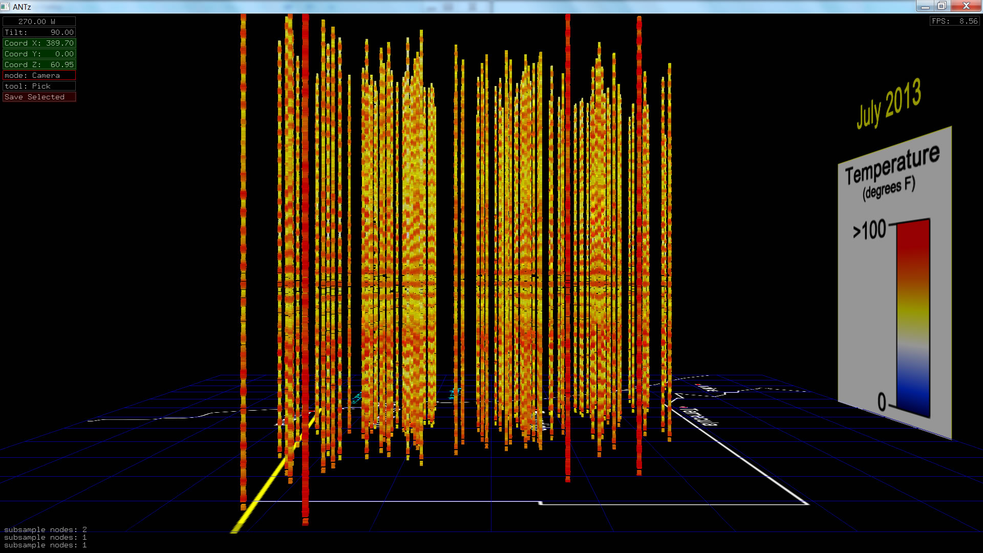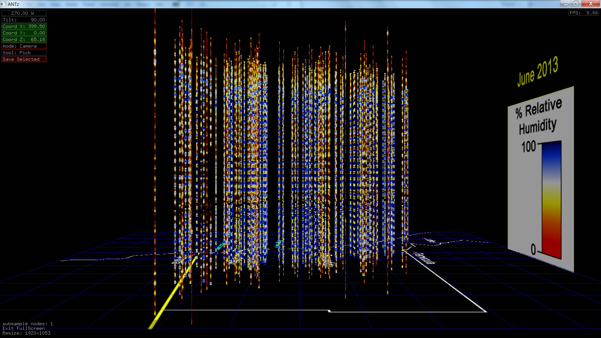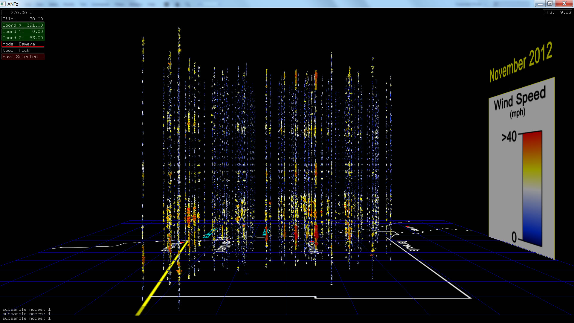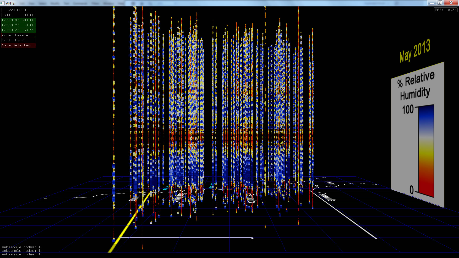 The visualization shown below uses the same data but in a 2D format. ANTz was not used for this visualization.