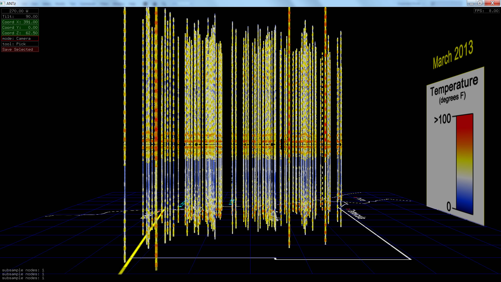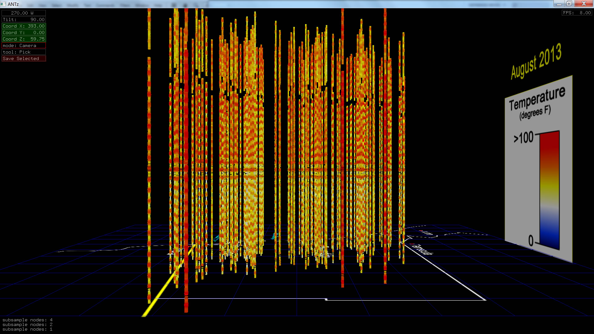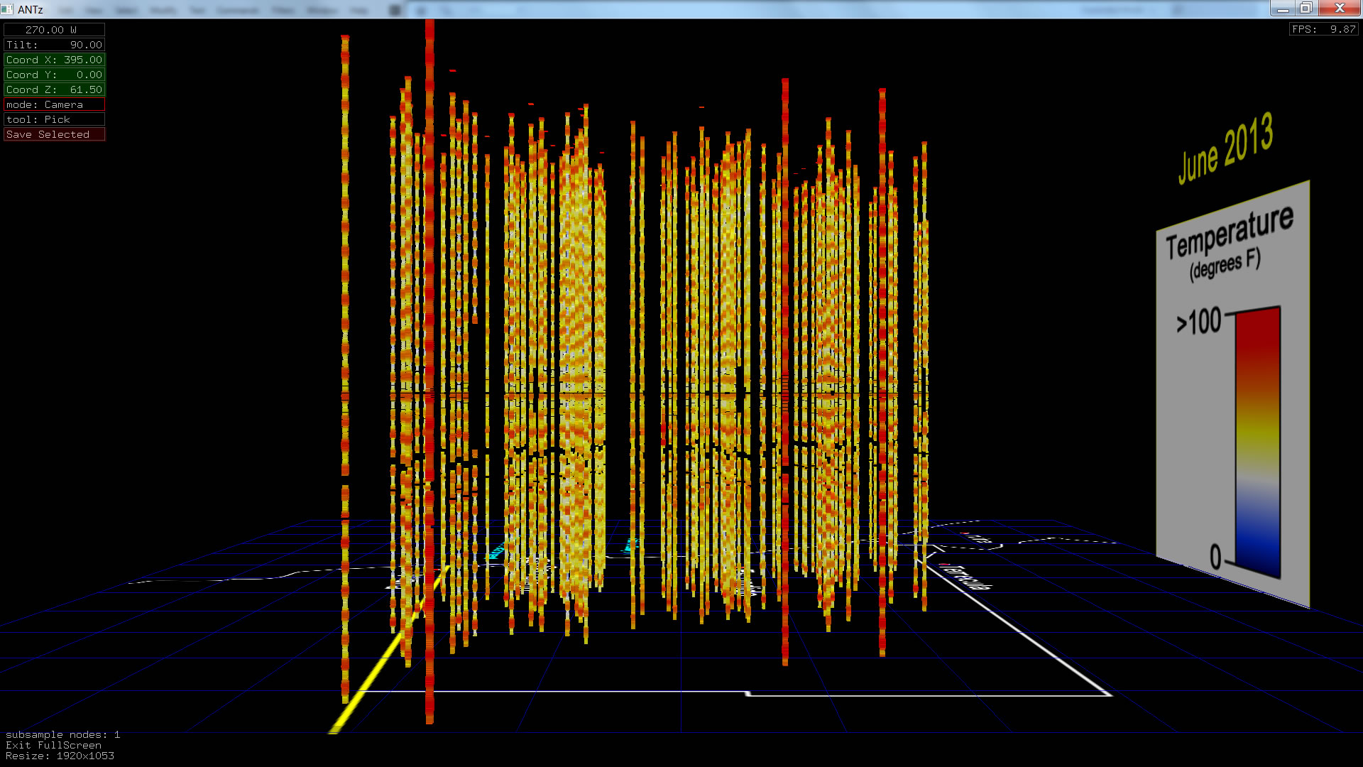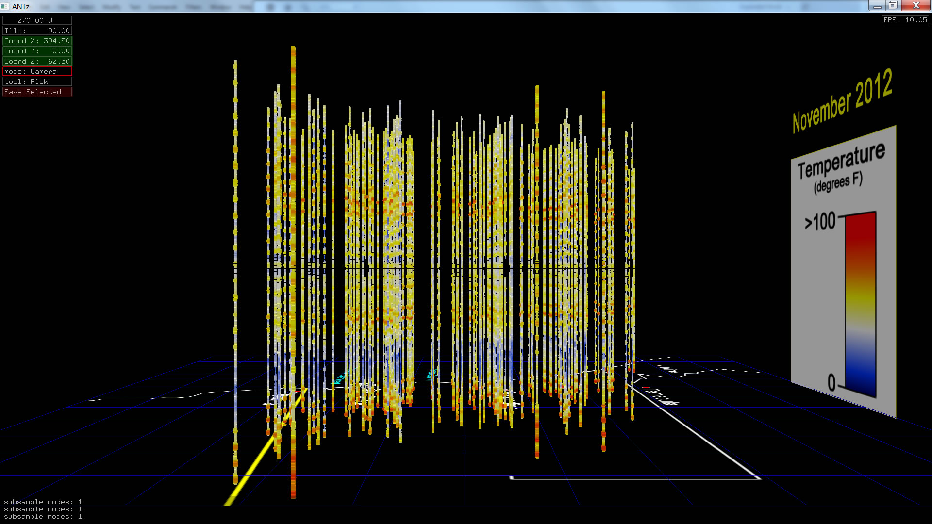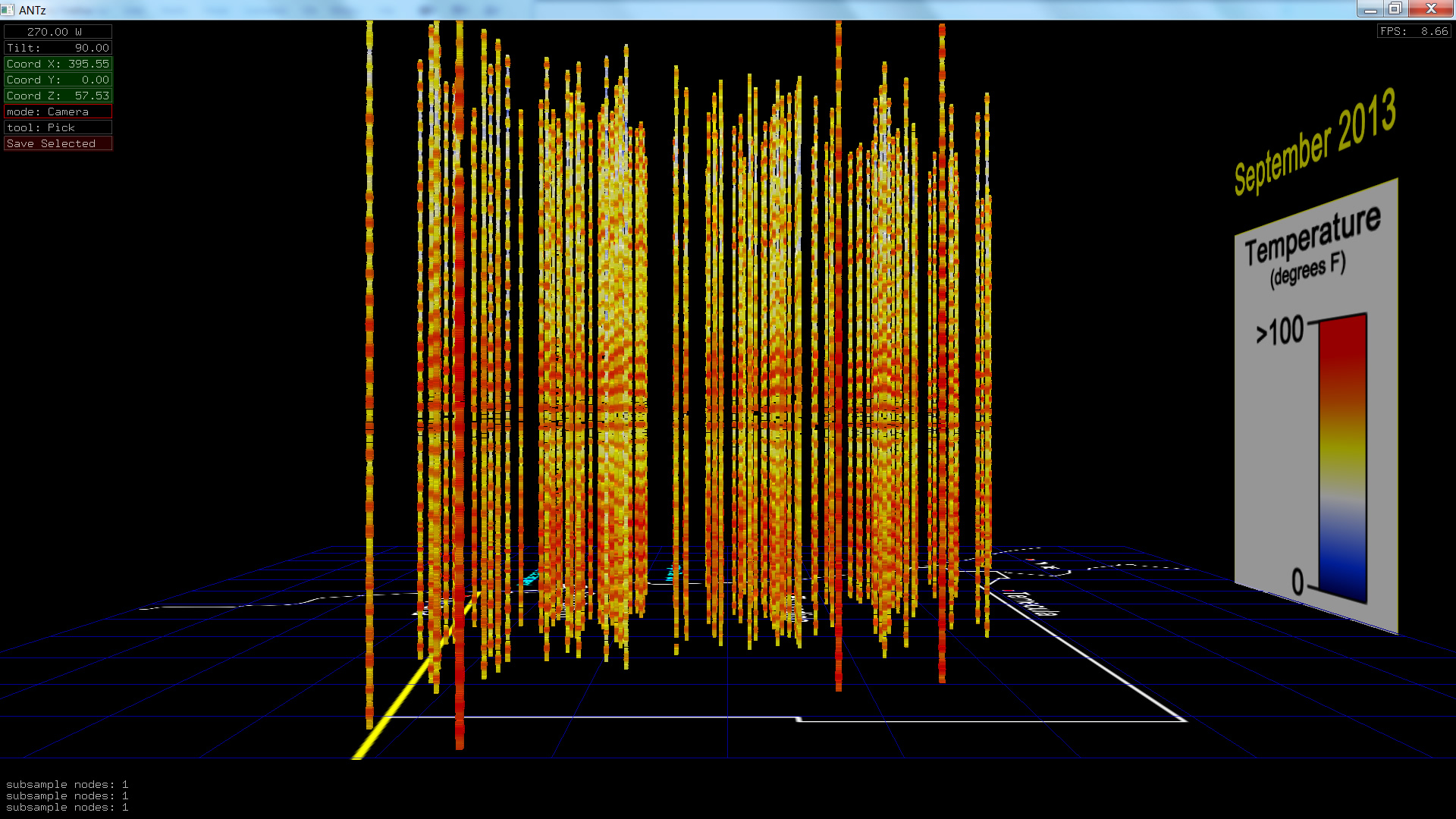 The visualization shown below uses the same data but in a 2D format. ANTz was not used for this visualization.