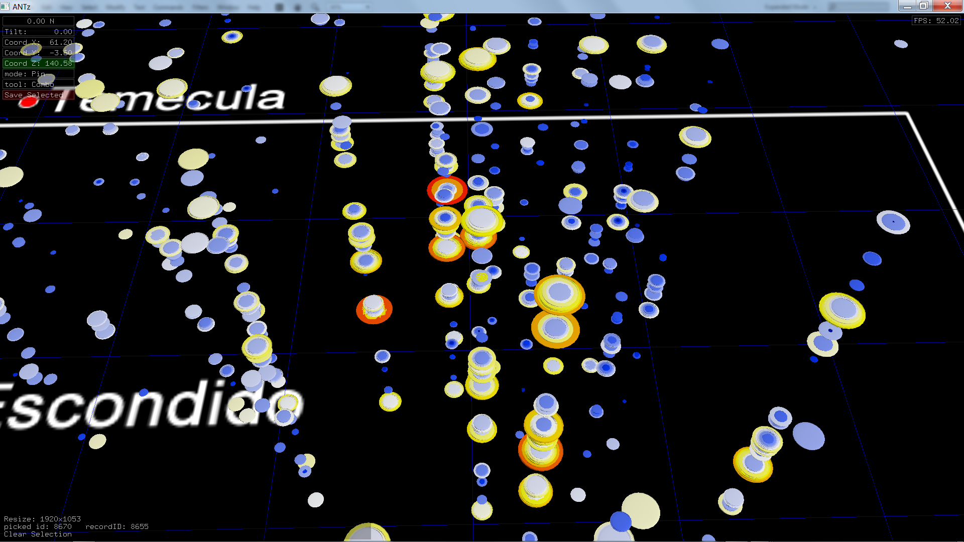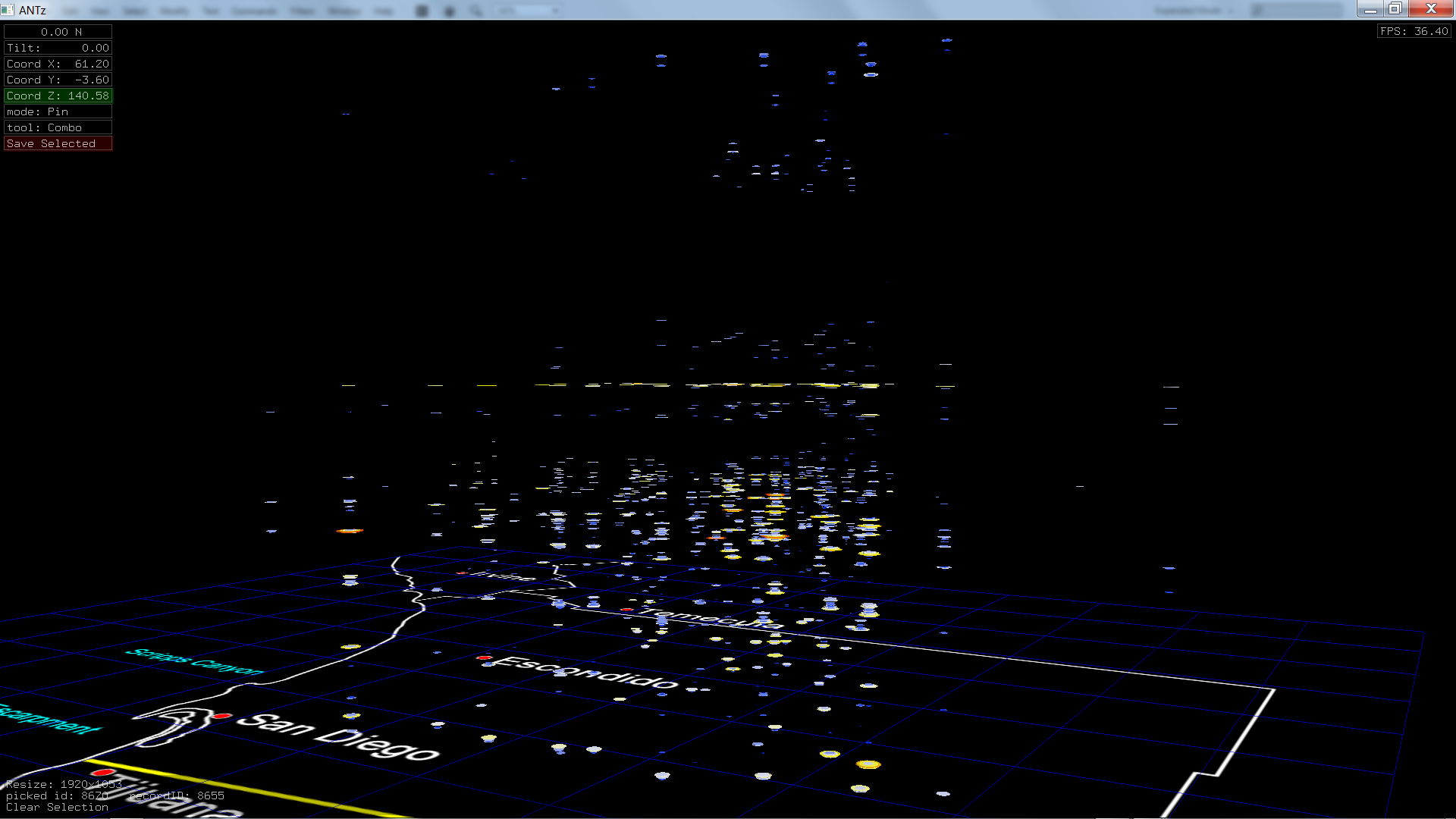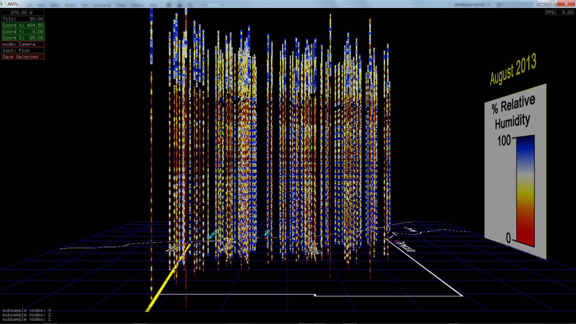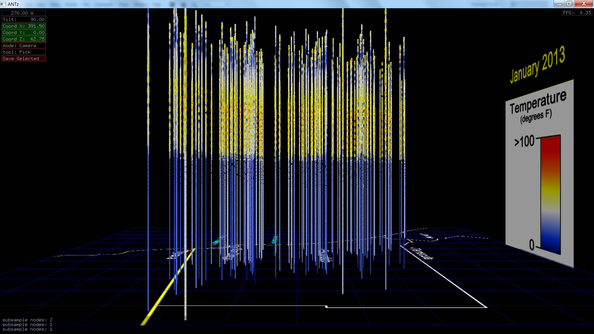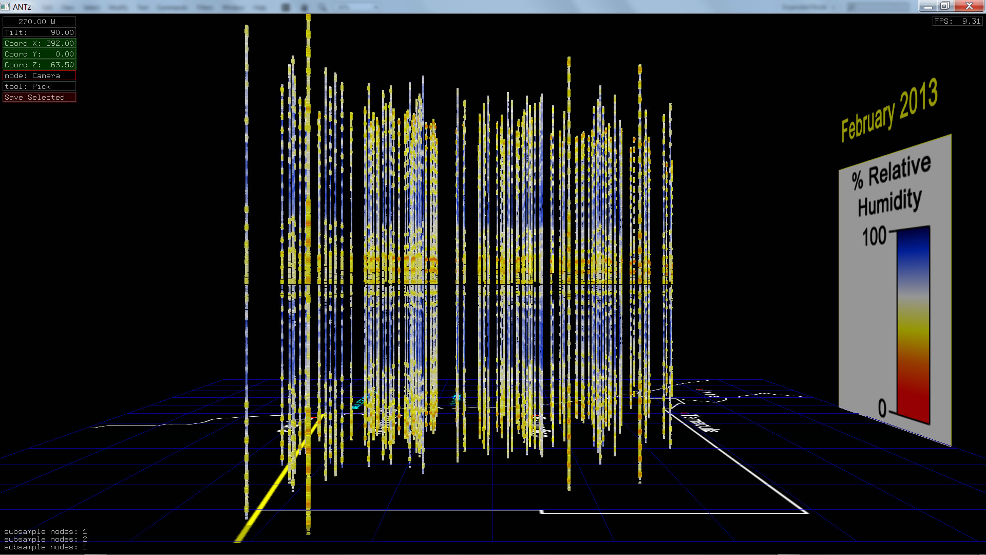 The visualization shown below uses the same data but in a 2D format. ANTz was not used for this visualization.