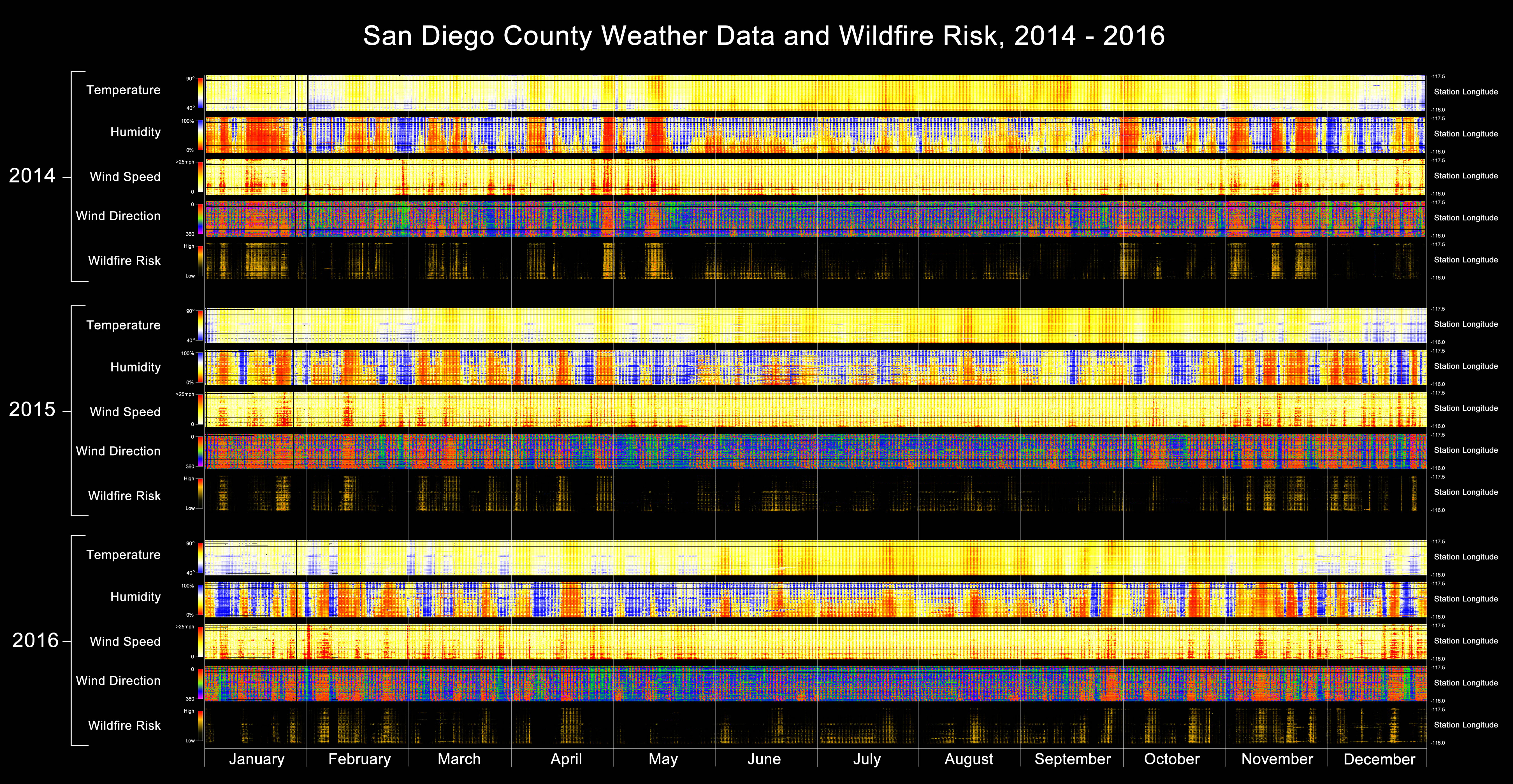 HPWREN has established fire alert thresholds for wind speed and direction and humidity. In this visualization fire alert states for the past year (November 2012 to October 2013) are rendered with color and scale representing the 'severity' of the fire alert status (time is vertical, use the I key for Label information).