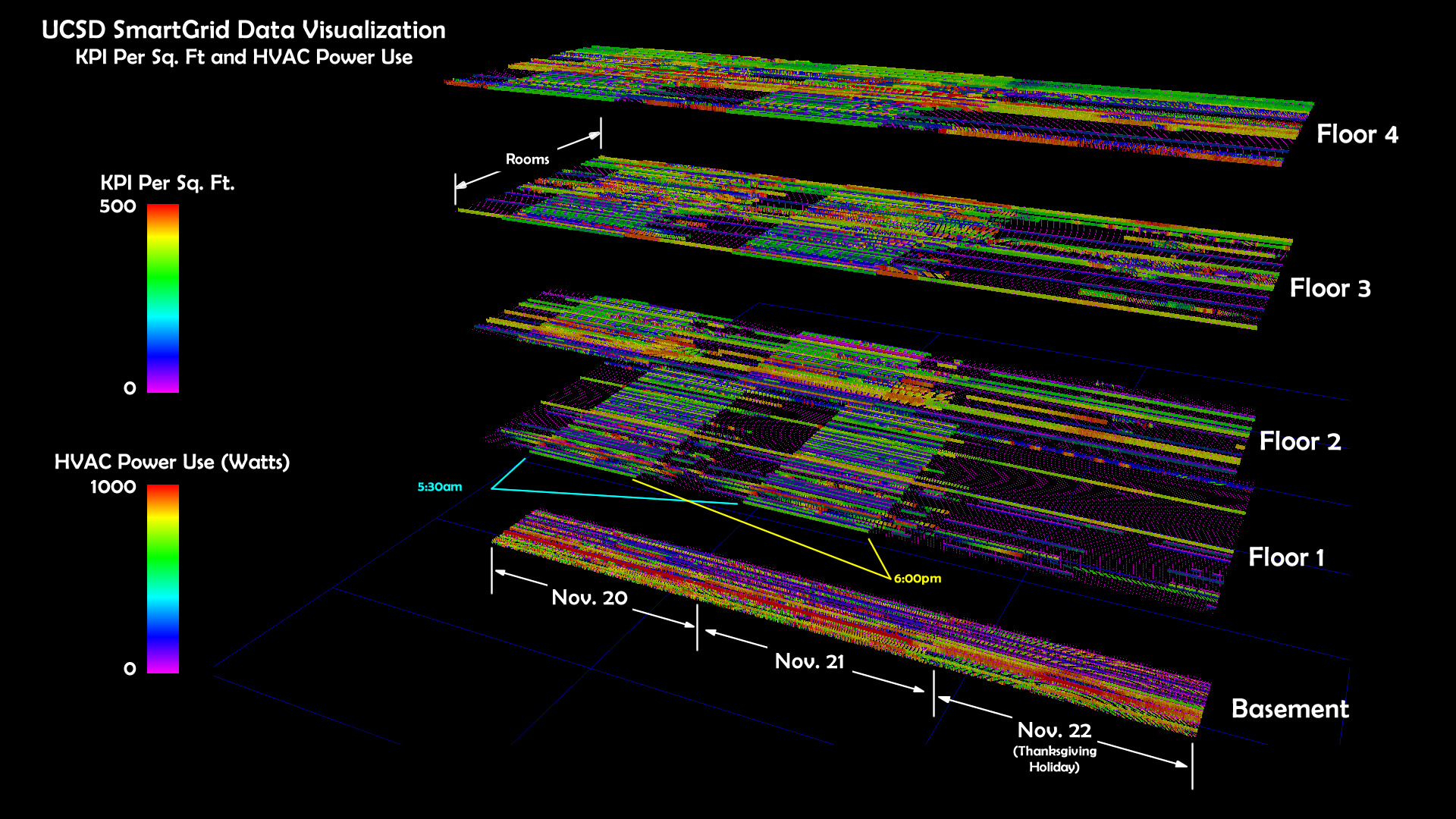 Data is collected every 1 minute. Data includes KPI per sq. ft. and HVAC power use.