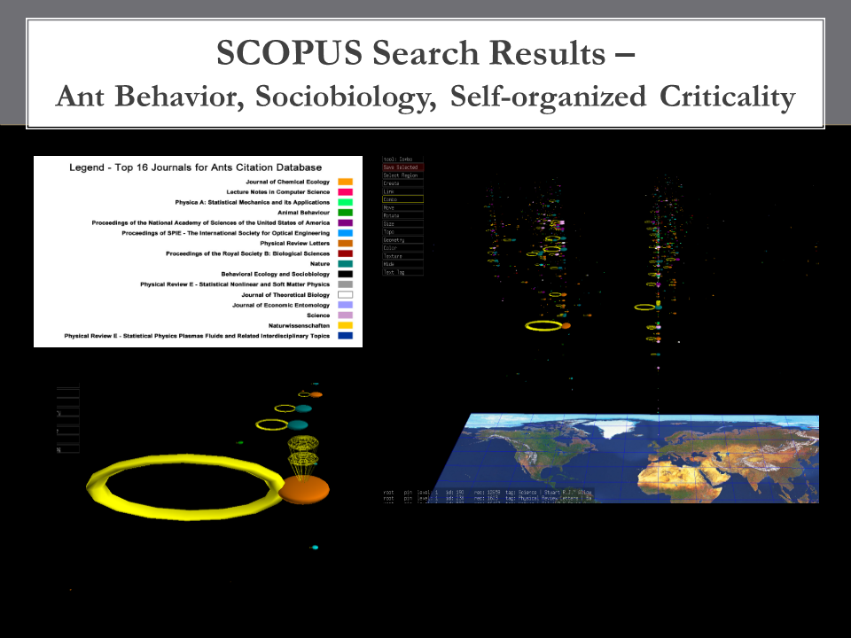 Distribution is one of the most important factors to consider. Matrices and linear arrays are ubiquitous in visualization. Geographical distribution is another common method. Spherical yet another. One of the most enlightening capabilities of ANTz is the ability to cycle through topos to see how conventional distributions such as these might look in other less conventional distributions such as the toroid or the rod.