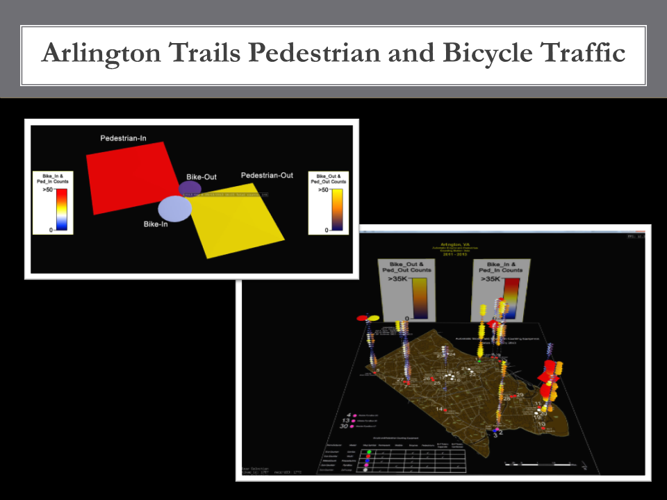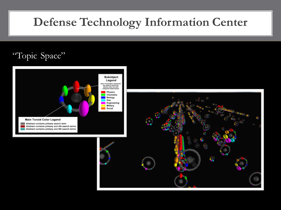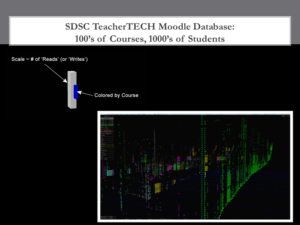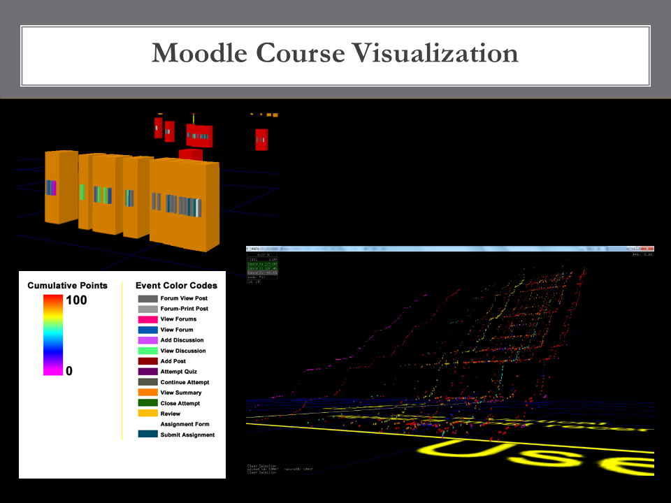 At the same time, the child objects are scaled much smaller and displayed on only one side of the parent object such that they can be viewed only when zoomed in and from the correct direction. These objects can represent each student’s specific activity color coded for each possible type, allowing the user to simultaneously see the larger parent objects, thus still having a sense of overall student performance, but also see thousands of individual events which the students performed and which play out over time and space.
