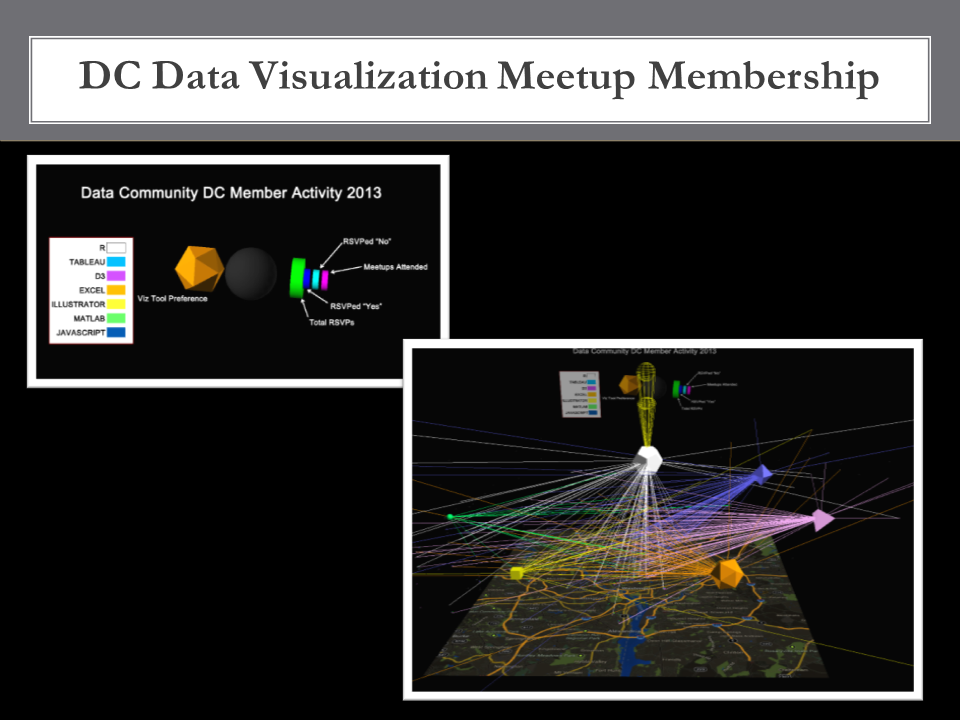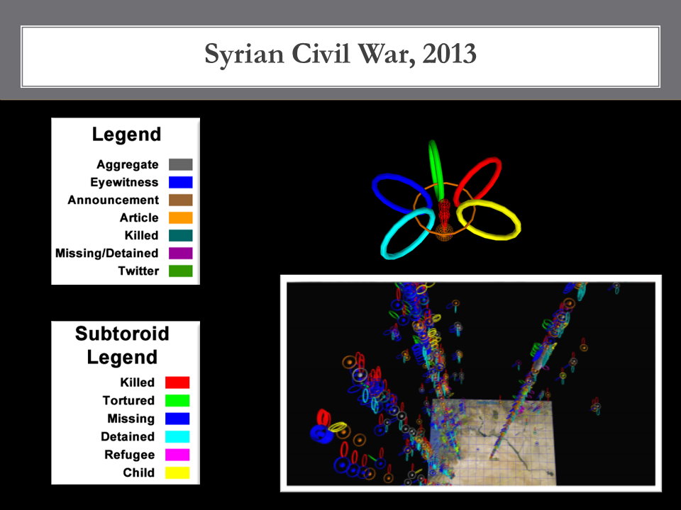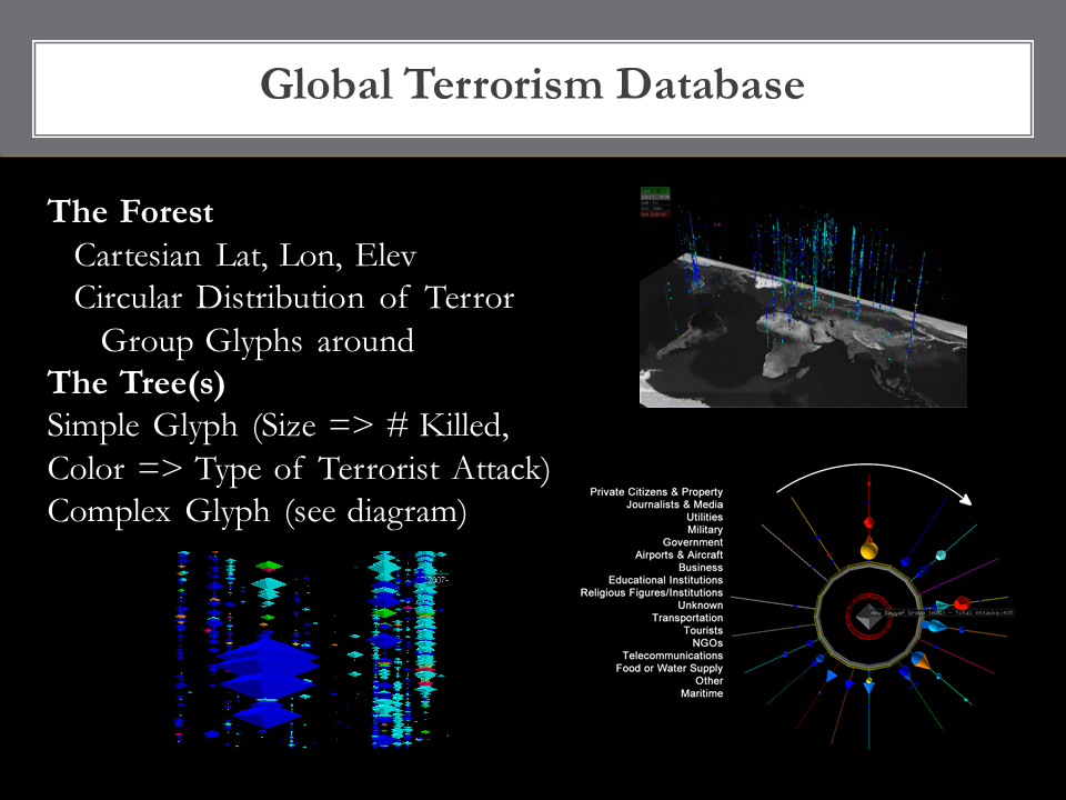 On the other hand, one of my poorer designs resulted from not having such a strong purposeful engagement with the data in order to drive exploration. I had no specific questions, this was purely exploratory, I was just trying to display as much info as possible (I do that alot). The glyph I designed was intended to represent all terrorist activities for a specific terrorist group using data from the Global Terrorism Database (GTD). This glyph does not work for me (or anyone else, so far). When I look at it I do not gain insight as easily as I do with the STAR test data even though the glyph design was of a similar complexity to the STAR test data glyph. There are other issues including choice of parameters, colors, geometries, topos, etc., but these are more symptomatic than causal.