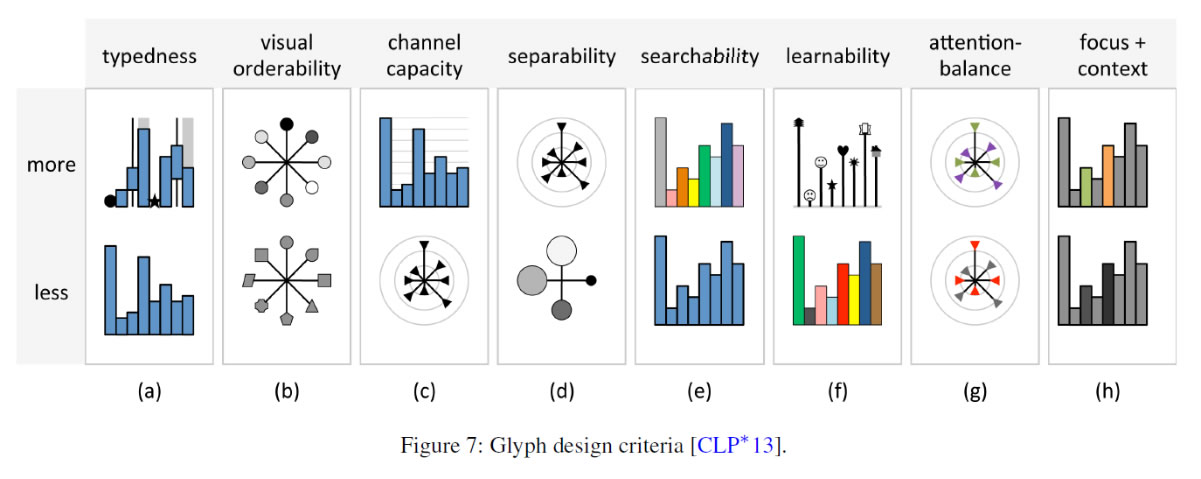 Glyph design should consider the viewer’s point of view. POV issues share some considerations with Alignment and Proximity. When aligned in a linear way, variation across multiple complex glyphs can be more easily observed when the POV allows for a ‘stacked’ distribution in much the same way a bar chart makes it easier to observe variation than text.