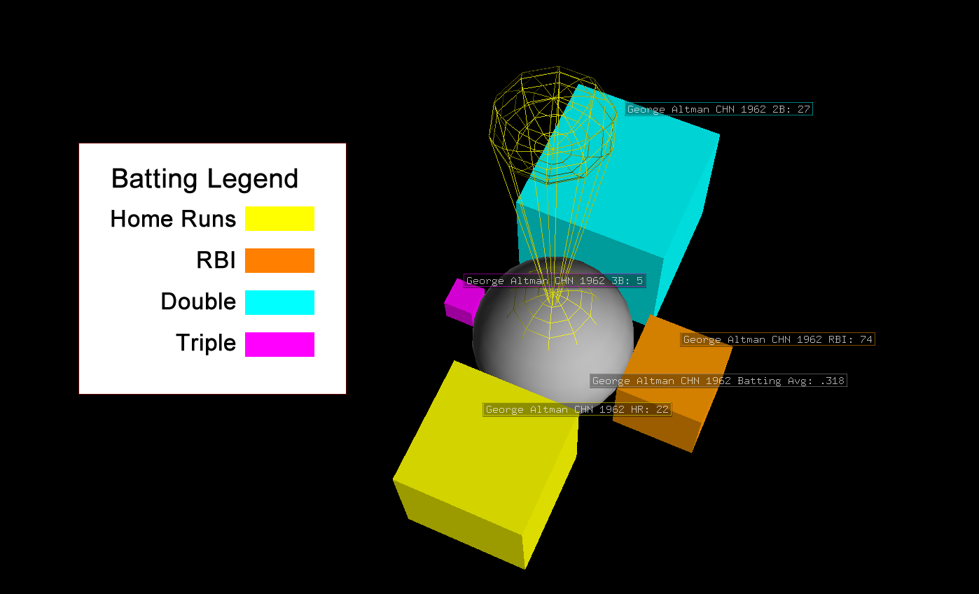 Next, we loop through the branch level 1 geometries. There are four cube geometries color-coded differently and scaled to represent the player's # of doubles, triples, home runs, and runs-batted-in (RBIs). We write this line to the node output file, and we write the relevant tag text to the output tag file. Then we close both files and we have a visualization.