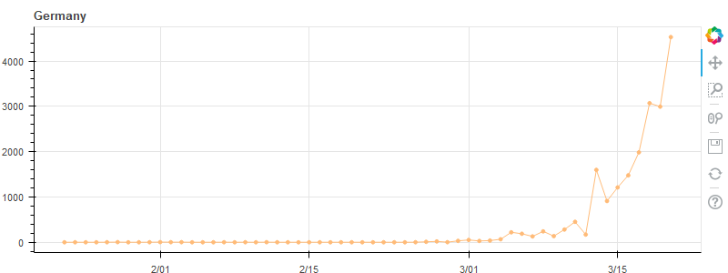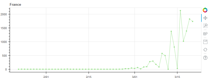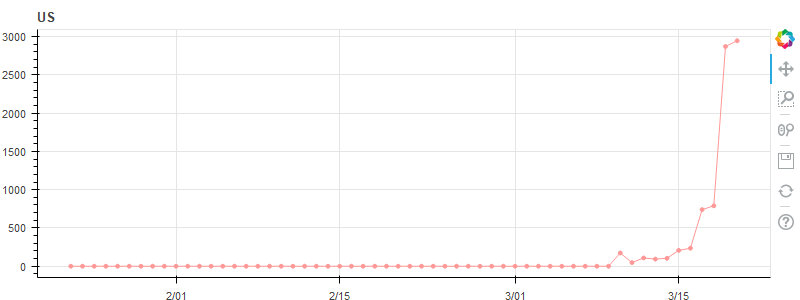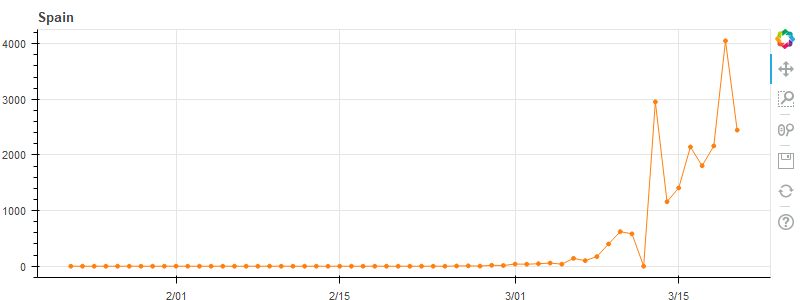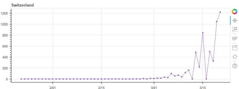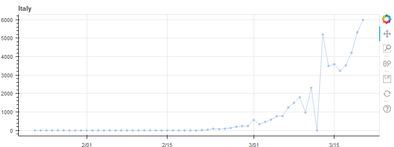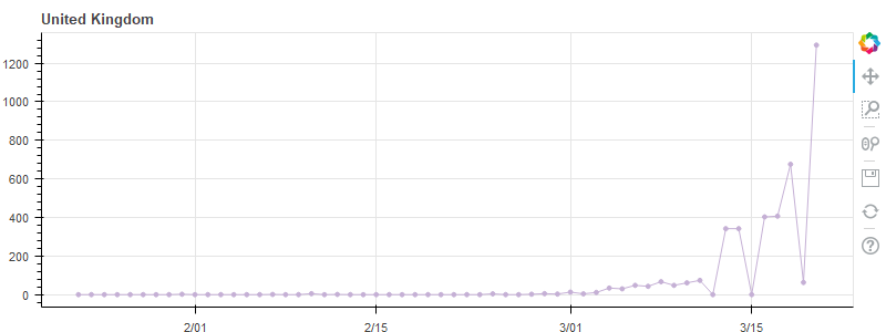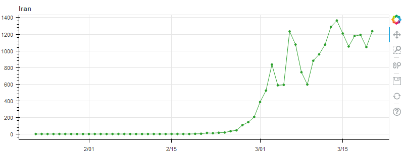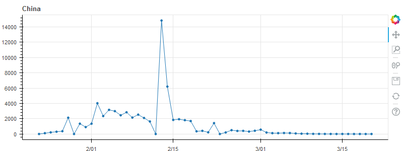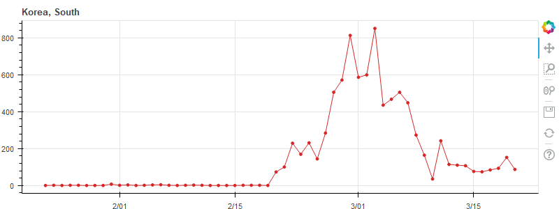 These images are visualizations of COVID-19 new daily cases by country or region as of March 20,2020 created with the Bokeh data visualization app.