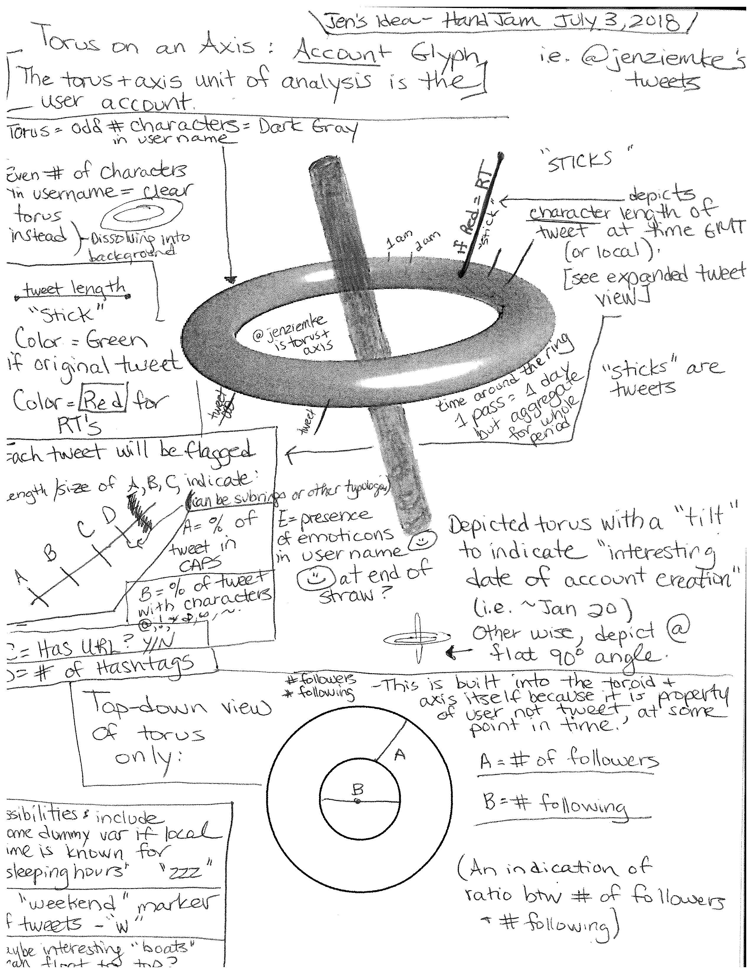 This design was modified to include spokes representing individual tweets. The central axis which was intended to represent user creation date was either replaced by a colored sphere or removed entirely.