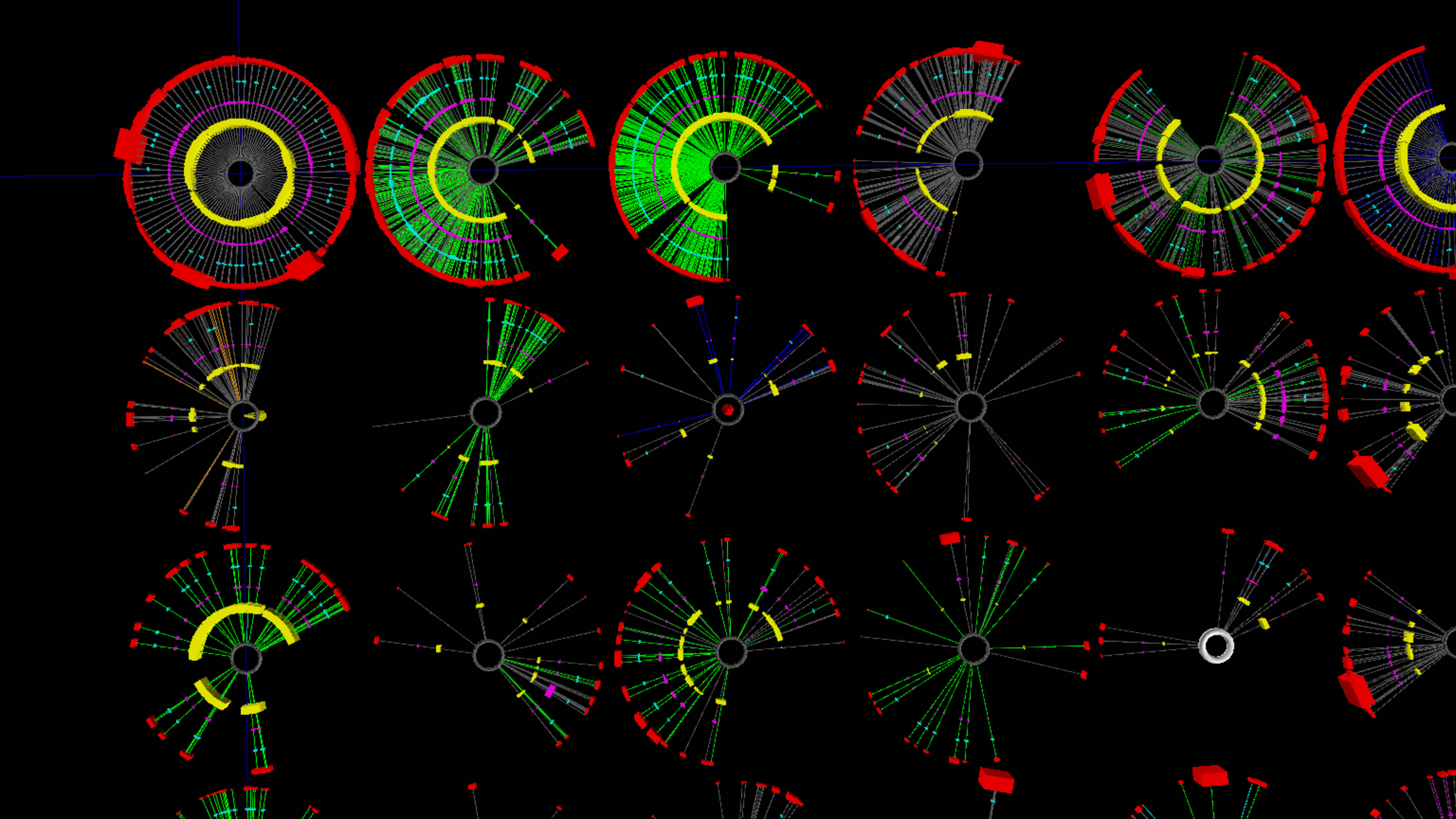 We used this glyph design to visualize the tweet behavior of users who tweeted multiple times in the #trumpcolluded data set. Images below include glyphs for the top 4000 retweeters sorted from left to right and top to bottom.