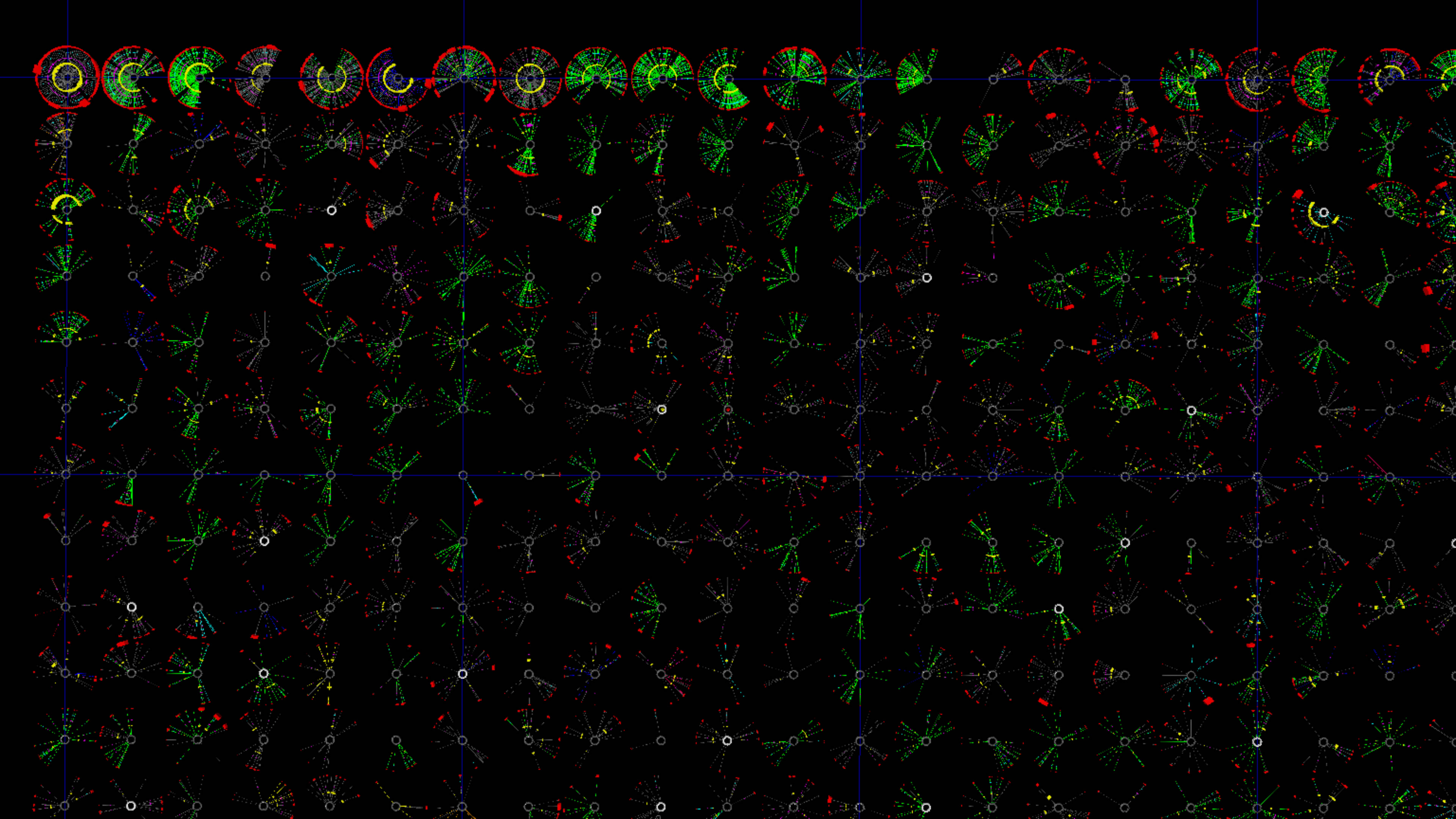 We used this glyph design to visualize the tweet behavior of users who tweeted multiple times in the #trumpcolluded data set. Images below include glyphs for the top 4000 retweeters sorted from left to right and top to bottom.