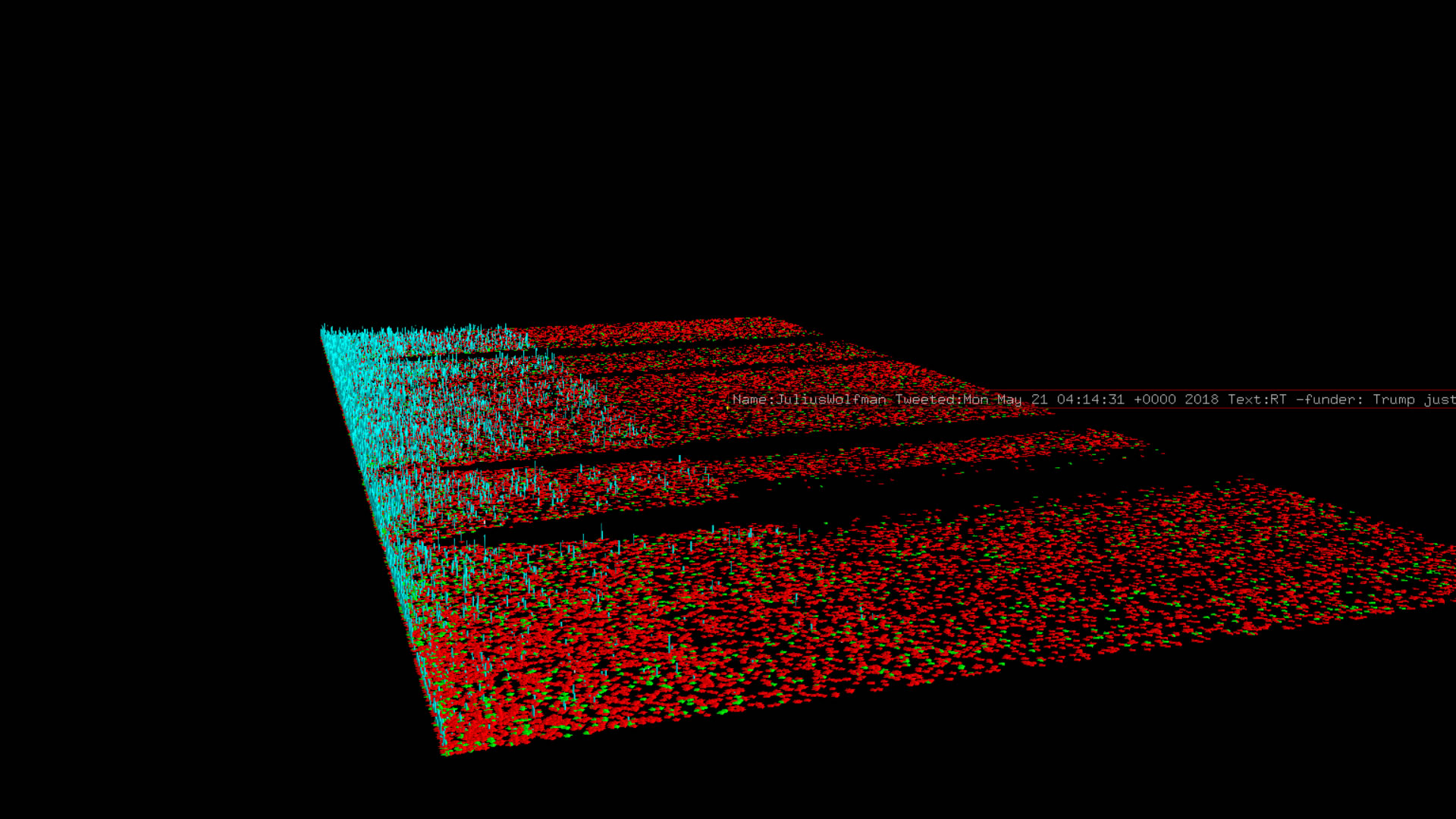 In the below image, geometries are scaled down in size to reduce the 'follower count fuzz" and make tweet bursts more obvious.